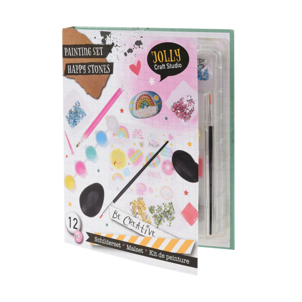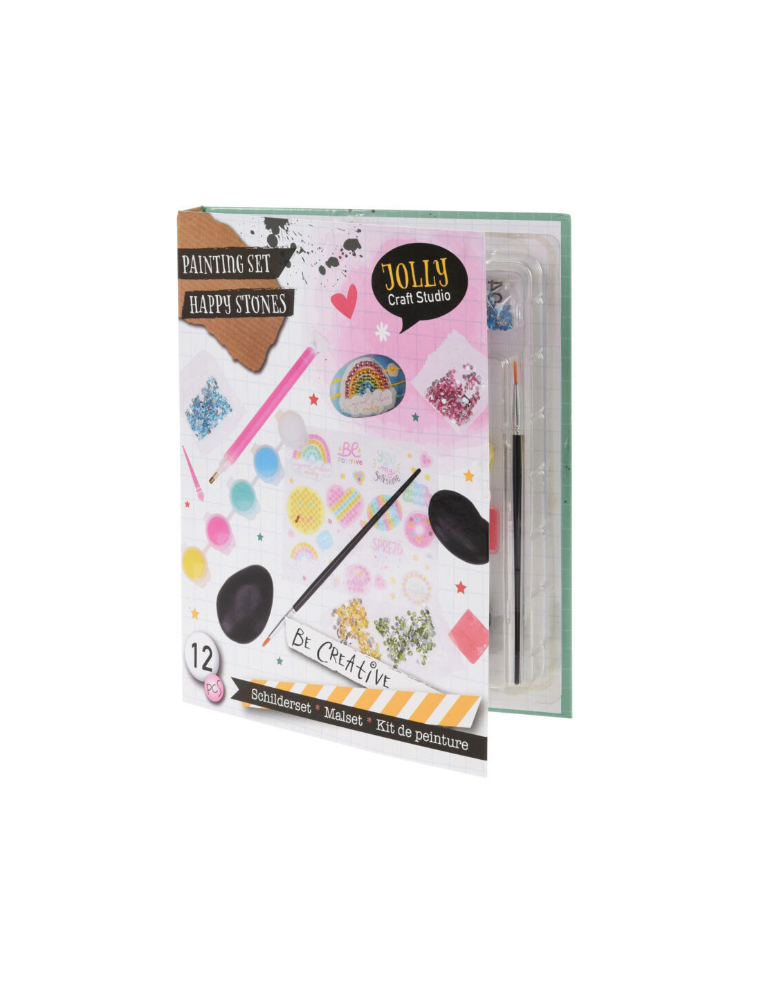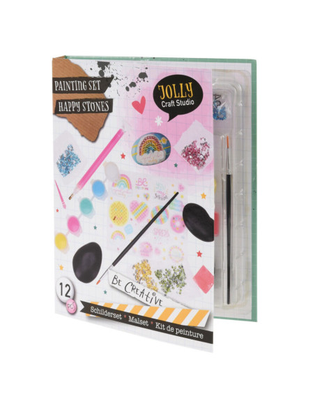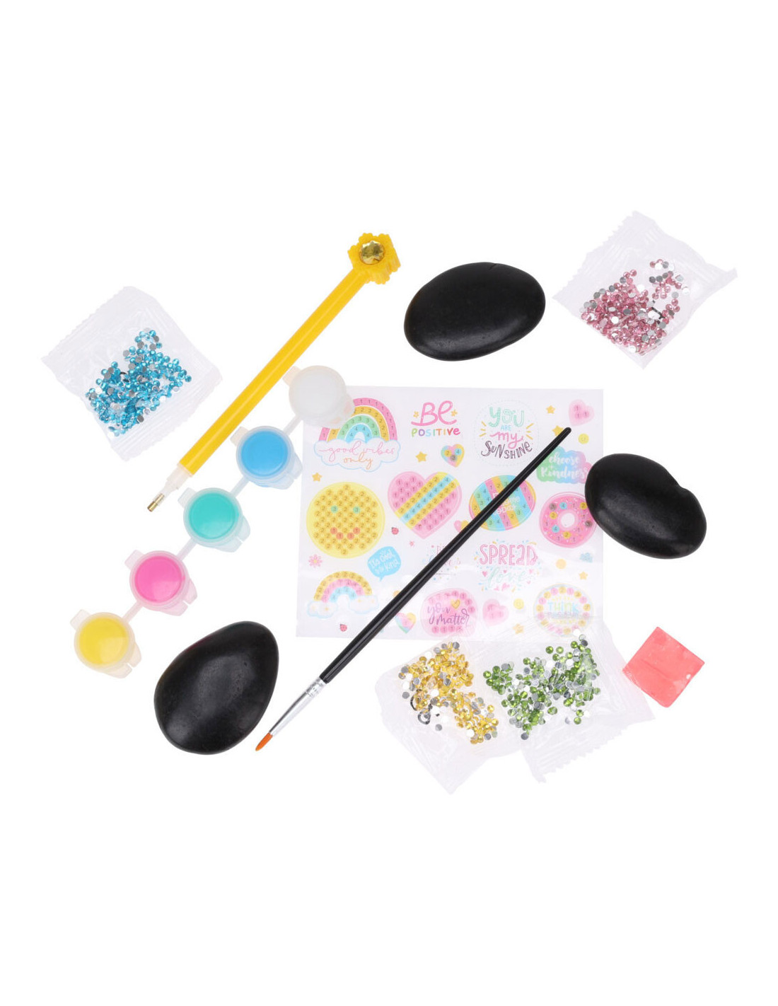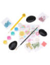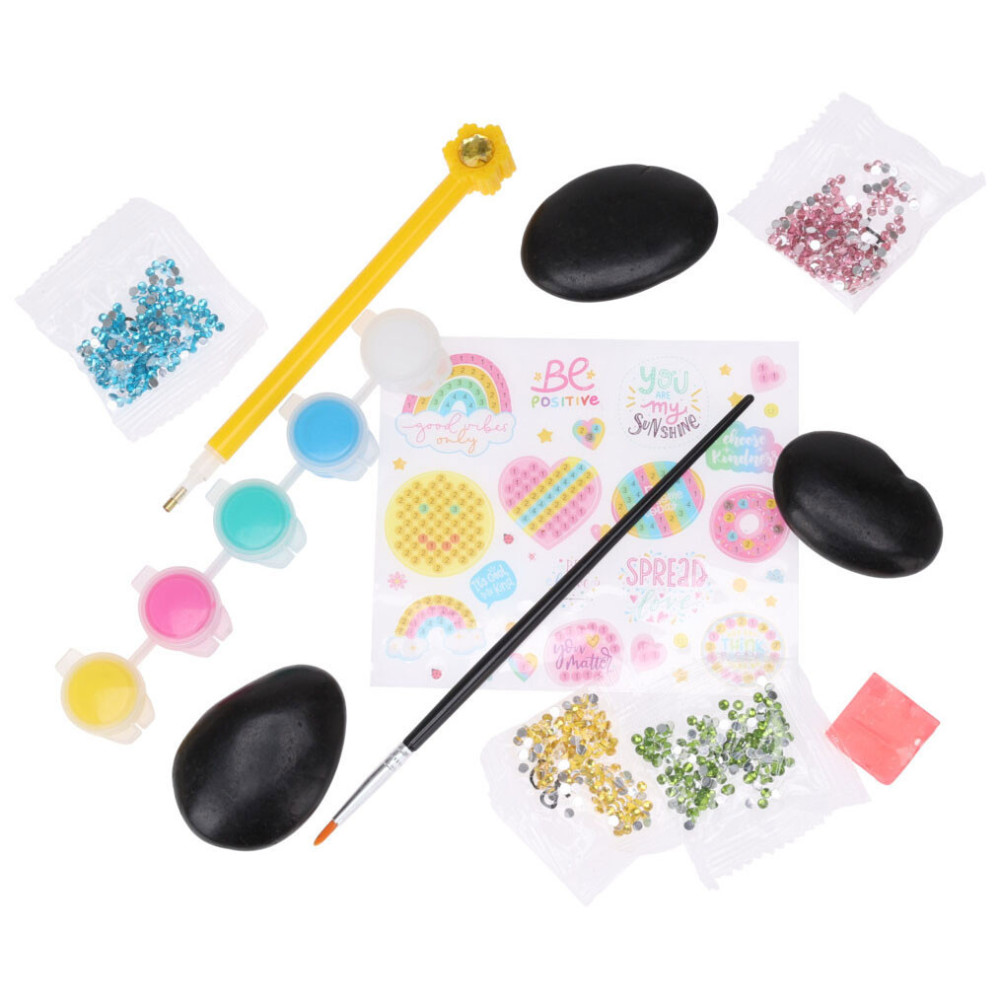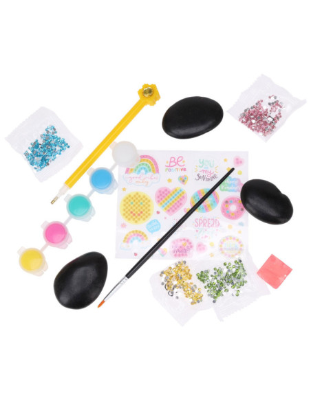 12-delige knutselset voor het versieren van stenen. Inclusief 3 stenen, 5 kleuren verf, penseel en diamond painting-benodigdheden. Adviesleeftijd: 5+