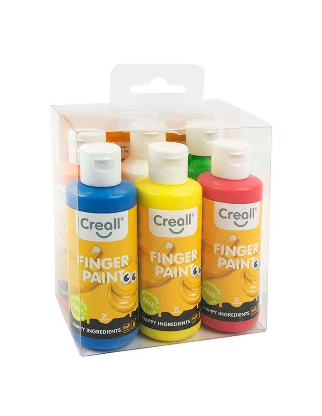Creall vingerverf op waterbasis. 98% natuurlijke grondstoffen, conserveermiddelvrij, droogt mat op en uitwasbaar. Inhoud: 6 x 80 ml.