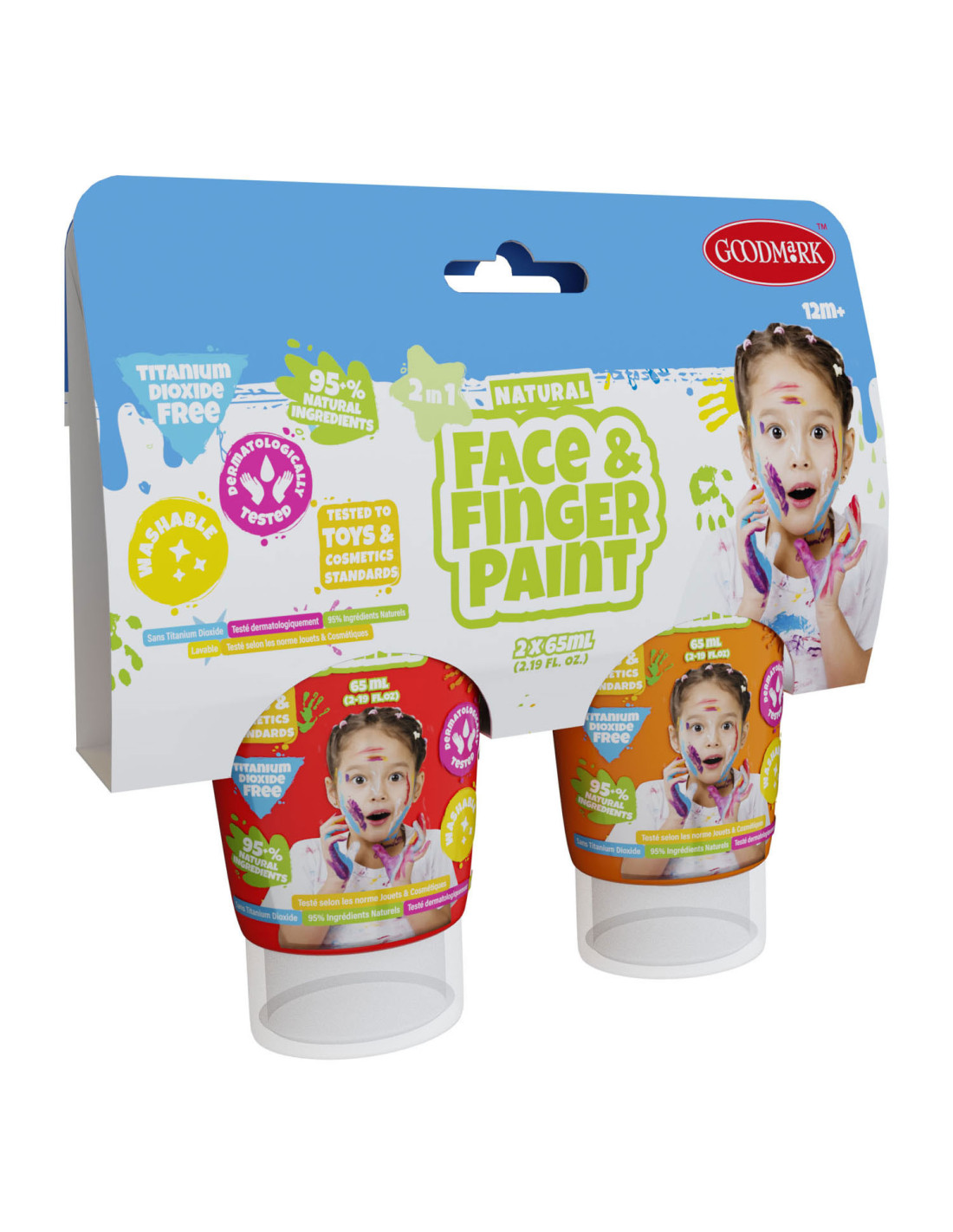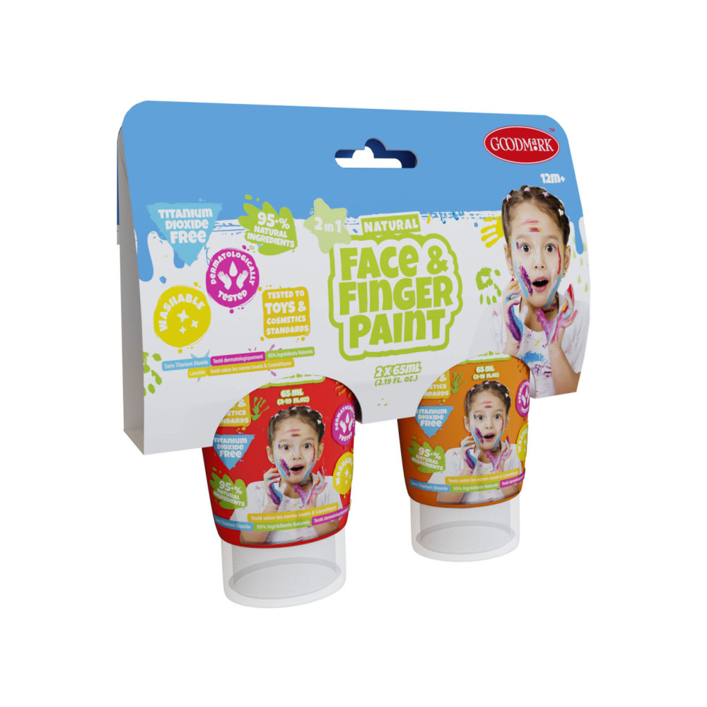 De allereerste 2-in-1 gezicht- en vingerverf voor kinderen is nu gelanceerd! Speel en schilder zoals je wilt, en met de gemakkelijke wasbaarheid is het eenvoudig schoon te maken. ALLE formuleringen zijn getest en veilig volgens speelgoedrichtlijnen en cosmetica-voorschriften, dus geen gevaar wanneer kinderen hun eigen of andermans gezichten insmeren. Deze grappige momenten zijn nu volledig VEILIG! De 2 pack geeft je 2 verschillende kleuren om mee te spelen en verven.