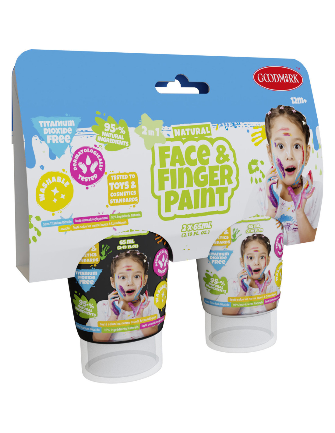 De allereerste 2-in-1 gezicht- en vingerverf voor kinderen is nu gelanceerd! Speel en schilder zoals je wilt, en met de gemakkelijke wasbaarheid is het eenvoudig schoon te maken. ALLE formuleringen zijn getest en veilig volgens speelgoedrichtlijnen en cosmetica-voorschriften, dus geen gevaar wanneer kinderen hun eigen of andermans gezichten insmeren. Deze grappige momenten zijn nu volledig VEILIG! De 2 pack geeft je 2 verschillende kleuren om mee te spelen en verven.