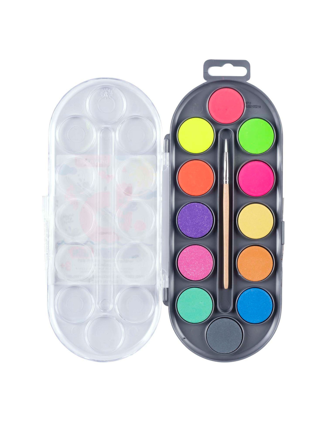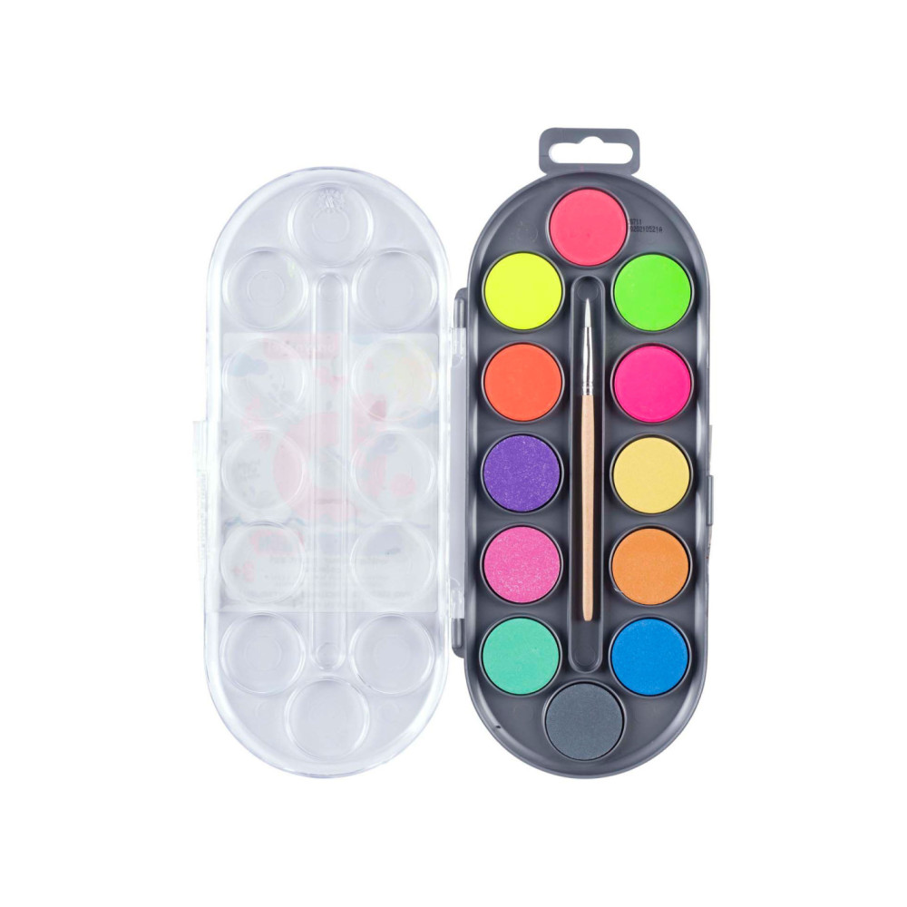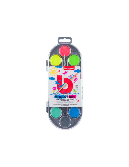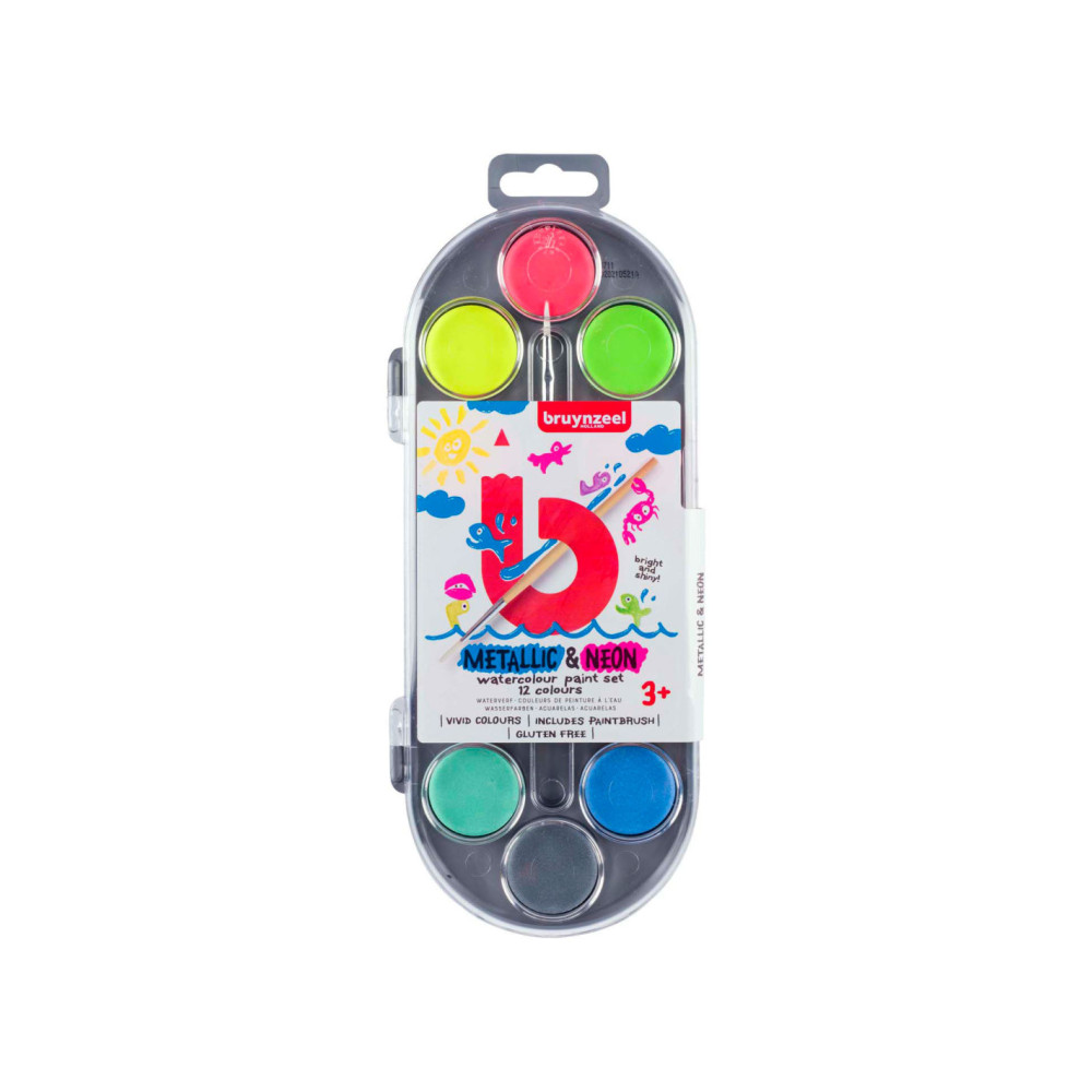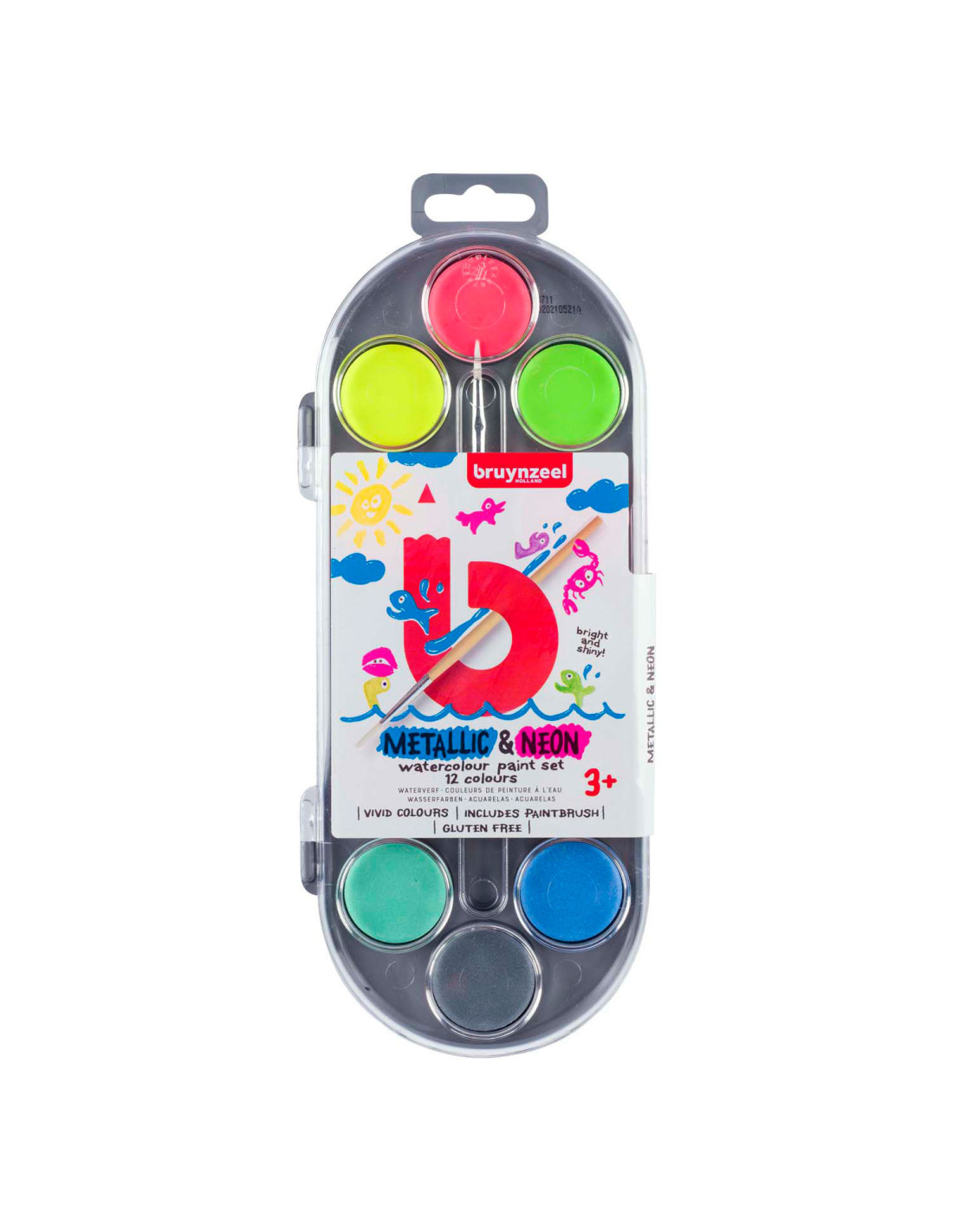 met de waterverf van Bruynzeel kun je gemakkelijk je eigen kunstwerken maken! Deze set bevat 7 metallic en 5 neon waterverfkleuren die goed werken op zowel wit als zwart papier! Het inbegrepen penseel helpt je de heldere kleuren op papier aan te brengen, terwijl het handige doosje de verf beschermt en voorkomt dat de kleuren in elkaar overlopen. De cirkels in het deksel kunnen ook gebruikt worden als mengpallet!