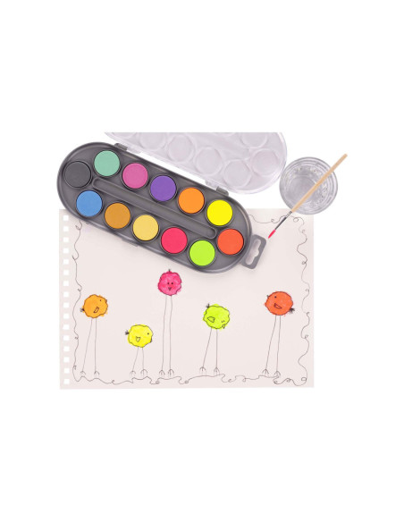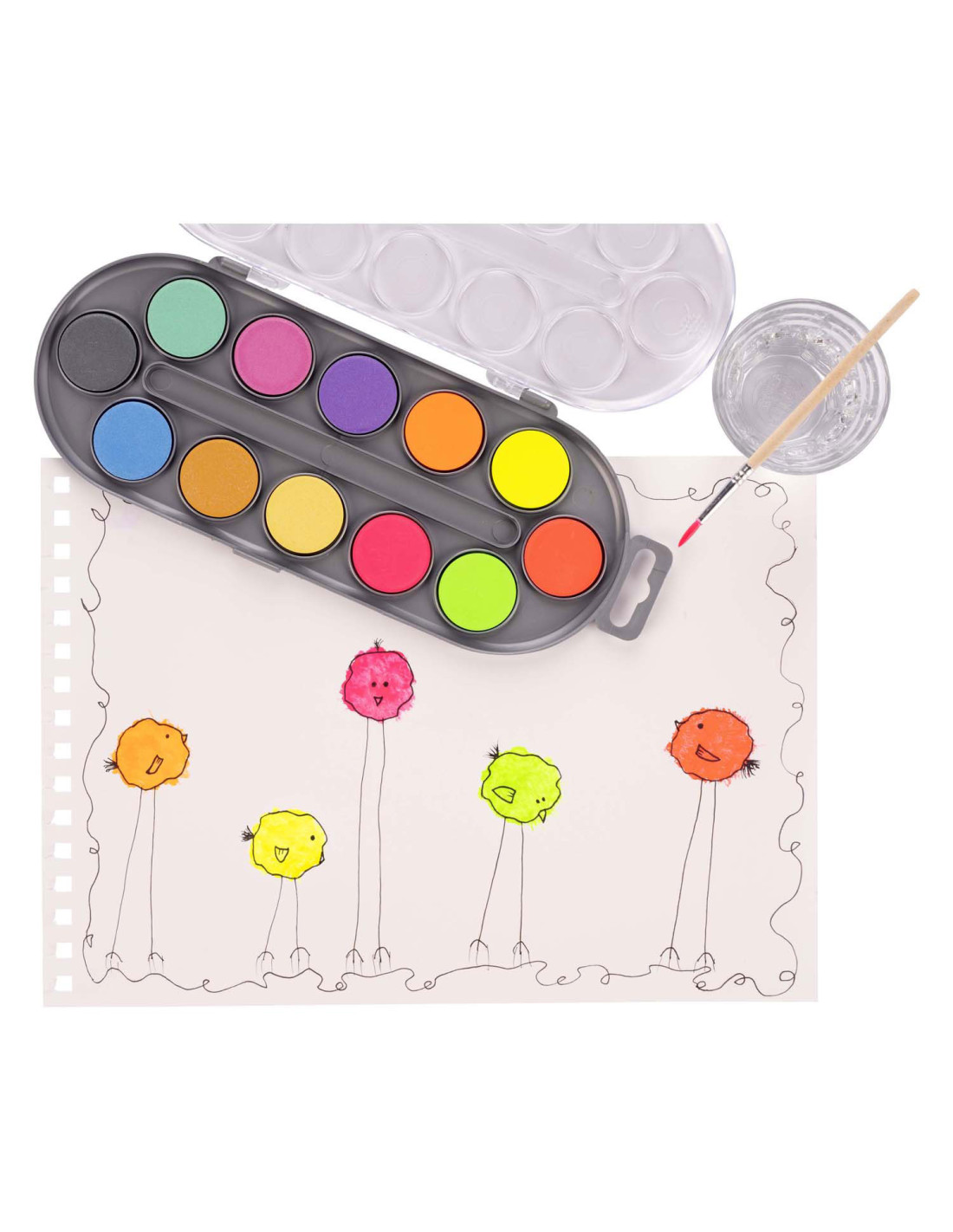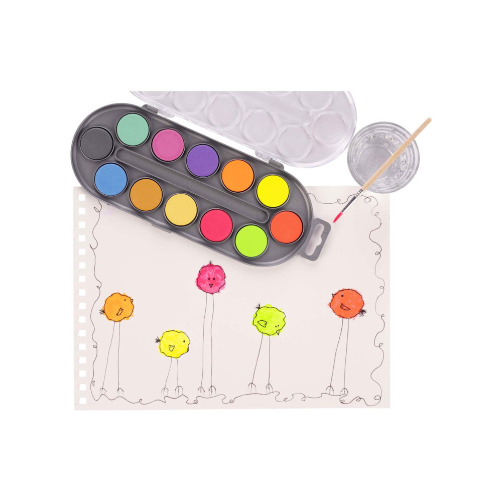 Geschikt voor kinderen vanaf 3 jaar. 12 heldere kleuren. Ideaal voor beginnende kunstenaars. Kleuren zijn makkelijk met elkaar te vermengen met gebruik van water. Glutenvrij.