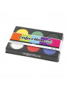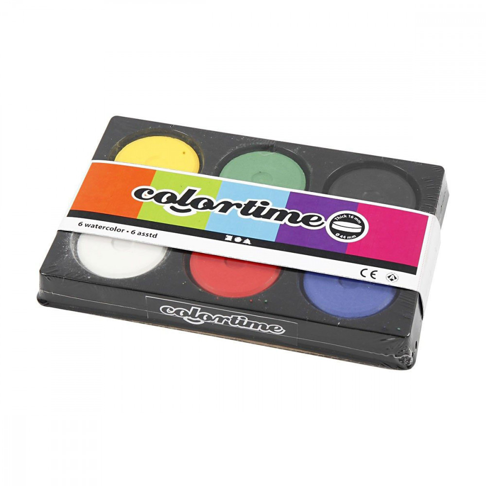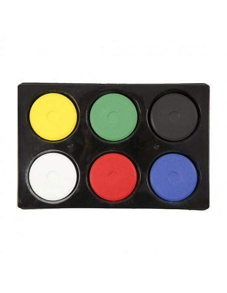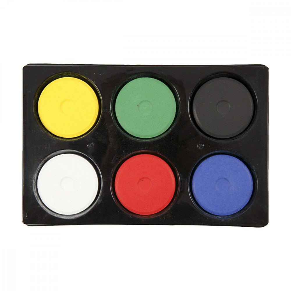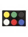 Kunststof palet met 6 vakken inclusief solide navulblokken van dekkende kleuren tempera waterverf - kleuren zijn onderling te mengen. Kwasten na gebruik schoonmaken met water. Afmeting: Ø 57 mm, hoogte 19 mm.