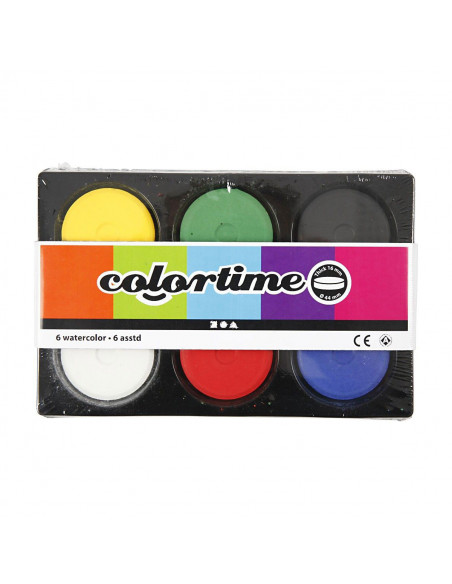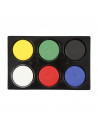Kunststof palet met 6 vakken inclusief solide navulblokken van dekkende kleuren tempera waterverf - kleuren zijn onderling te mengen. Kwasten na gebruik schoonmaken met water. Afmeting: Ø 44 mm, hoogte 16 mm.