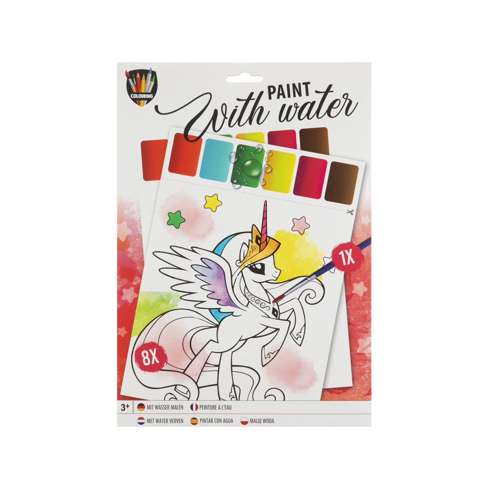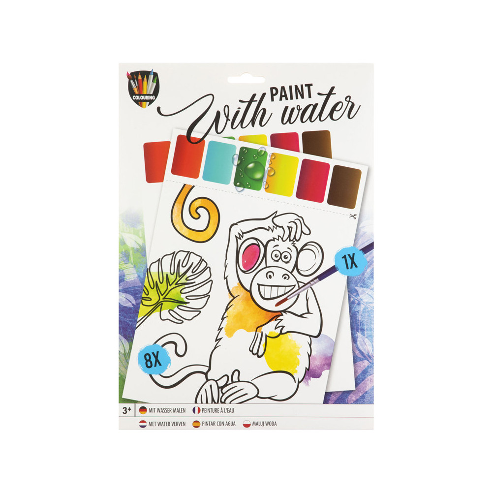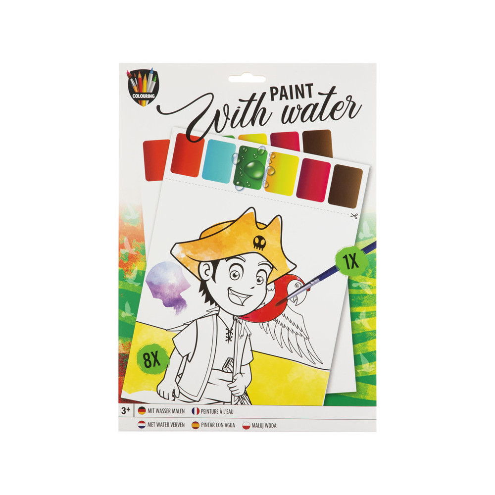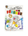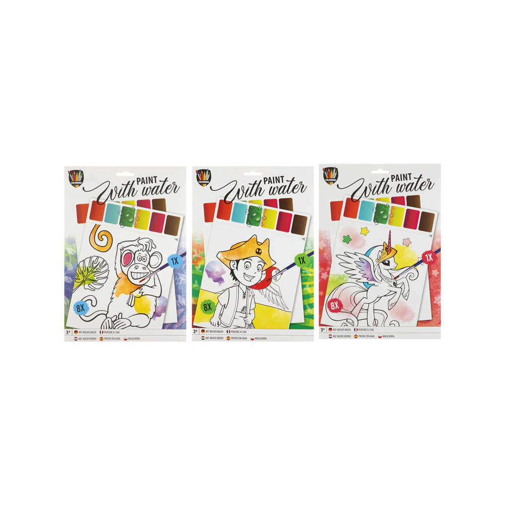 Kleurplaten met een verf strook en penseel. Wanneer je het penseel nat maakt en over de kleuren strijkt, ontstaat er waterverf waarmee geverfd kan worden. De verfset is geschikt voor kinderen vanaf 3 jaar.
