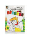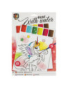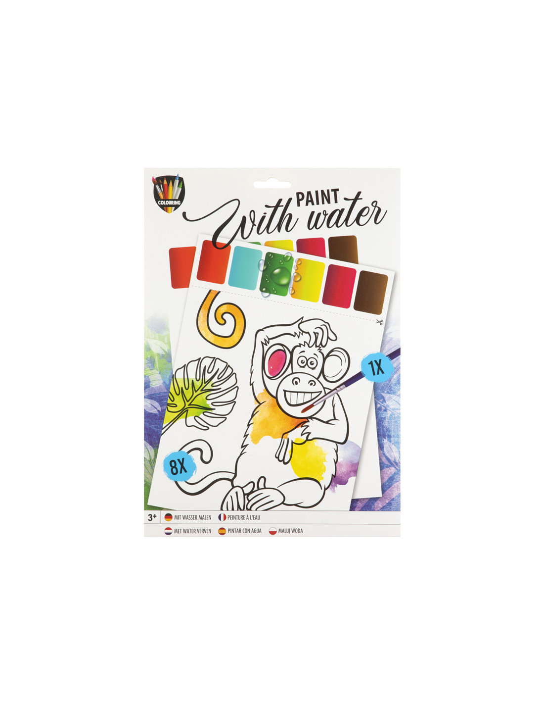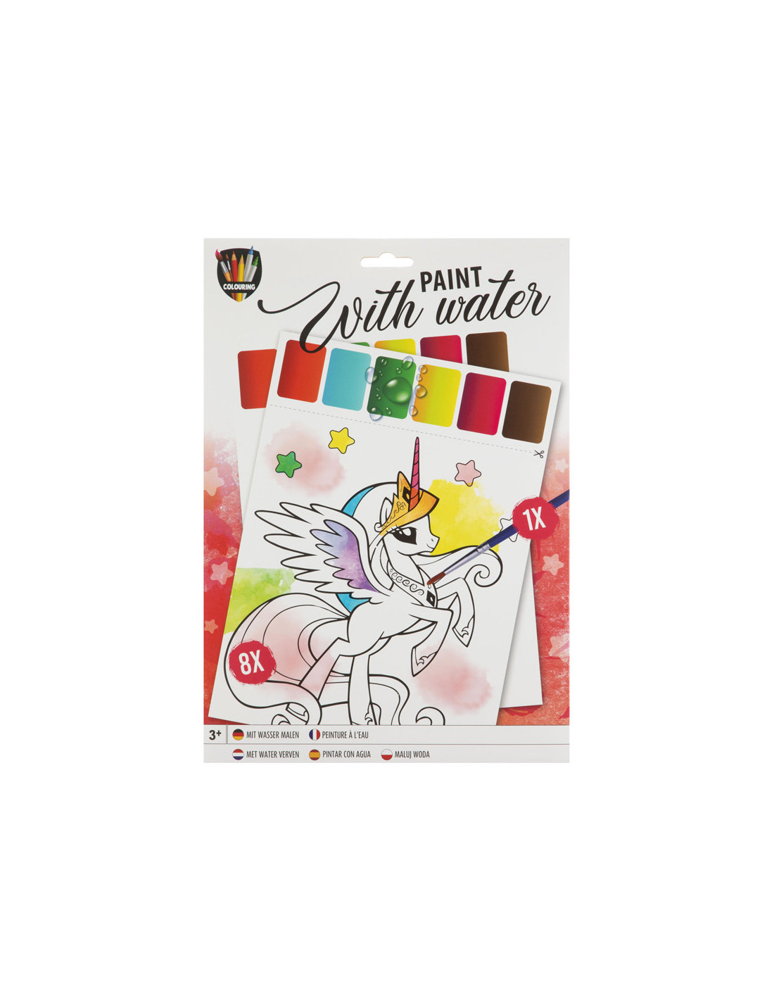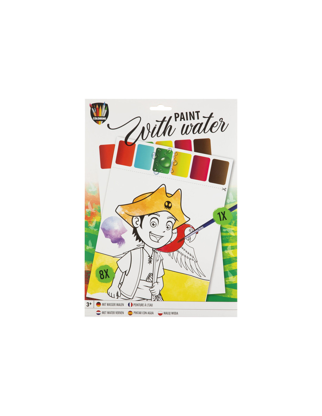 Kleurplaten met een verf strook en penseel. Wanneer je het penseel nat maakt en over de kleuren strijkt, ontstaat er waterverf waarmee geverfd kan worden. De verfset is geschikt voor kinderen vanaf 3 jaar.