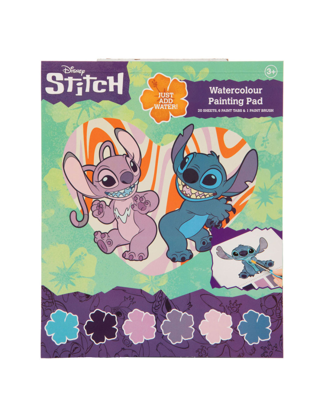 Waterverf kleurboek met 20 vellen Stitch-kleurplaten, allemaal met een eigen strook waterverfkleuren om los te weken met water. Inclusief kwast. Geschikt voor kinderen van 3 jaar en ouder.