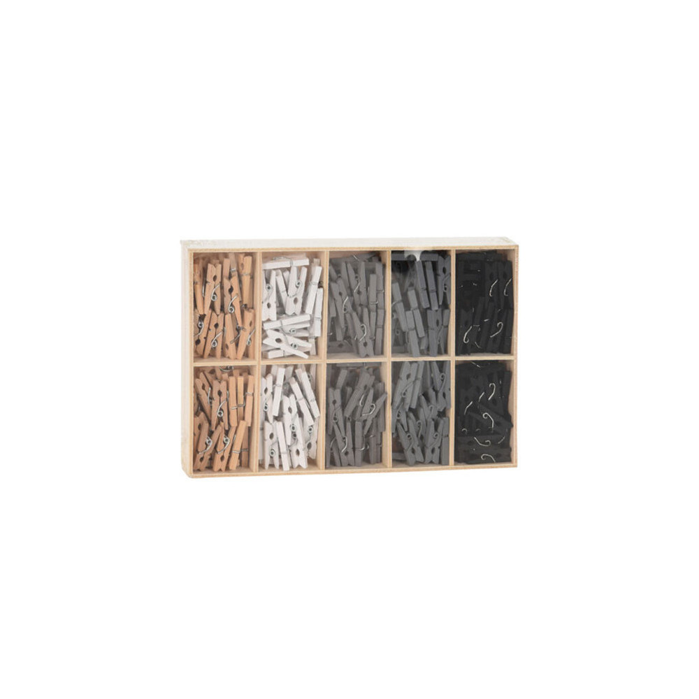 Houten bak met 5 verschillende kleuren mini wasknijpers van hout (blanco, wit, grijstinten en zwart). Geschikt om mee te knutselen. Adviesleeftijd: 3+