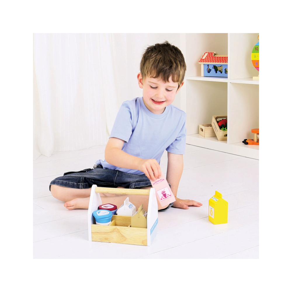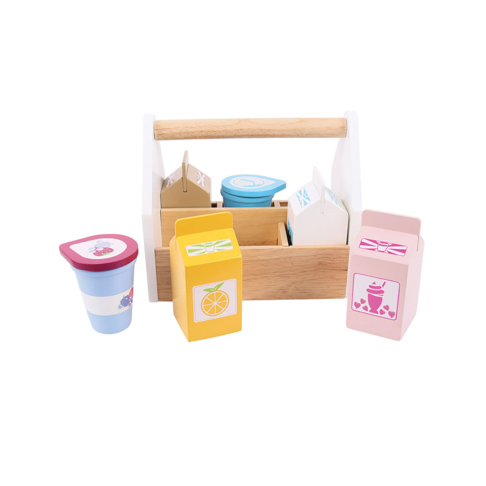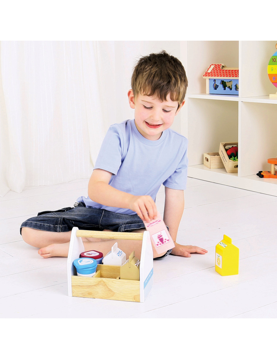 Het is tijd om te winkelen! Welke boodschappen ga jij allemaal kopen? In deze stevige houten kist kun je zes producten mee nemen. In deze set zitten een pak melk, een pak sinaasappelsap, aardbeiendrink, chocolademelk, een pot yoghurt en een beker crème. Leuk voor het spelen met een winkeltje of een keukentje.