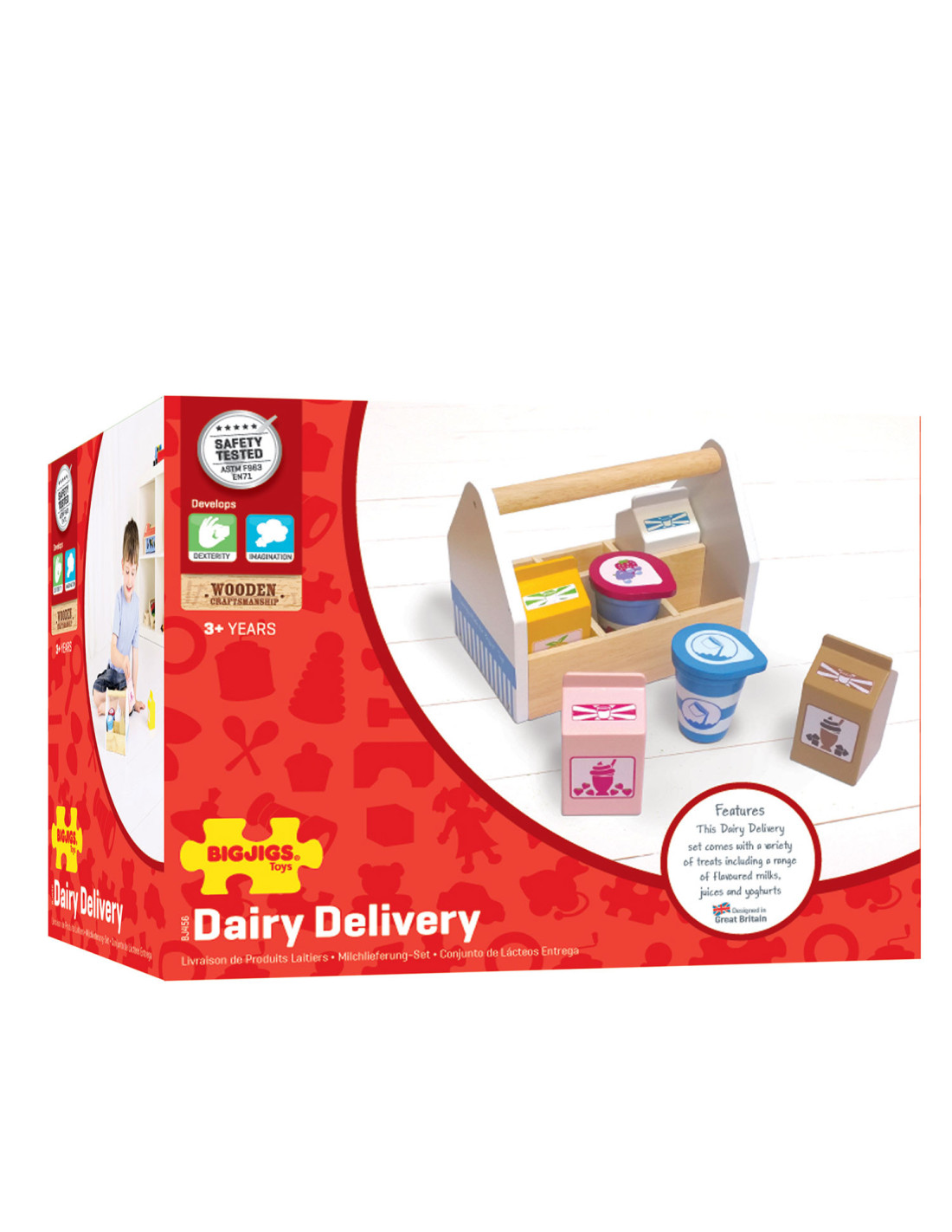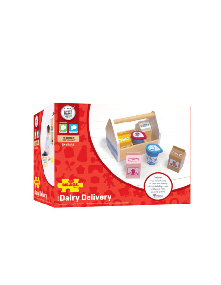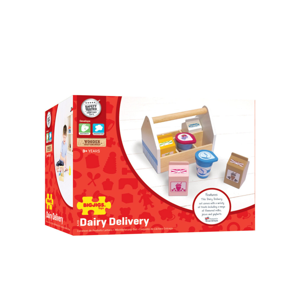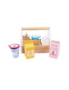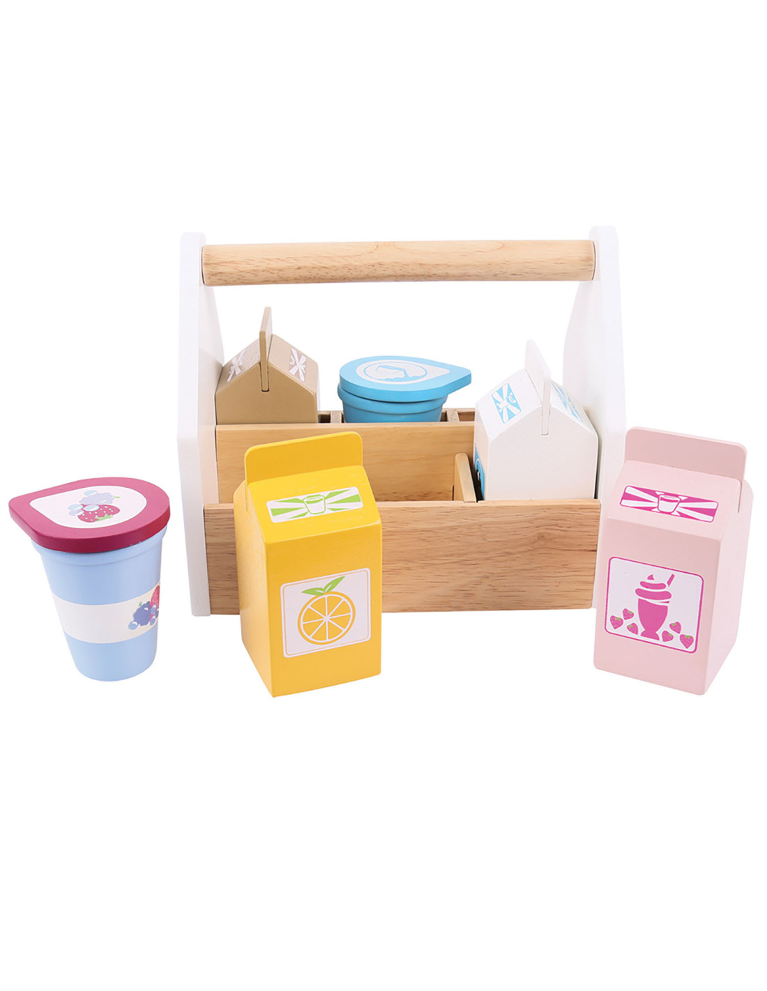 Het is tijd om te winkelen! Welke boodschappen ga jij allemaal kopen? In deze stevige houten kist kun je zes producten mee nemen. In deze set zitten een pak melk, een pak sinaasappelsap, aardbeiendrink, chocolademelk, een pot yoghurt en een beker crème. Leuk voor het spelen met een winkeltje of een keukentje.
