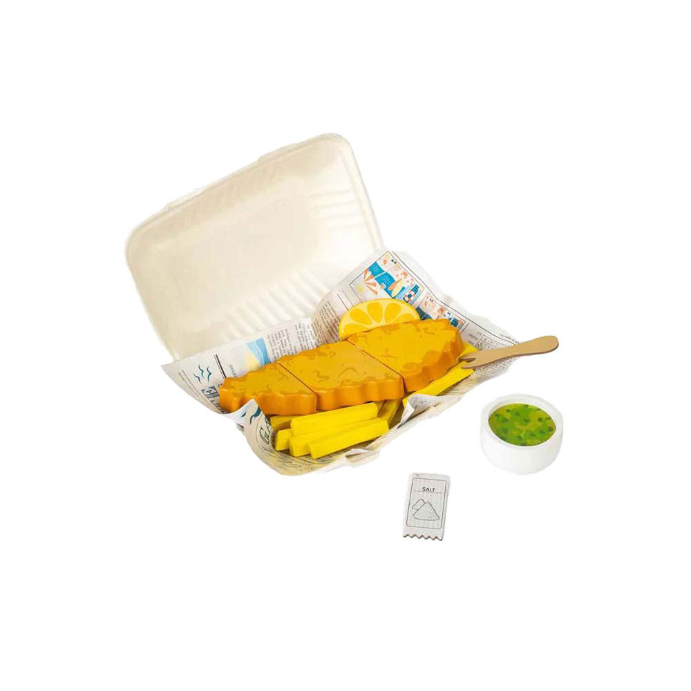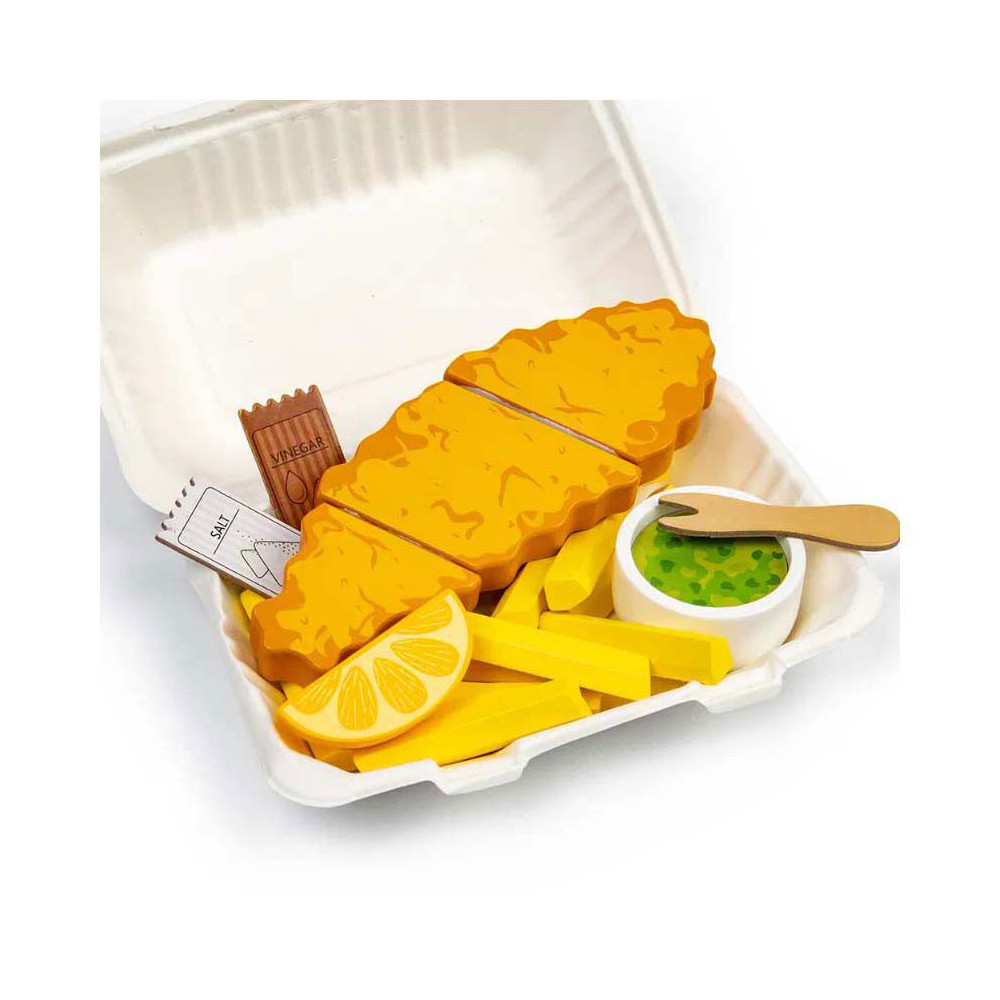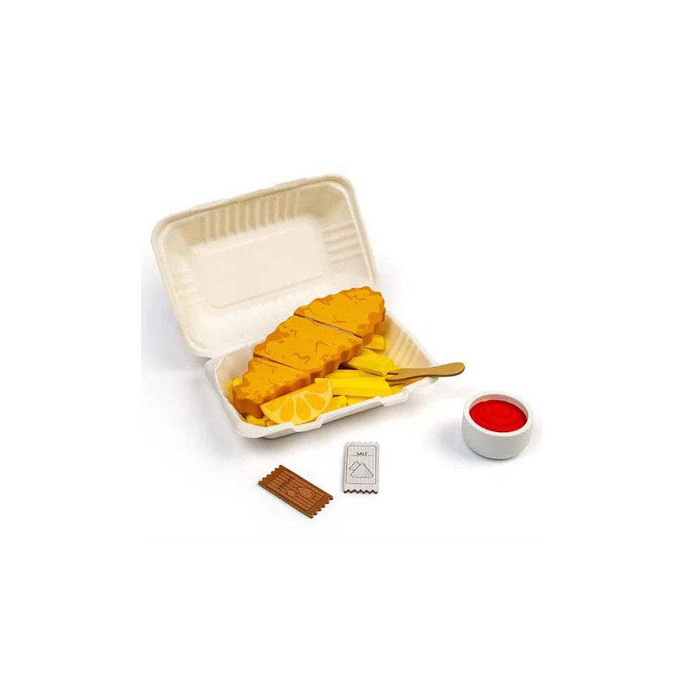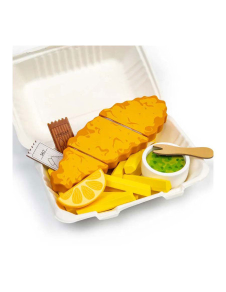 Geniet van knapperige kabeljauw en chips met onze Fish and Chips houten speelvoedselset, geserveerd op een spread van de Gull Gazette! Deze interactieve krant bevat speelse verhalen en activiteiten om een extra element aan de speeltijd toe te voegen. De set wordt ook geleverd met een kom met mushy peas, een partje citroen, een zoutzakje en een afhaaldoos, en de kabeljauw is verdeeld in drie stukken zodat kinderen hem kunnen snijden met de houten chipvork.