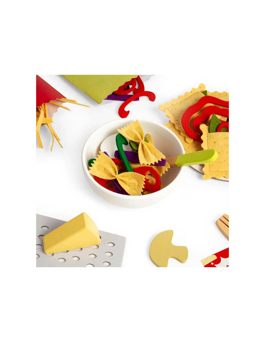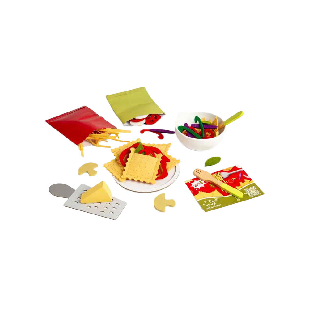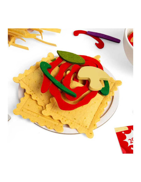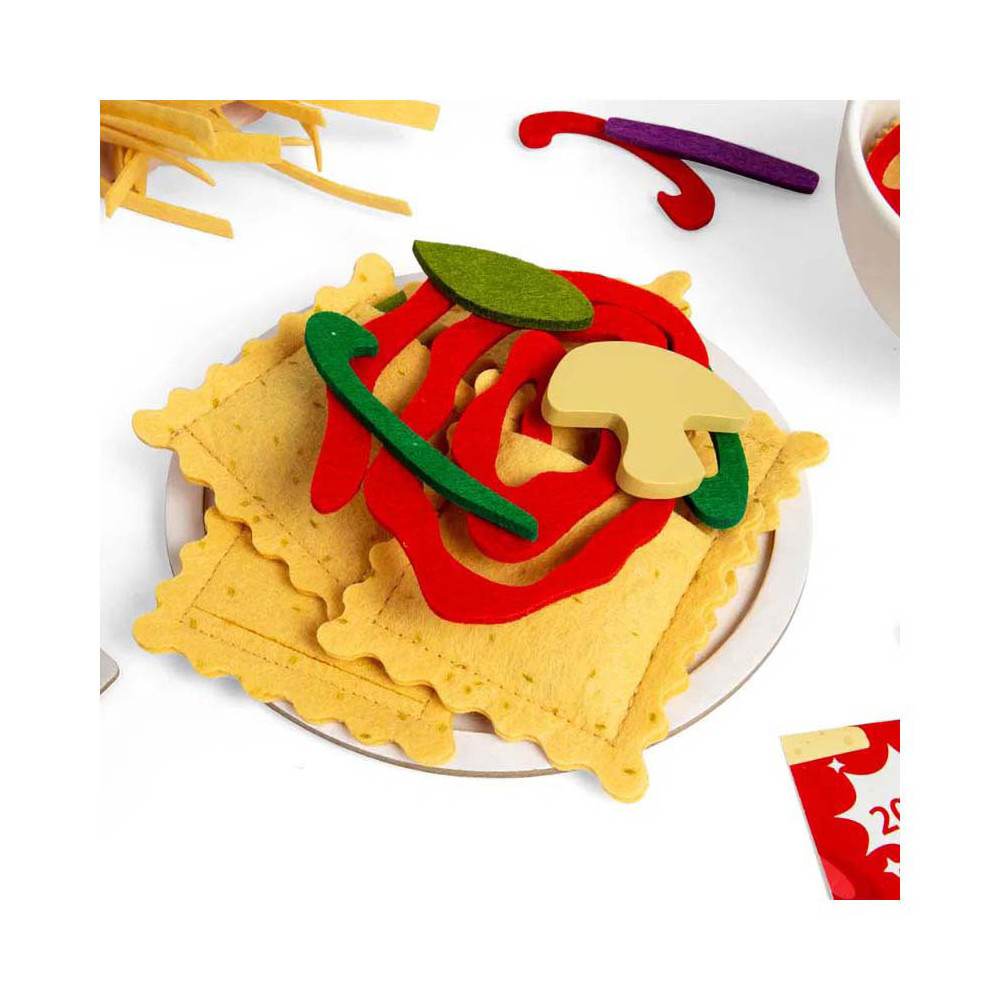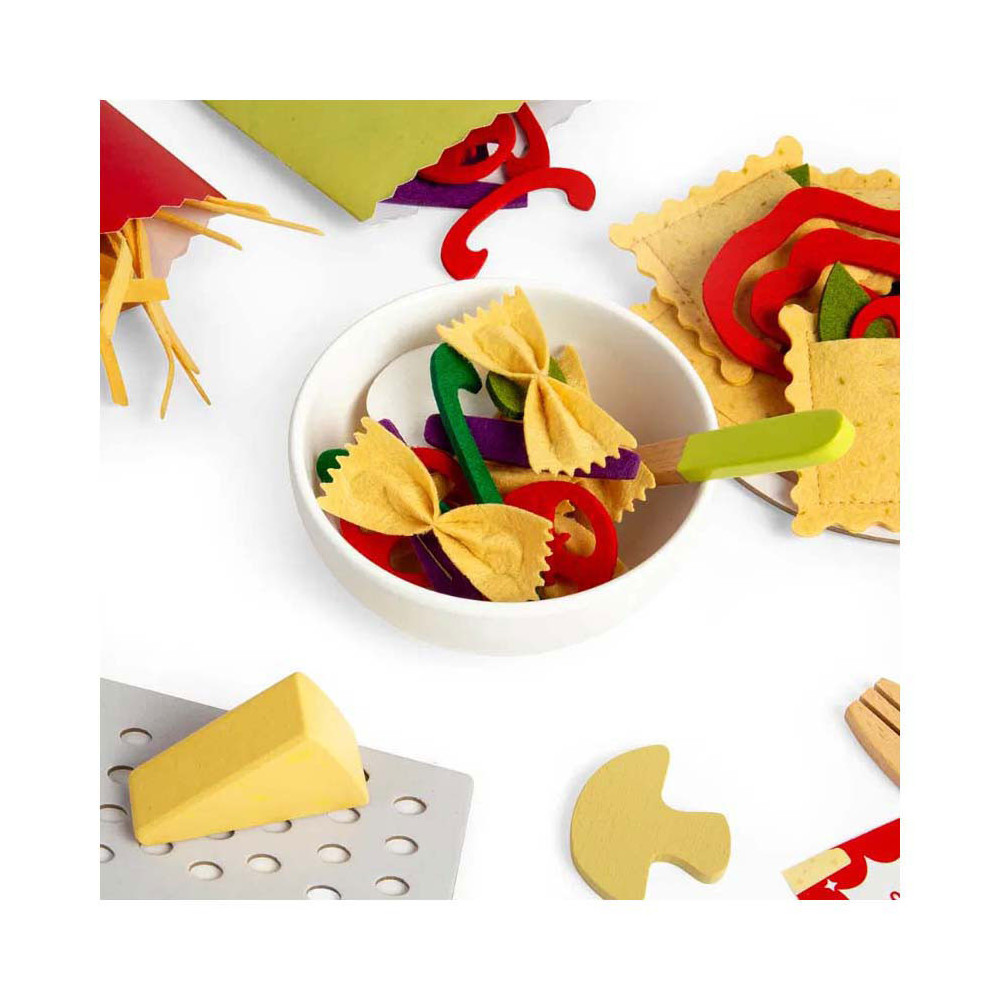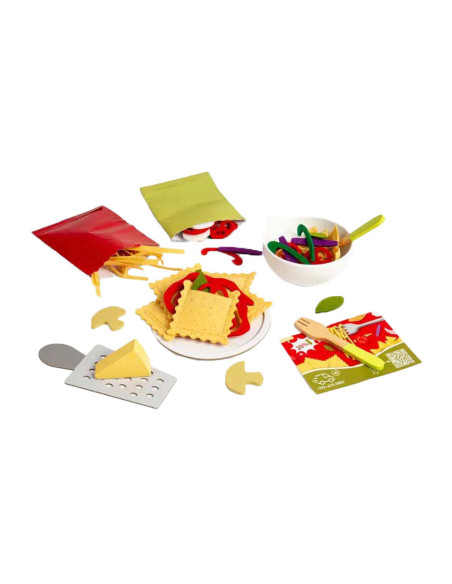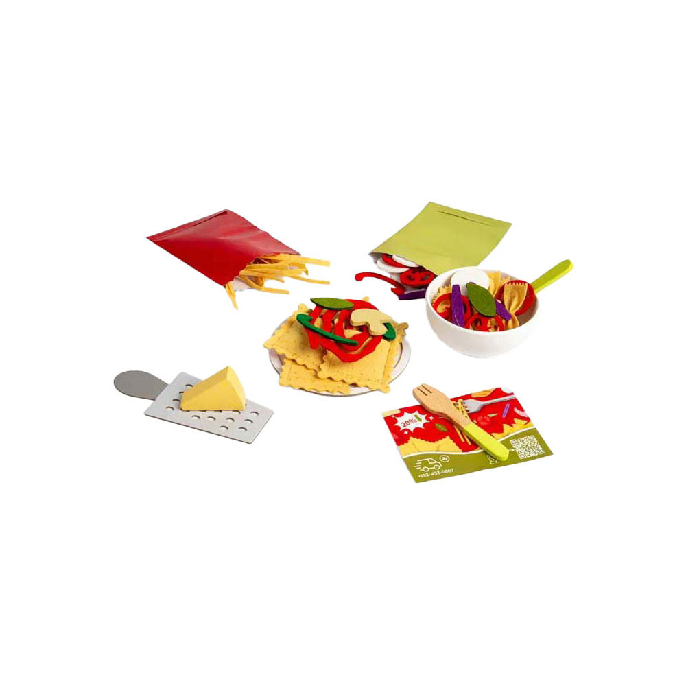 Prikkel de culinaire fantasie van uw kind met onze delizioso Pasta voor Twee Speelset! Deze overheerlijke 64-delige speelgoedvoedselset bevat een houten kom en bord, twee vorken, een kaasrasp met een parmezaanse wig, zachte vilten ingrediënten zoals tagliatelle, ravioli en farfalle, plus een verscheidenheid aan kleurrijke groenten, tomatensaus en basilicumblaadjes. Het wordt ook geleverd met een Italiaans menu voor een authentieke restaurantervaring.
