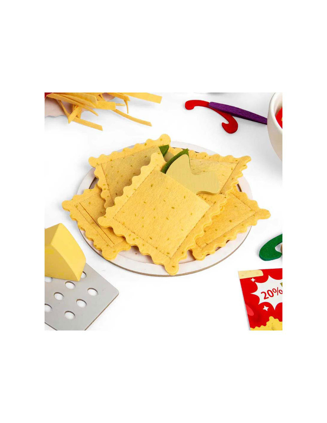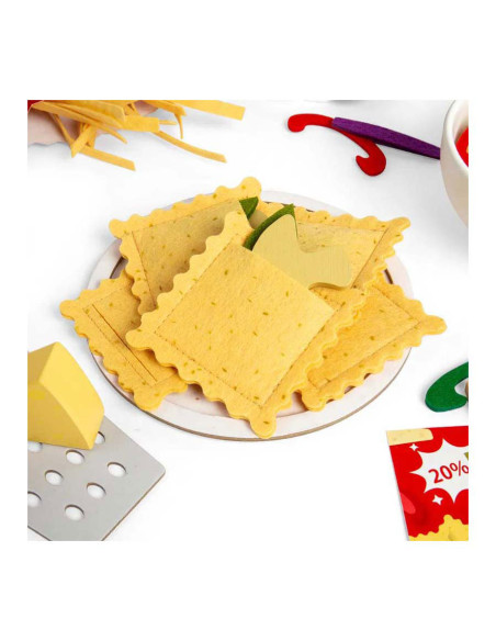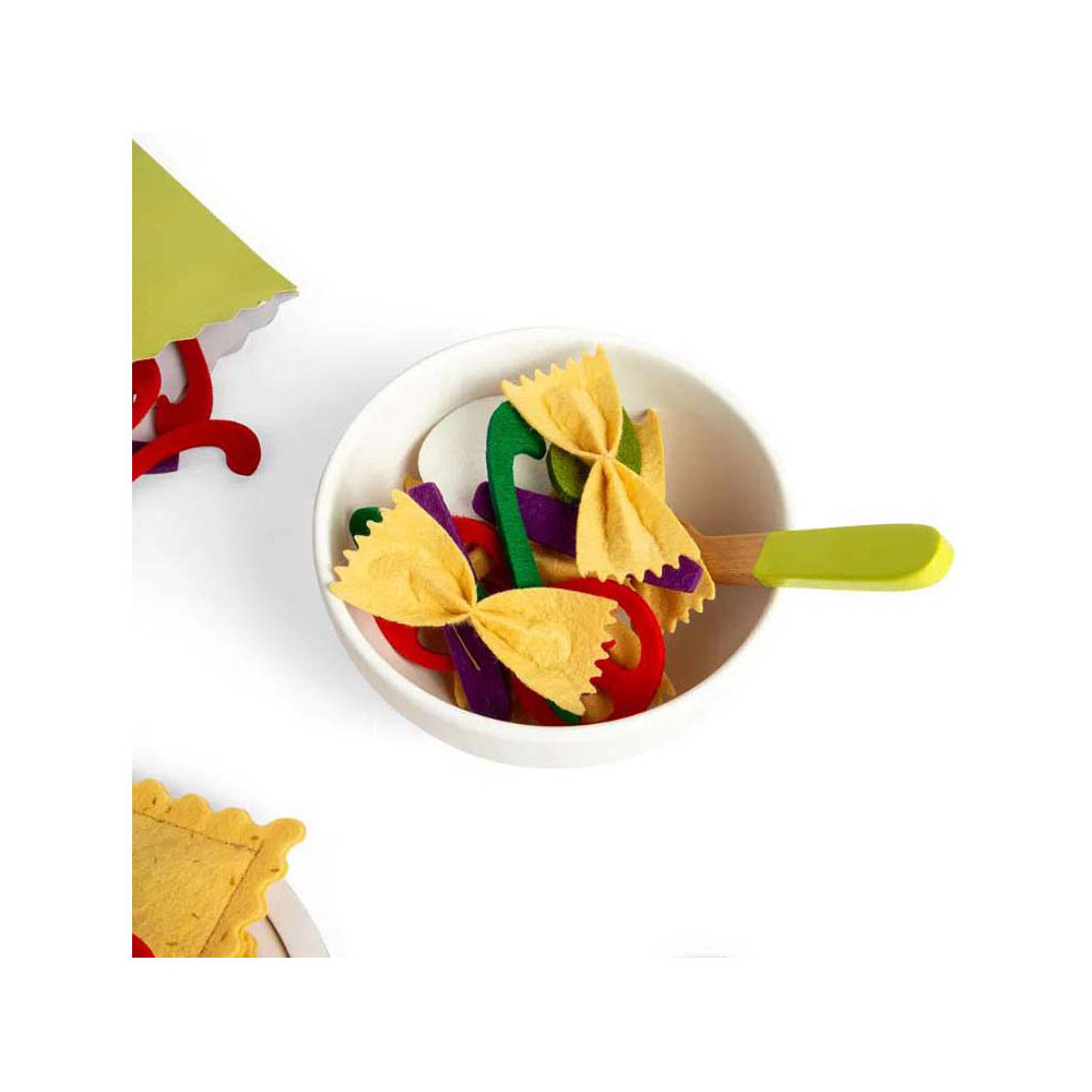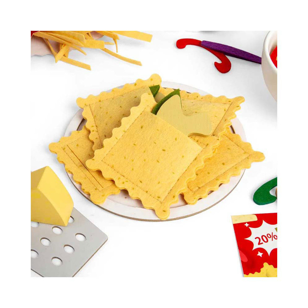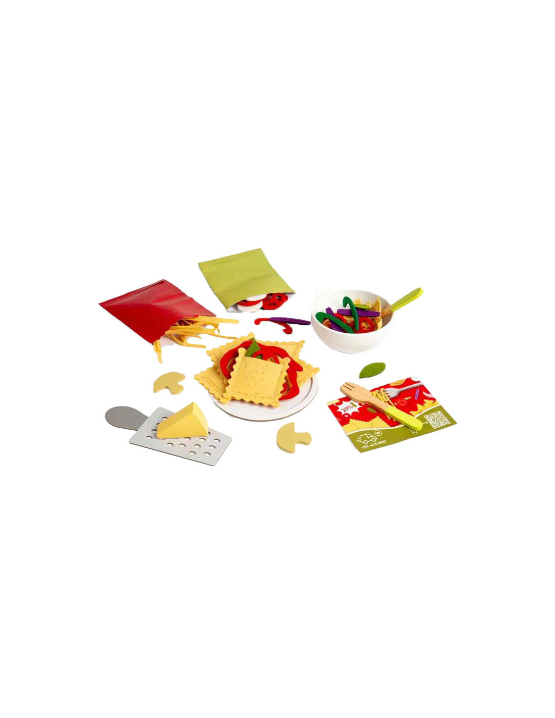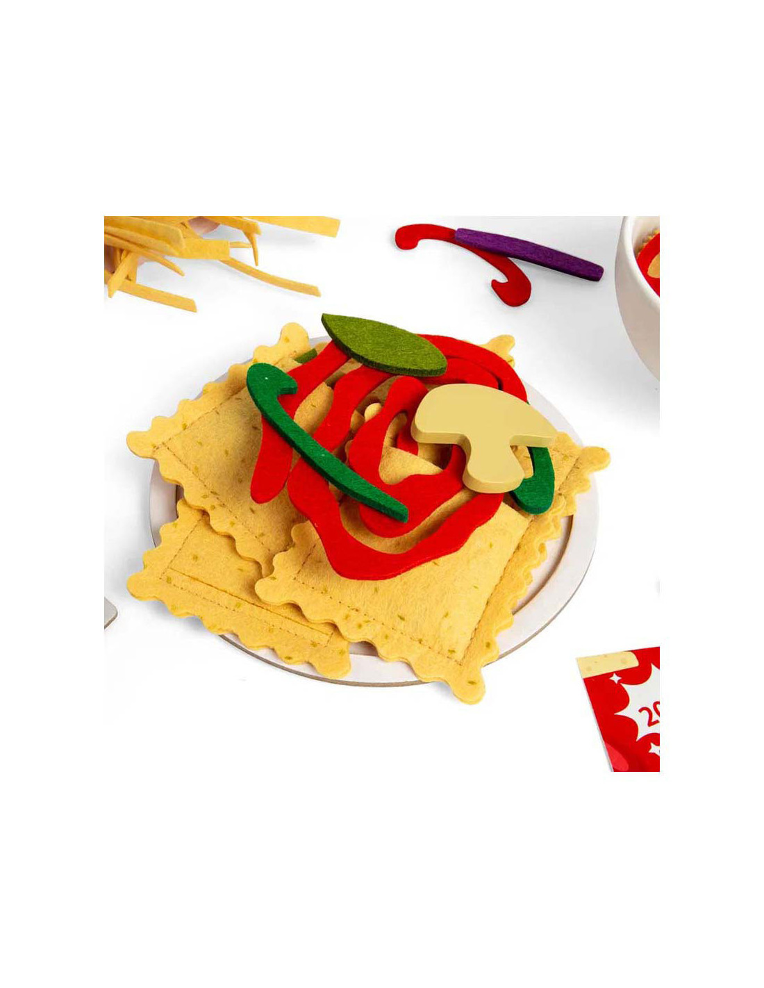 Prikkel de culinaire fantasie van uw kind met onze delizioso Pasta voor Twee Speelset! Deze overheerlijke 64-delige speelgoedvoedselset bevat een houten kom en bord, twee vorken, een kaasrasp met een parmezaanse wig, zachte vilten ingrediënten zoals tagliatelle, ravioli en farfalle, plus een verscheidenheid aan kleurrijke groenten, tomatensaus en basilicumblaadjes. Het wordt ook geleverd met een Italiaans menu voor een authentieke restaurantervaring.