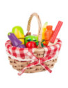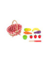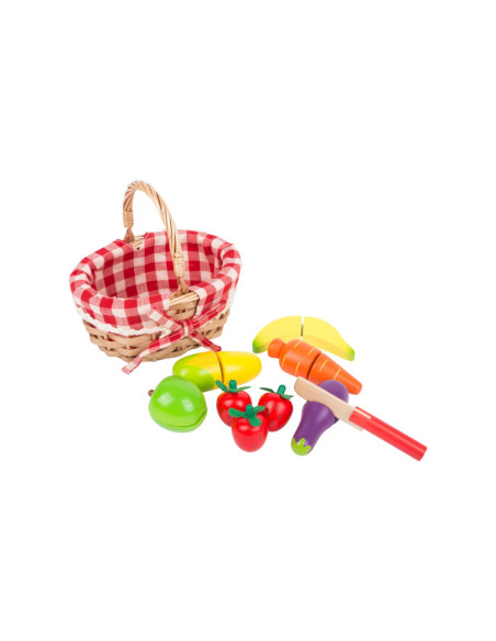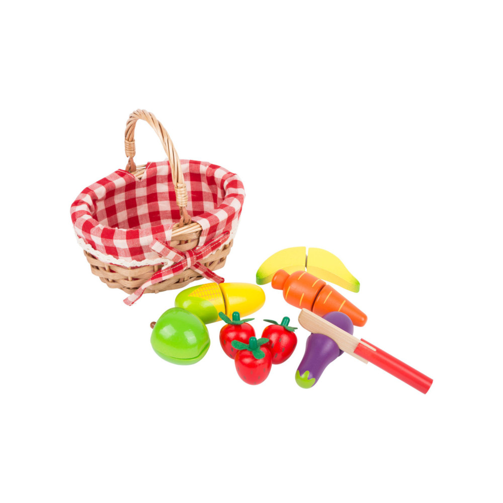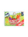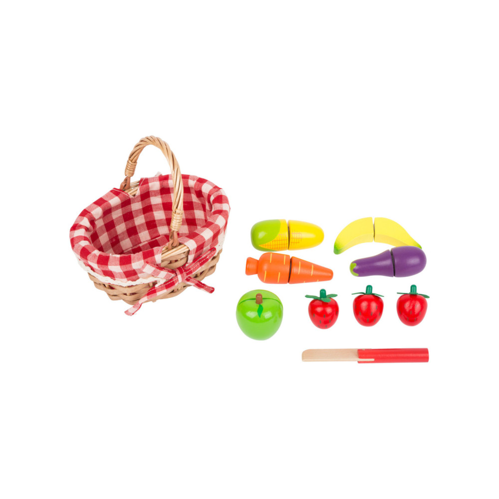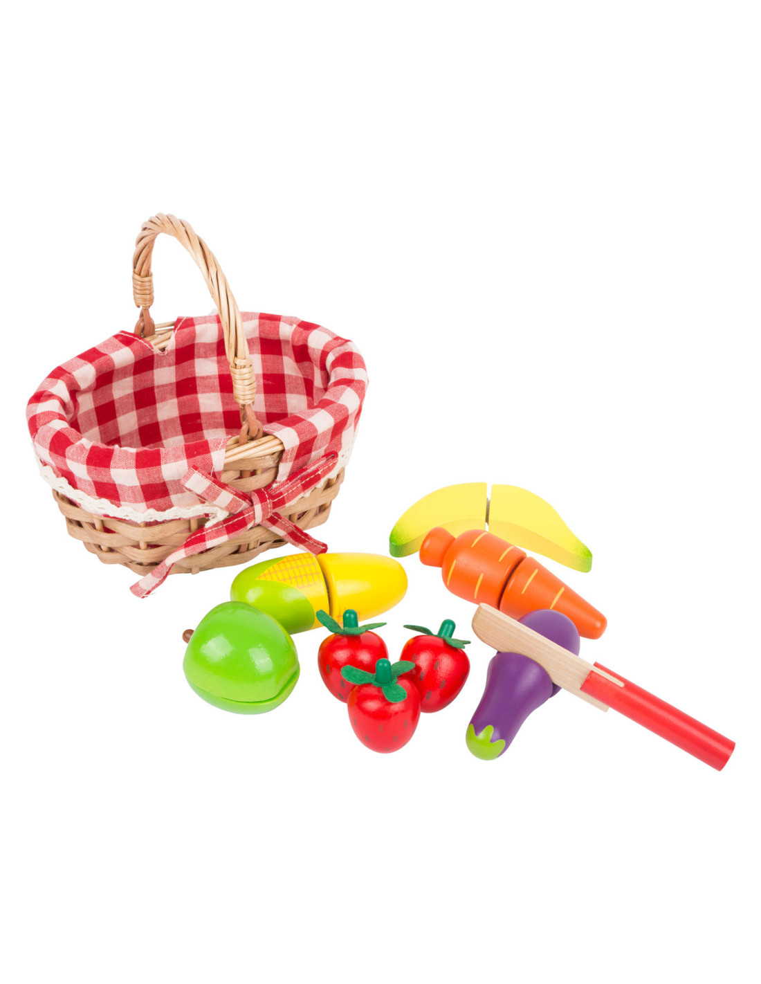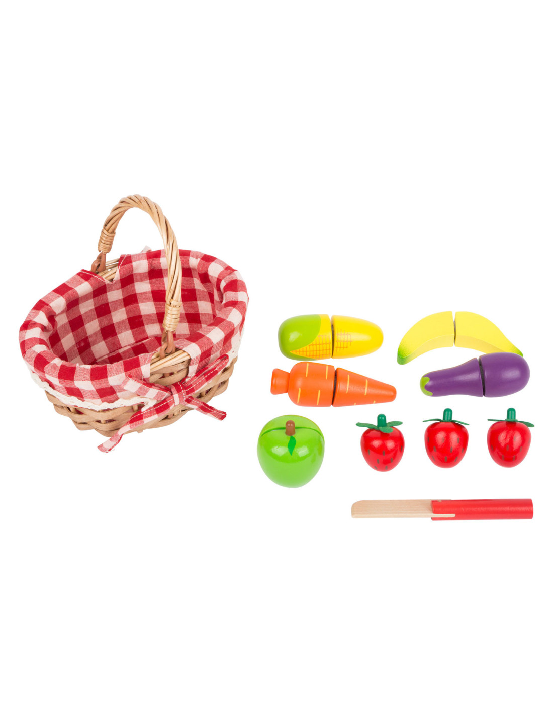 Een gevlochten boodschappenmand gevuld met aardbeien, wortel, aubergine, maiskolven, appel en banaan. Met het bijgeleverde houten mesje kan het eten bij de stukjes klittenband worden doorgesneden. Hierdoor kunnen kinderen net als de volwassenen boodschappen doen. Speel levensechte alledaagse situaties na. Alle “aankopen” kunnen mee naar huis worden genomen in de houten mand met draagbeugel. Een geweldige toevoeging aan de speelgoedsupermarkt. Door het eten te “versnijden” ontstaat er een motorisch leereffect wordt naast het speelplezier niet verwaarloosd!