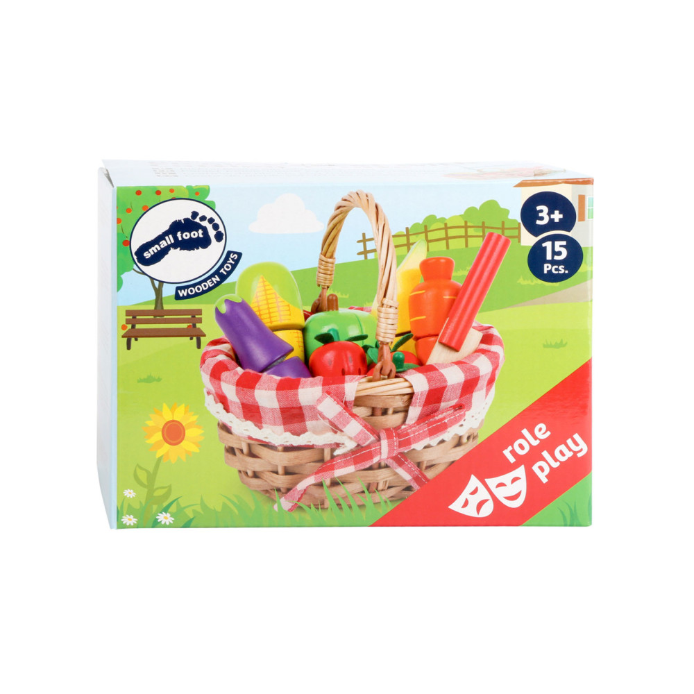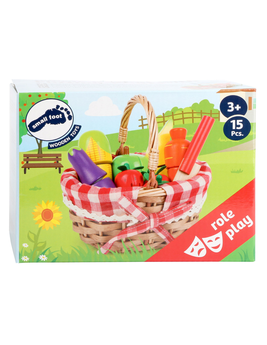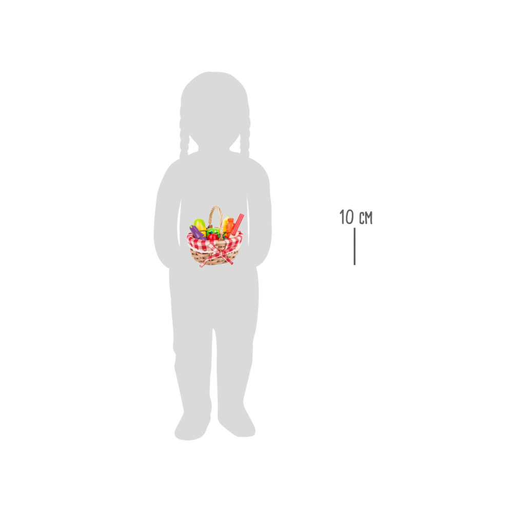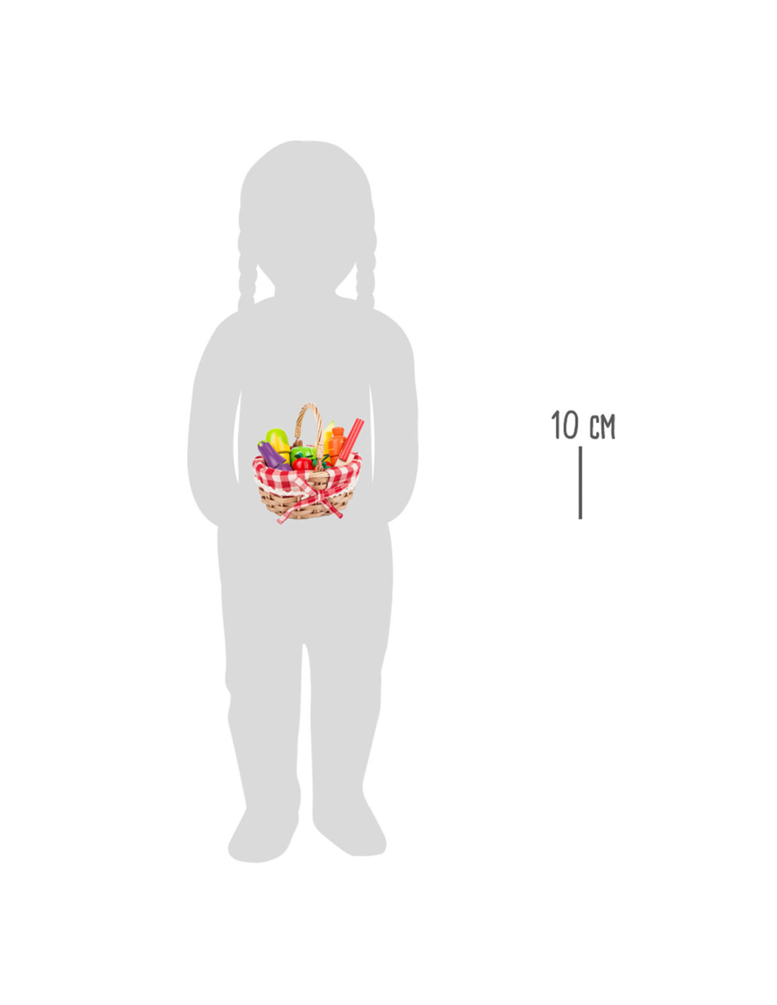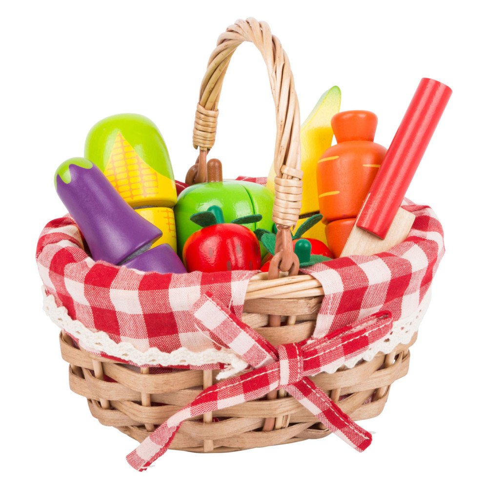Een gevlochten boodschappenmand gevuld met aardbeien, wortel, aubergine, maiskolven, appel en banaan. Met het bijgeleverde houten mesje kan het eten bij de stukjes klittenband worden doorgesneden. Hierdoor kunnen kinderen net als de volwassenen boodschappen doen. Speel levensechte alledaagse situaties na. Alle “aankopen” kunnen mee naar huis worden genomen in de houten mand met draagbeugel. Een geweldige toevoeging aan de speelgoedsupermarkt. Door het eten te “versnijden” ontstaat er een motorisch leereffect wordt naast het speelplezier niet verwaarloosd!