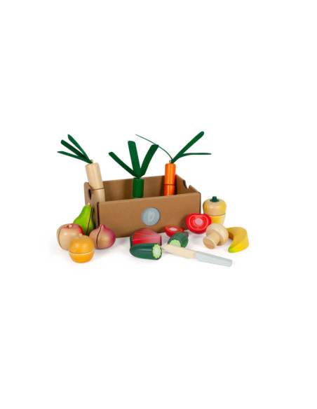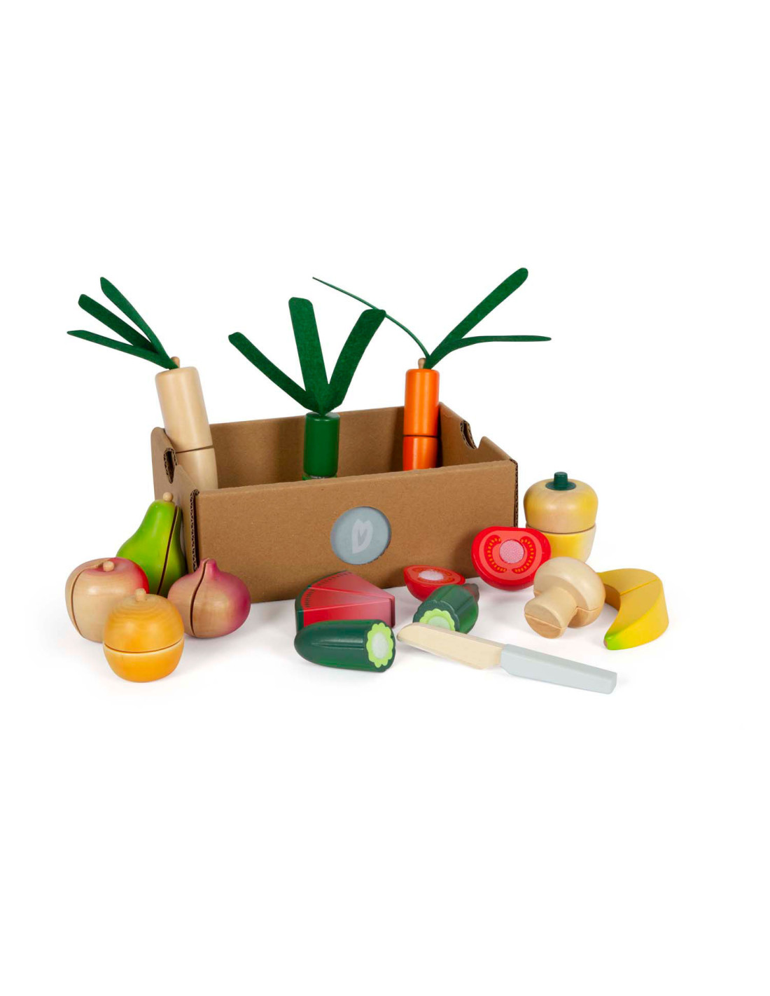 Snijdbare groente en fruit speelset. Geschikt voor kinderen vanaf 24 maanden. De doos is circa 21 x 15 x 7,5 cm groot.