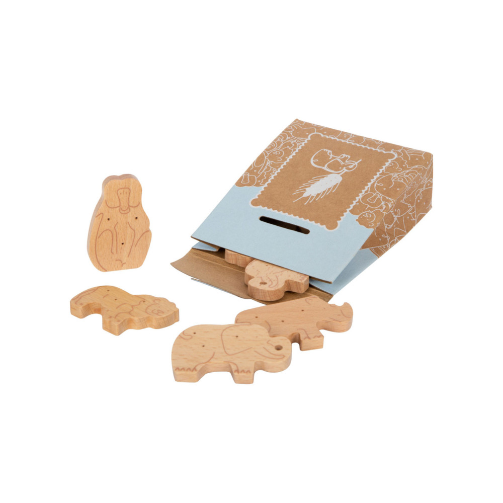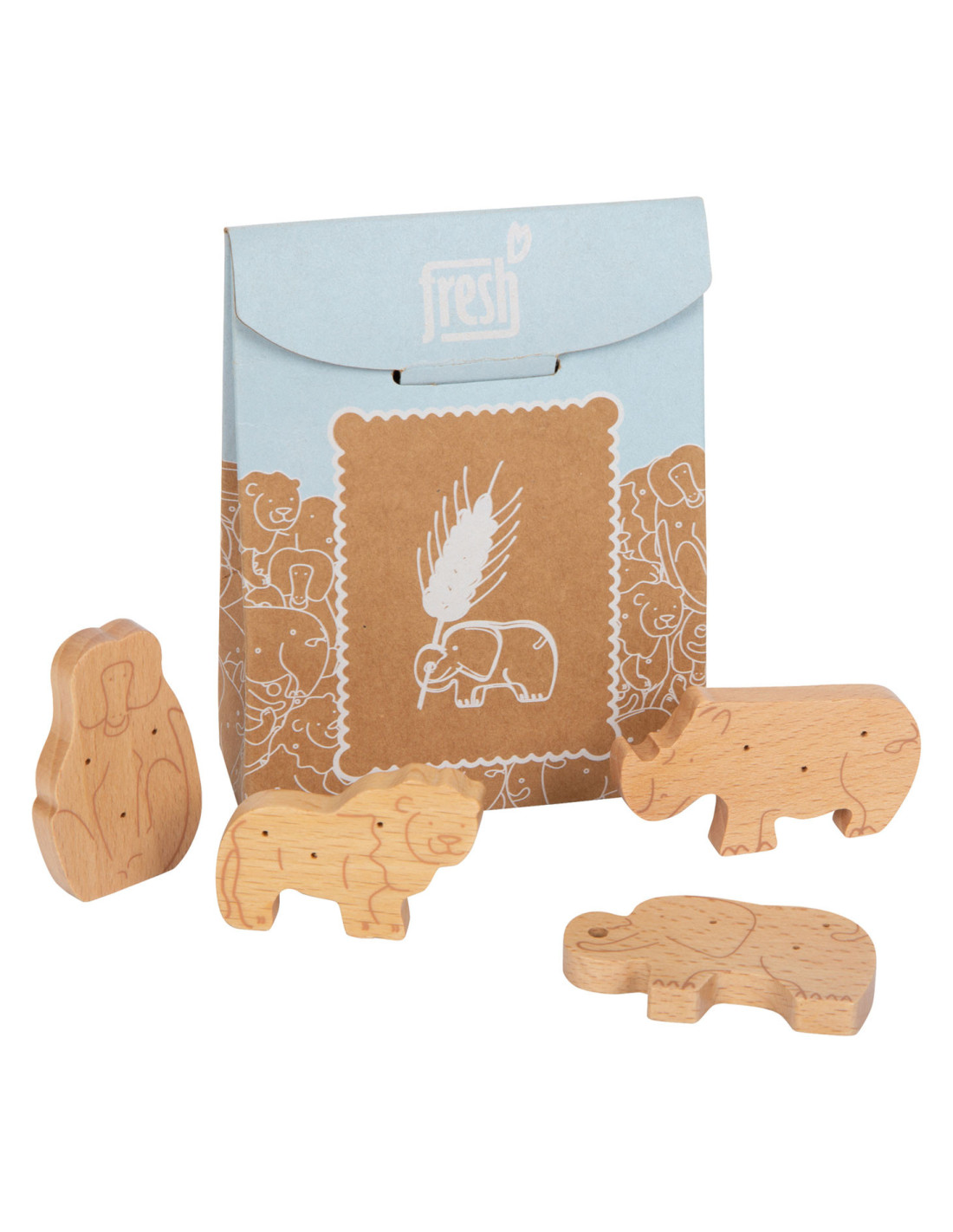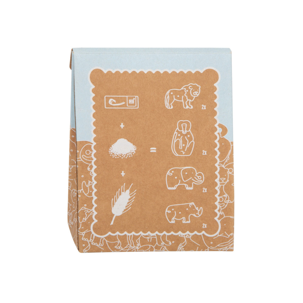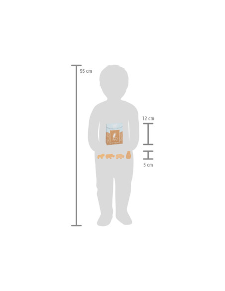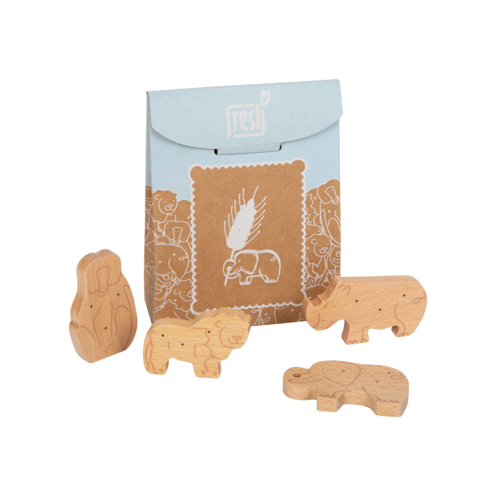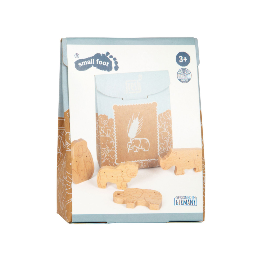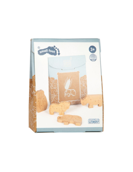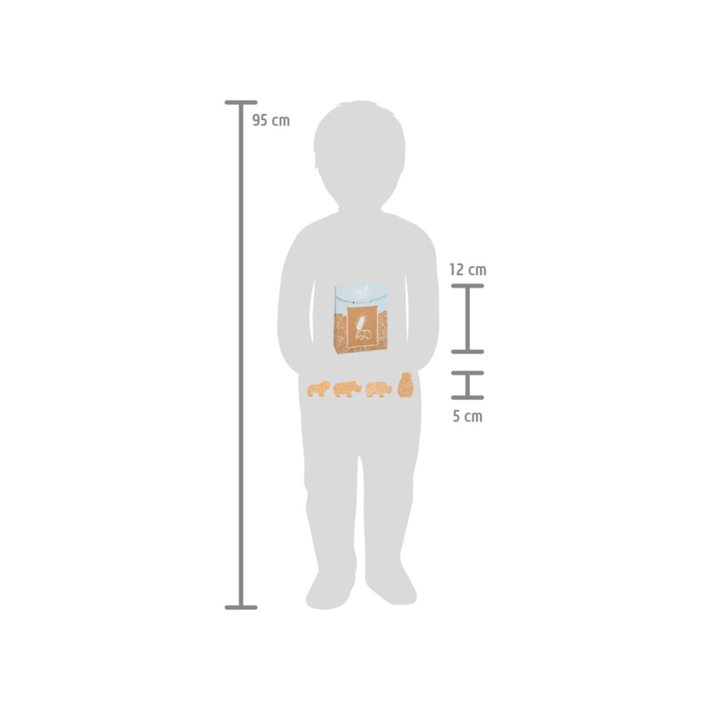Enkele savannedieren voor het koekjesassortiment in de speelwinkel! Deze 8 robuuste dieren crackers van massief hout zijn een echte verrijking voor het snoepassortiment in de speelwinkel! Deze populaire koekjes zien er gegarandeerd geweldig uit in het schap in hun opvouwbare doos van natuurlijk karton. De eenvoudige illustraties op de verpakking zijn goed te begrijpen voor jonge kinderen die nog niet kunnen lezen. Het is praktisch en leerzaam: de inhoud staat in plaatjes afgebeeld op de achterkant van de crackersdoos. Door het natuurlijk ogende, realistische uiterlijk van de dierencrackers (2 leeuwen, 2 apen, 2 neushoorns, 2 olifanten) zullen ze een hit worden tijdens het fantasievolle rollenspel in de speelwinkel en speelkeuken! Langdurig speelplezier met houten speelgoedvoeding gegarandeerd.