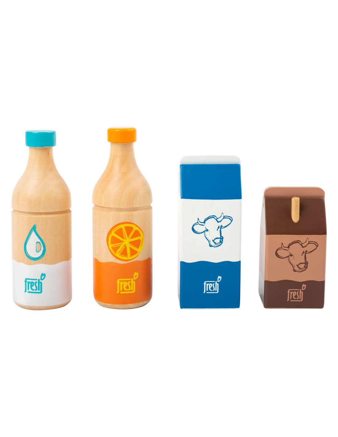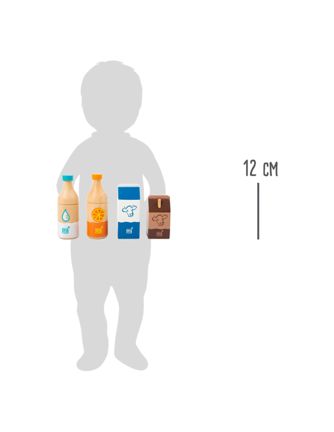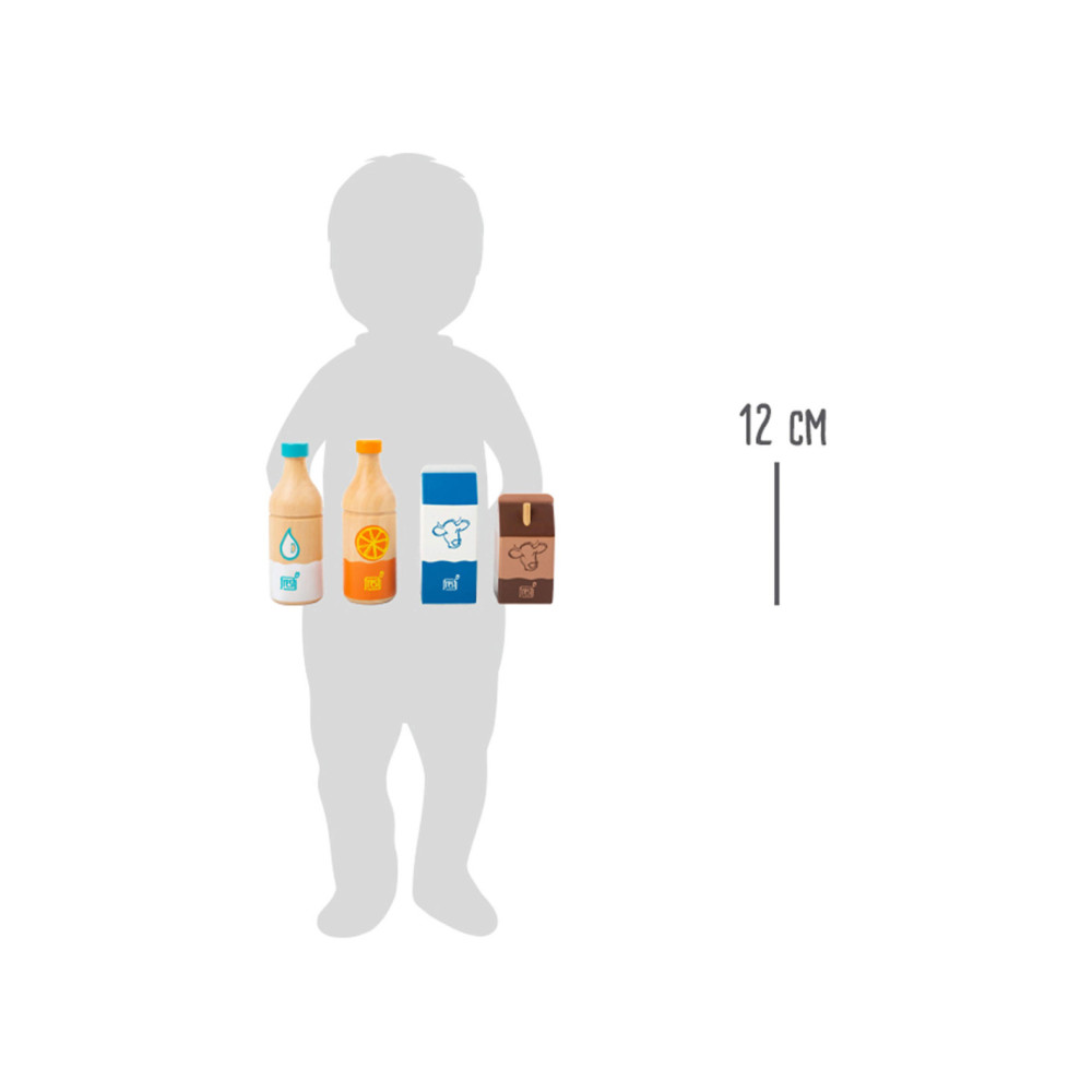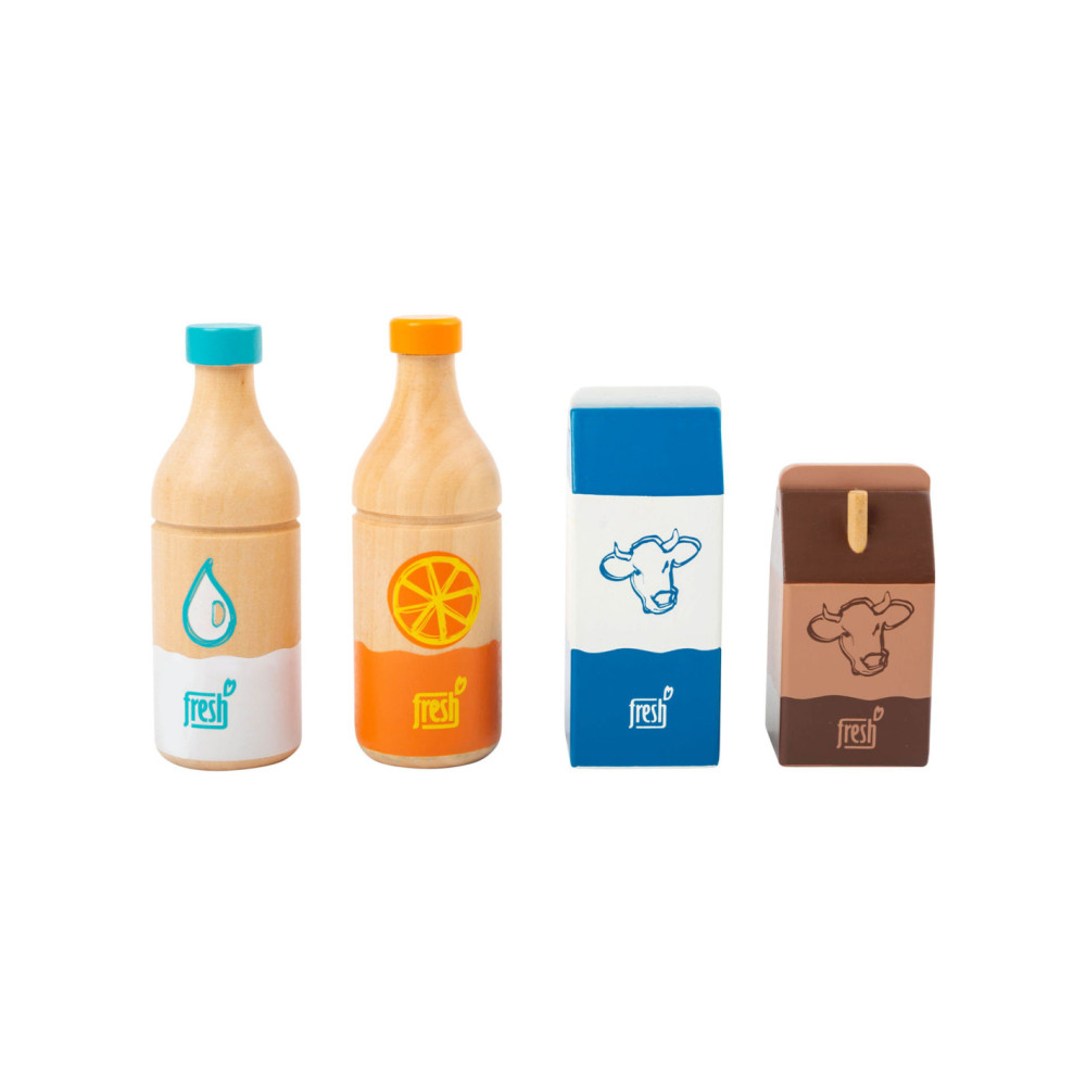 Vier dorstlessers in één set! Deze vierdelige houten borrelset bevat een flesje sinaasappelsap, een flesje water, een bakje melk en een klein pakje cacao. Met een ontwerp met eenvoudige illustraties zijn ze perfect geschikt voor jonge kinderen die nog niet kunnen lezen. Een ideale aanvulling voor speelwinkels en speelkeukens! Ontworpen met typische kleuren van de afgebeelde producten en een groot, zichtbaar aandeel houtmateriaal, biedt deze speelset een harmonieuze uitstraling.