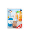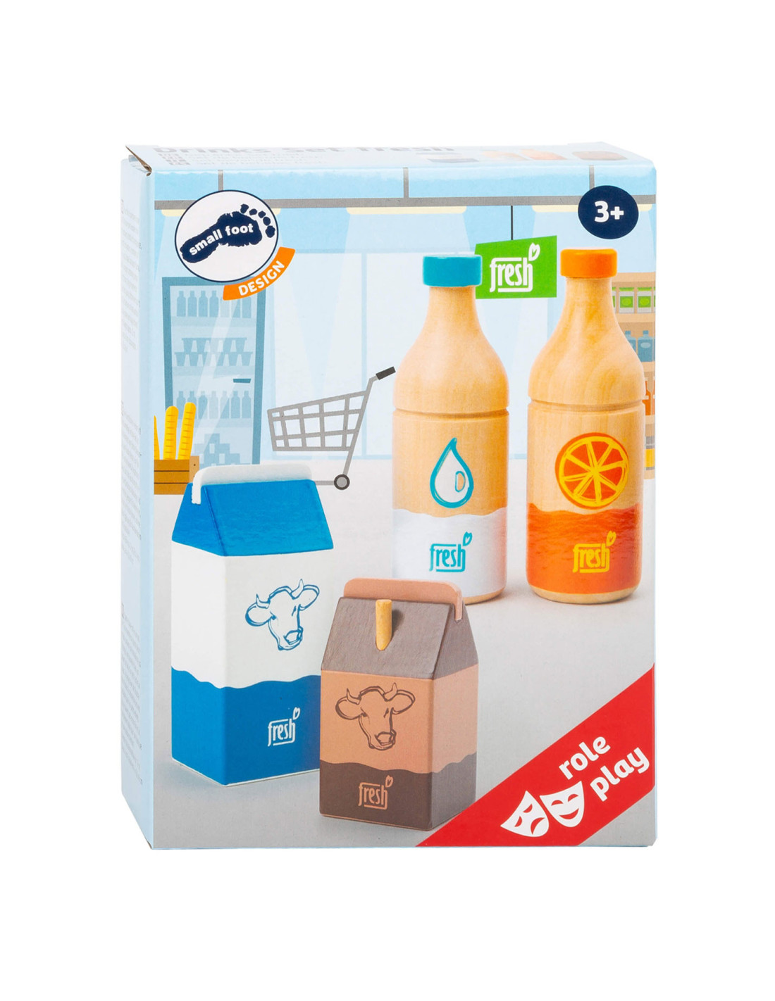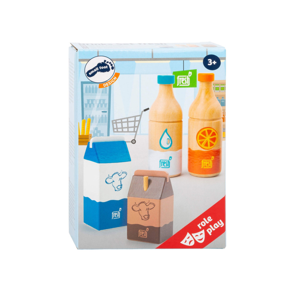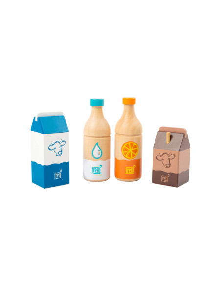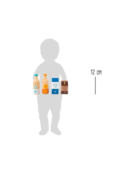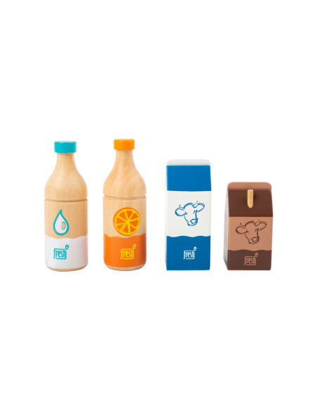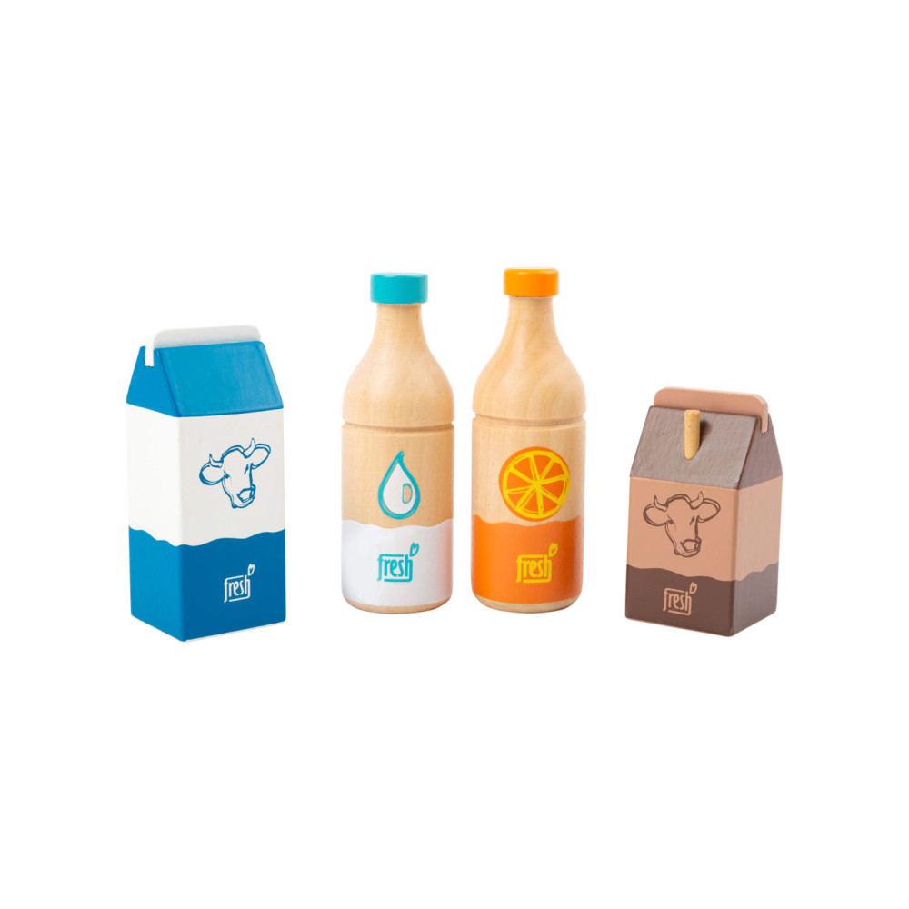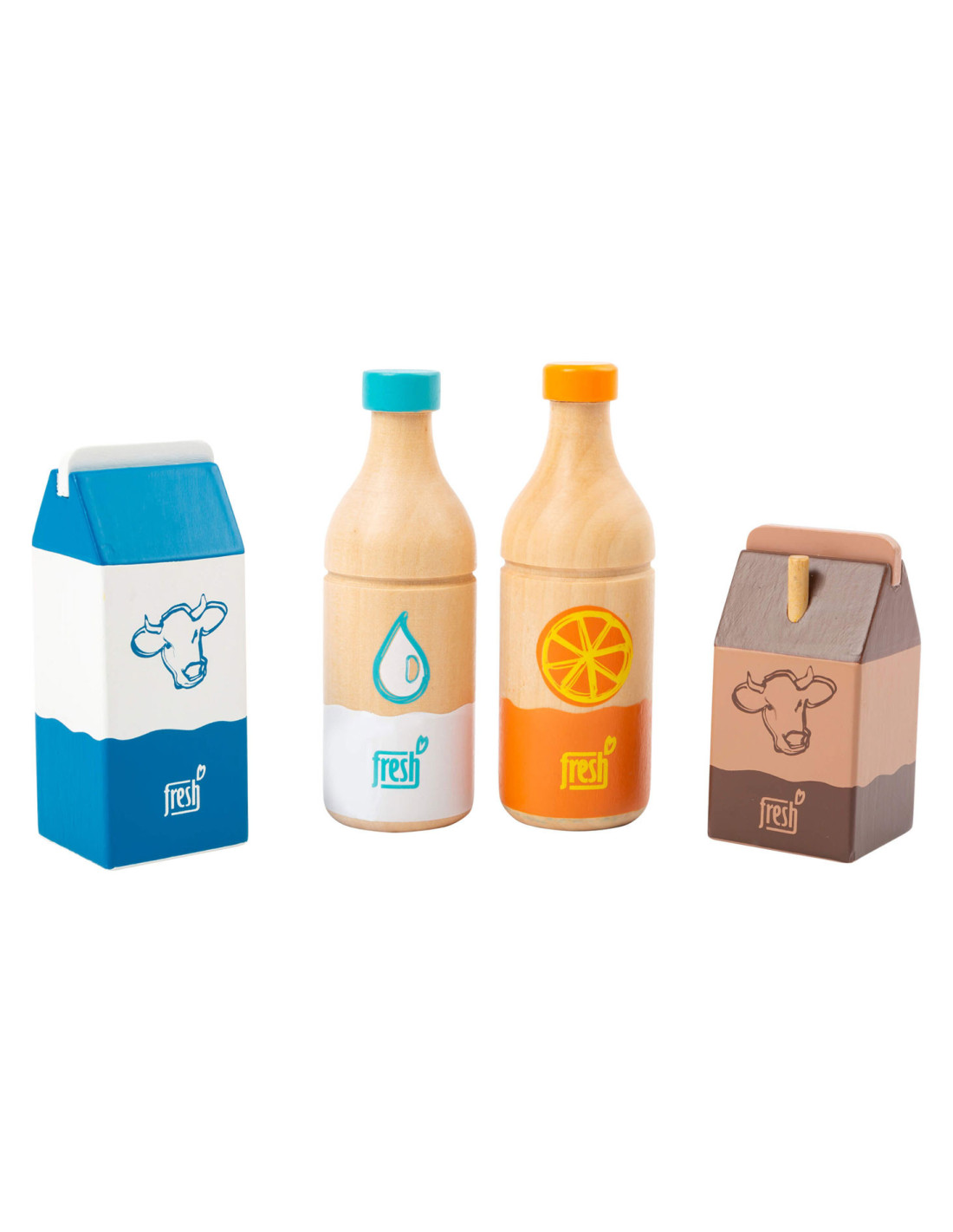 Vier dorstlessers in één set! Deze vierdelige houten borrelset bevat een flesje sinaasappelsap, een flesje water, een bakje melk en een klein pakje cacao. Met een ontwerp met eenvoudige illustraties zijn ze perfect geschikt voor jonge kinderen die nog niet kunnen lezen. Een ideale aanvulling voor speelwinkels en speelkeukens! Ontworpen met typische kleuren van de afgebeelde producten en een groot, zichtbaar aandeel houtmateriaal, biedt deze speelset een harmonieuze uitstraling.