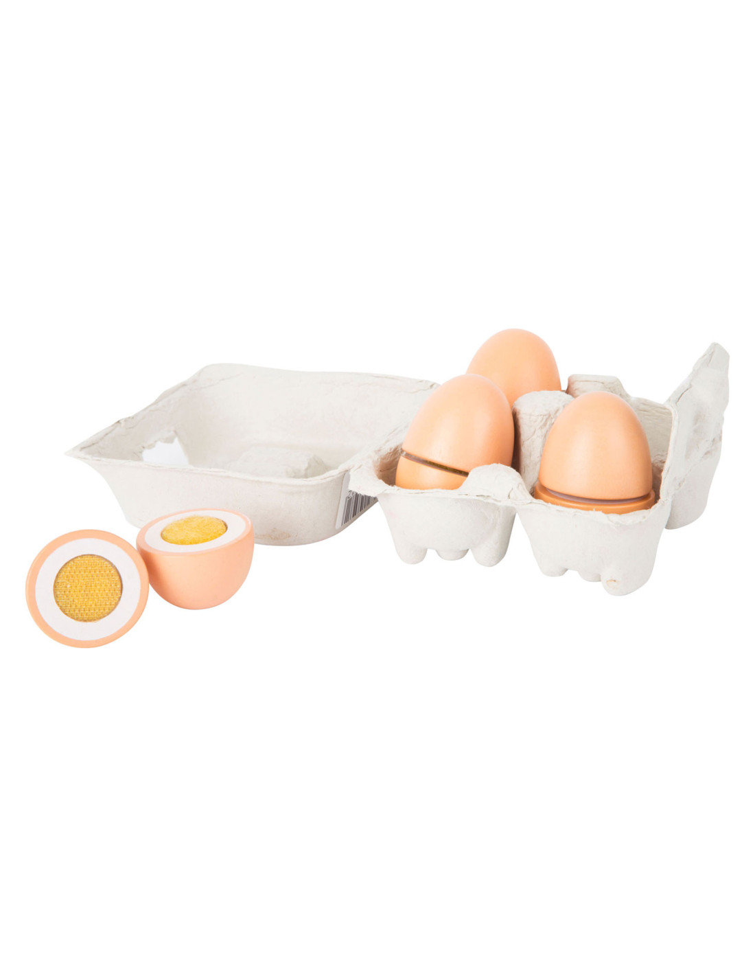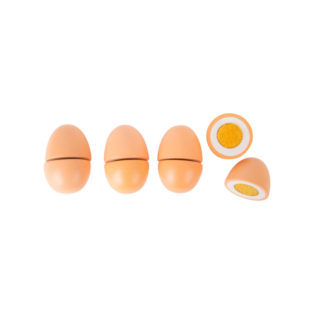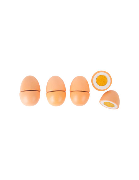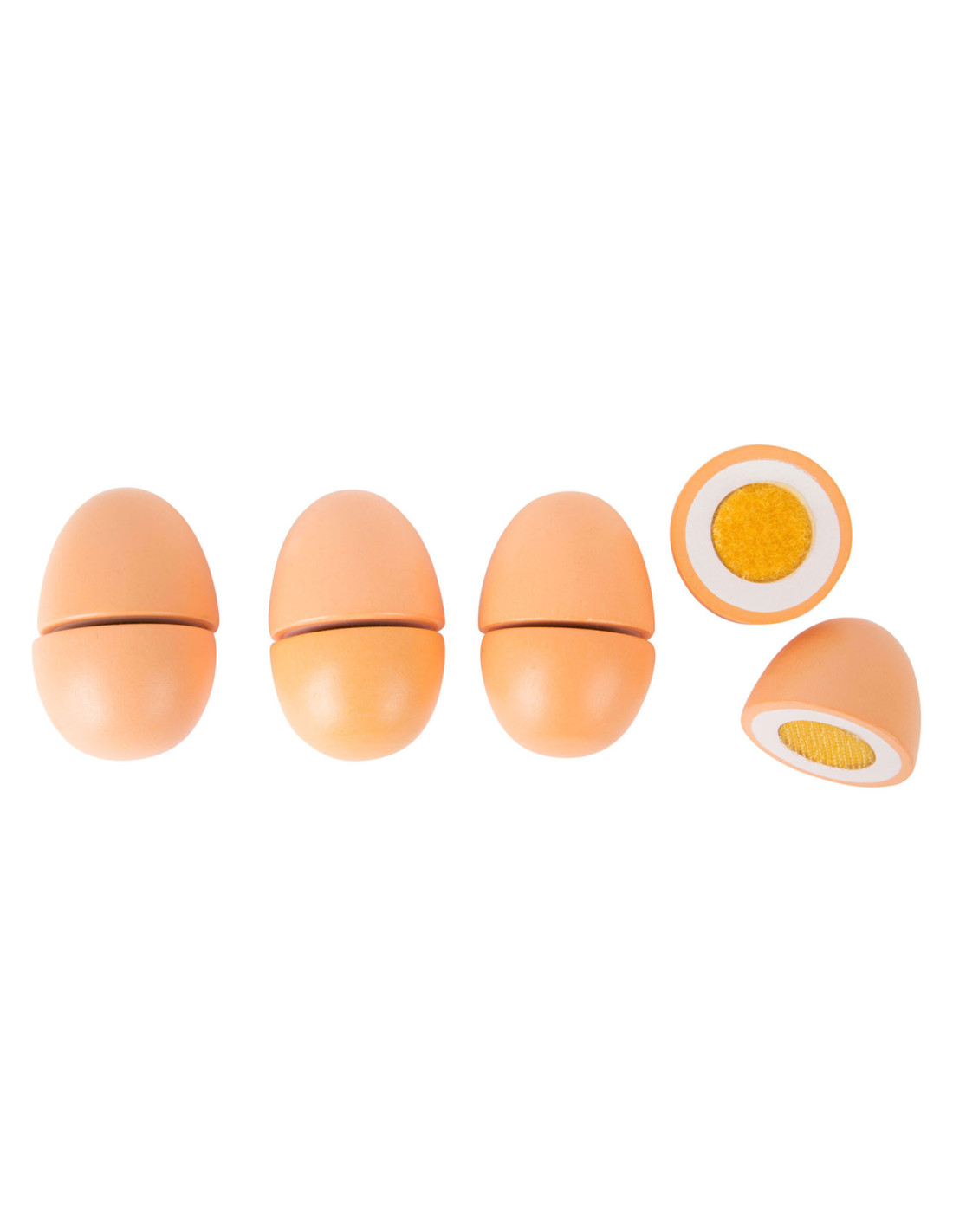 Jammie, ontbijt! Deze vier eieren van robuust hout bieden allerlei soorten speelplezier. Ze worden bij elkaar gehouden met klittenband en kunnen worden gescheiden met het houten mes. De eierdoos van karton bewaart de eieren voor een veilig transport. Dus, topchefs, laten we het fornuis aansteken! De eieren zijn een leuke toevoeging aan het speelkeukentje en zijn te combineren met ander klittenband keukengerei en keukengerei. Je krijgt een echt A-ha-effect als de doos voor het eerst wordt geopend!
