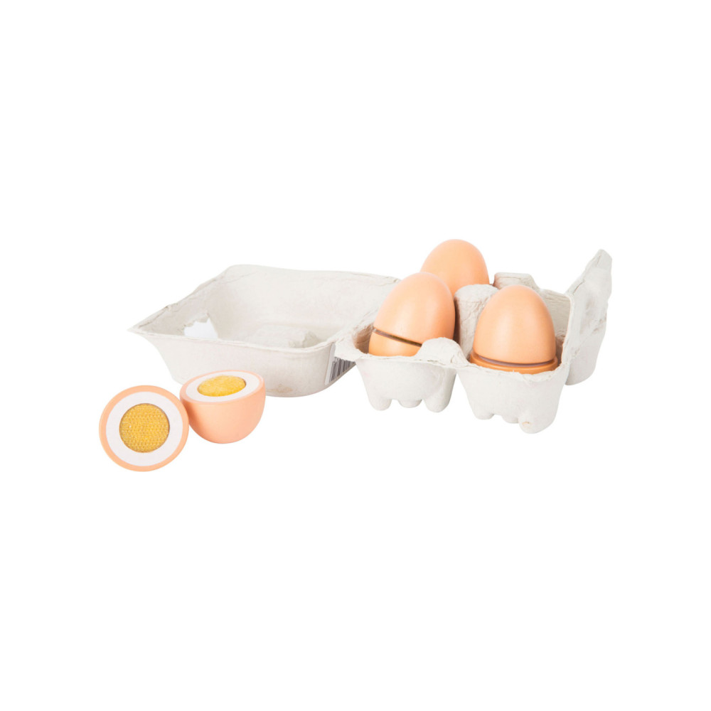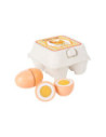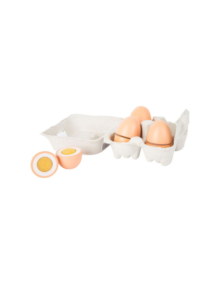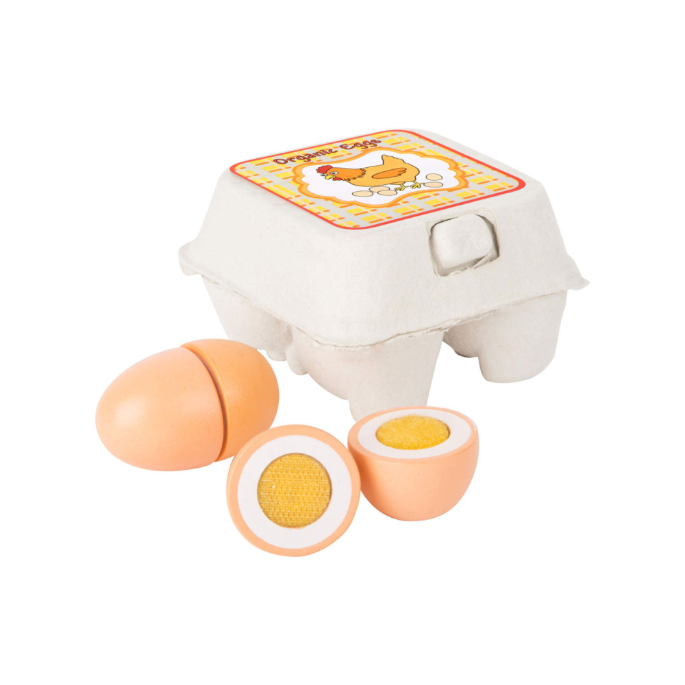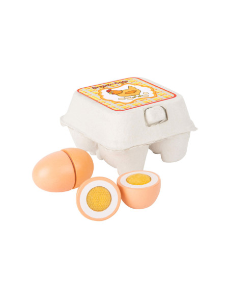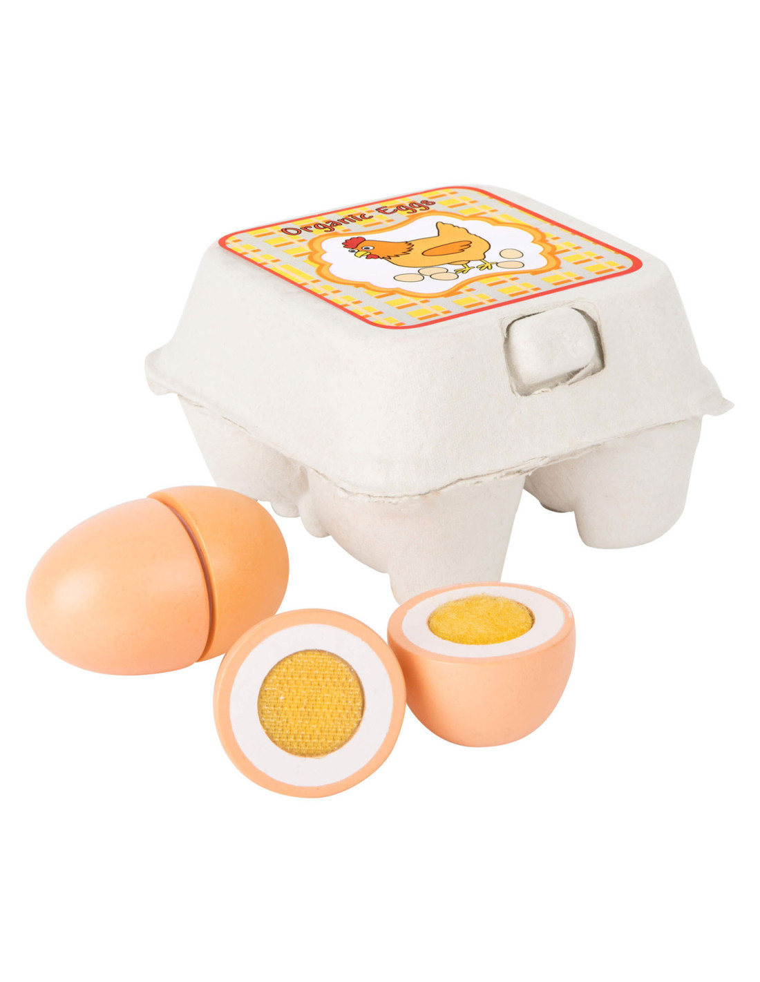 Jammie, ontbijt! Deze vier eieren van robuust hout bieden allerlei soorten speelplezier. Ze worden bij elkaar gehouden met klittenband en kunnen worden gescheiden met het houten mes. De eierdoos van karton bewaart de eieren voor een veilig transport. Dus, topchefs, laten we het fornuis aansteken! De eieren zijn een leuke toevoeging aan het speelkeukentje en zijn te combineren met ander klittenband keukengerei en keukengerei. Je krijgt een echt A-ha-effect als de doos voor het eerst wordt geopend!