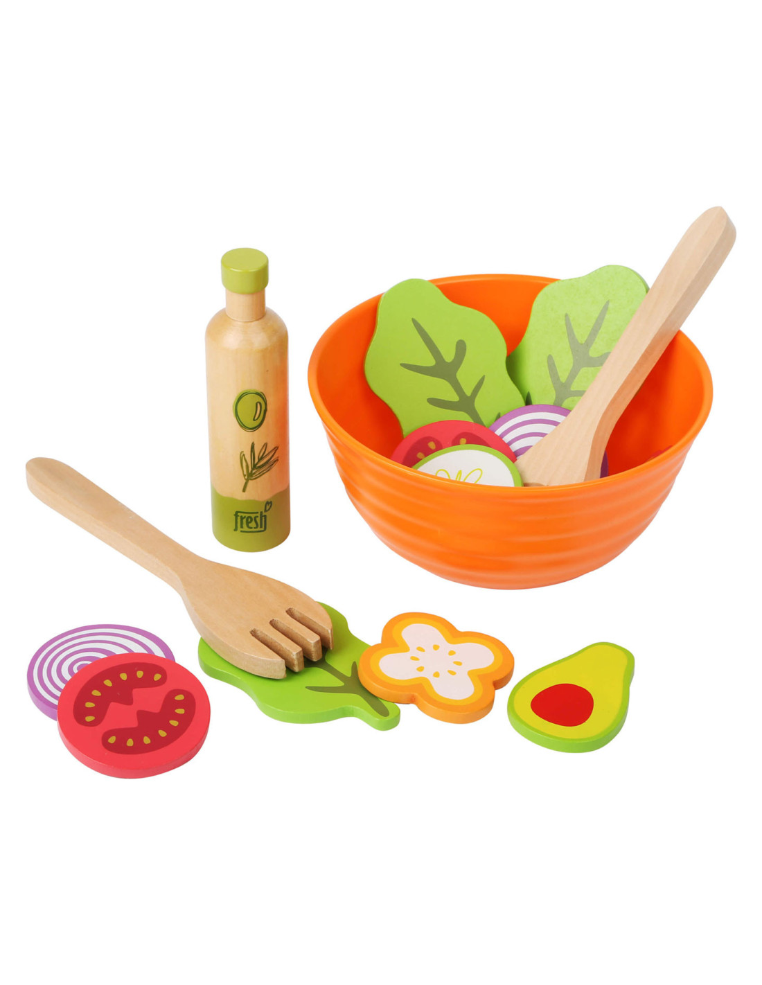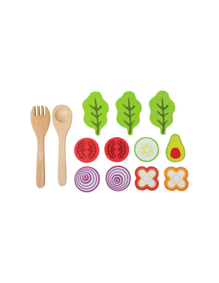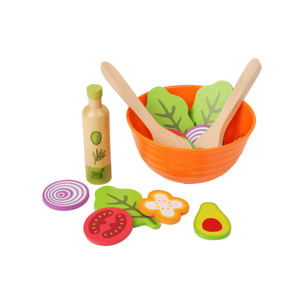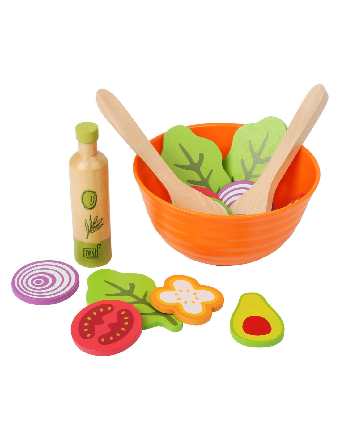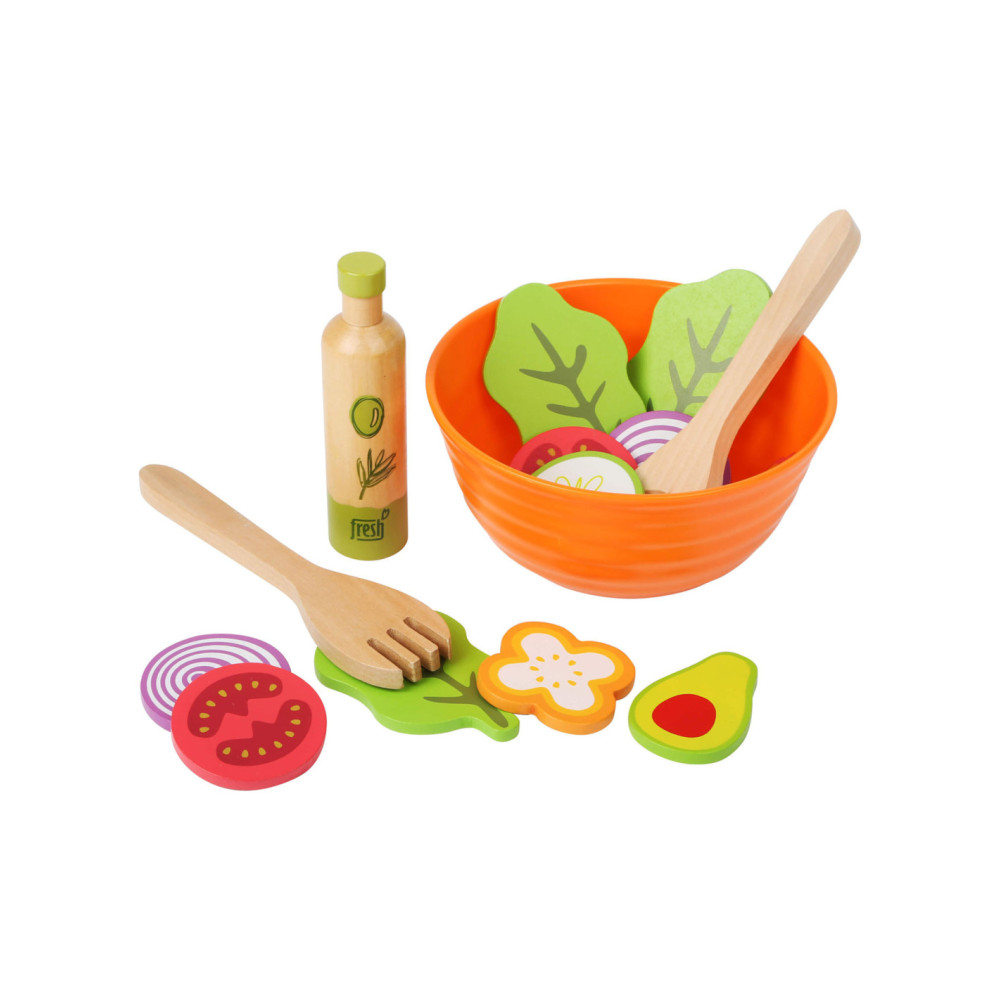 We eten salade vandaag! Tomaten, uien, avocado's, sla, komkommers en olijfolie, allemaal gemaakt van robuust hout - ze horen thuis in elke salade. Hiermee worden kinderen door middel van rollenspellen naar een gezond voedingspatroon gestuurd. Hun eigen creaties kunnen in een plastic kom worden geassembleerd en samen met de houten gebruiksvoorwerpen worden gemengd. De perfecte toevoeging aan elke speelkeuken!