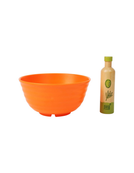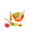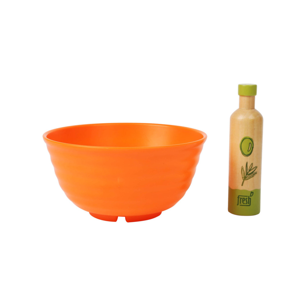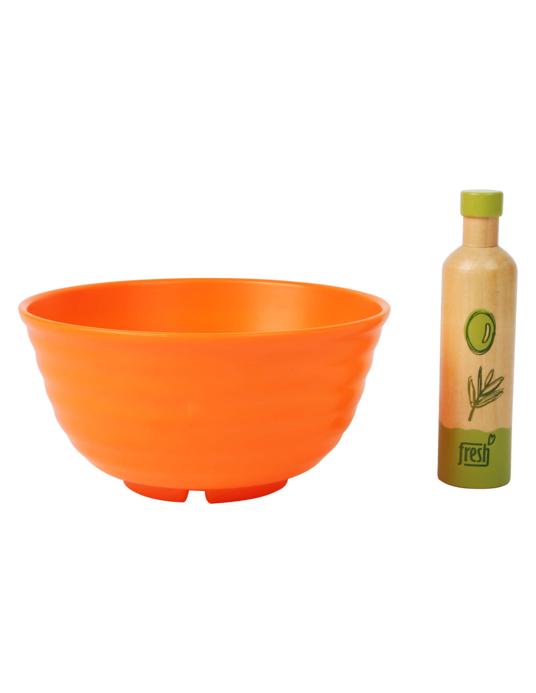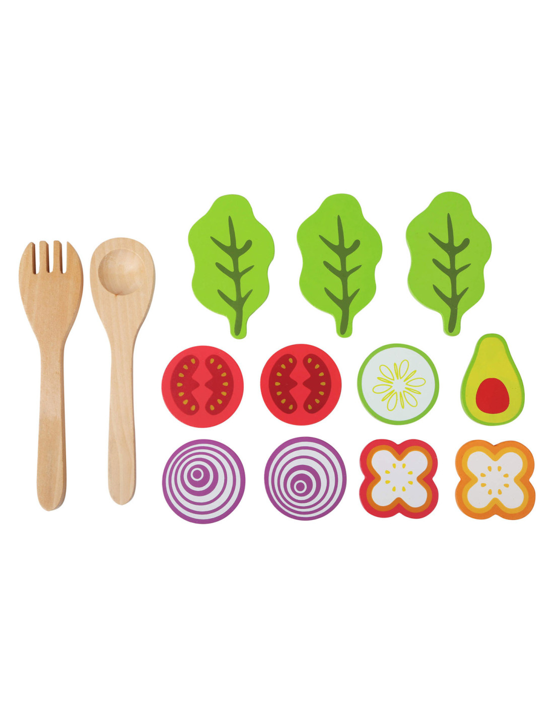 We eten salade vandaag! Tomaten, uien, avocado's, sla, komkommers en olijfolie, allemaal gemaakt van robuust hout - ze horen thuis in elke salade. Hiermee worden kinderen door middel van rollenspellen naar een gezond voedingspatroon gestuurd. Hun eigen creaties kunnen in een plastic kom worden geassembleerd en samen met de houten gebruiksvoorwerpen worden gemengd. De perfecte toevoeging aan elke speelkeuken!