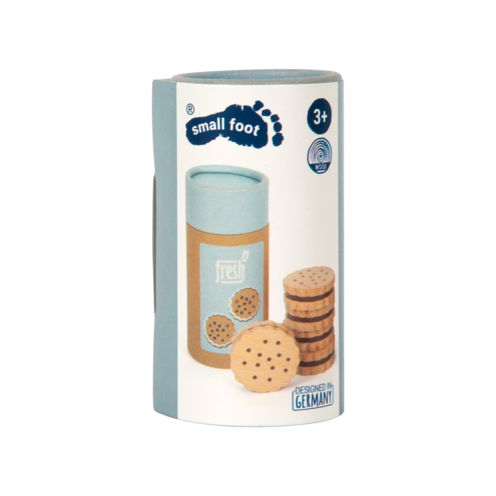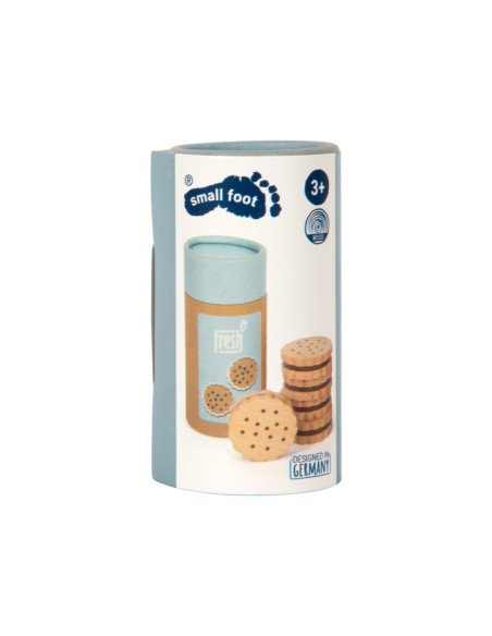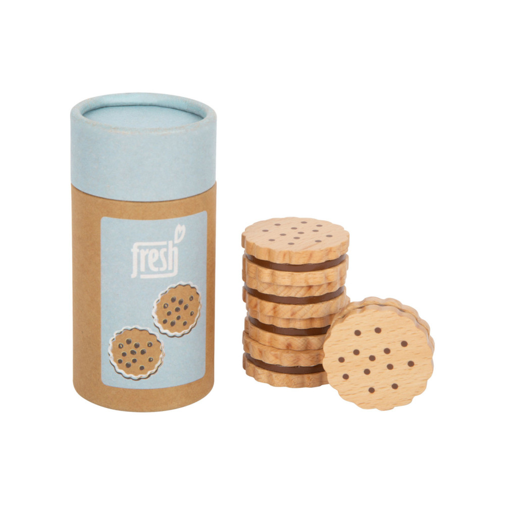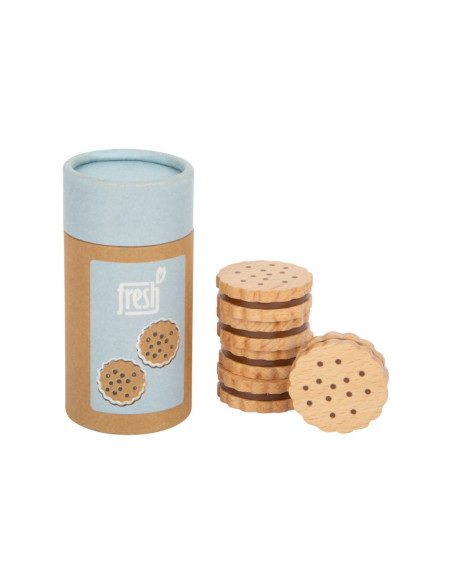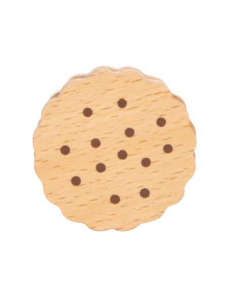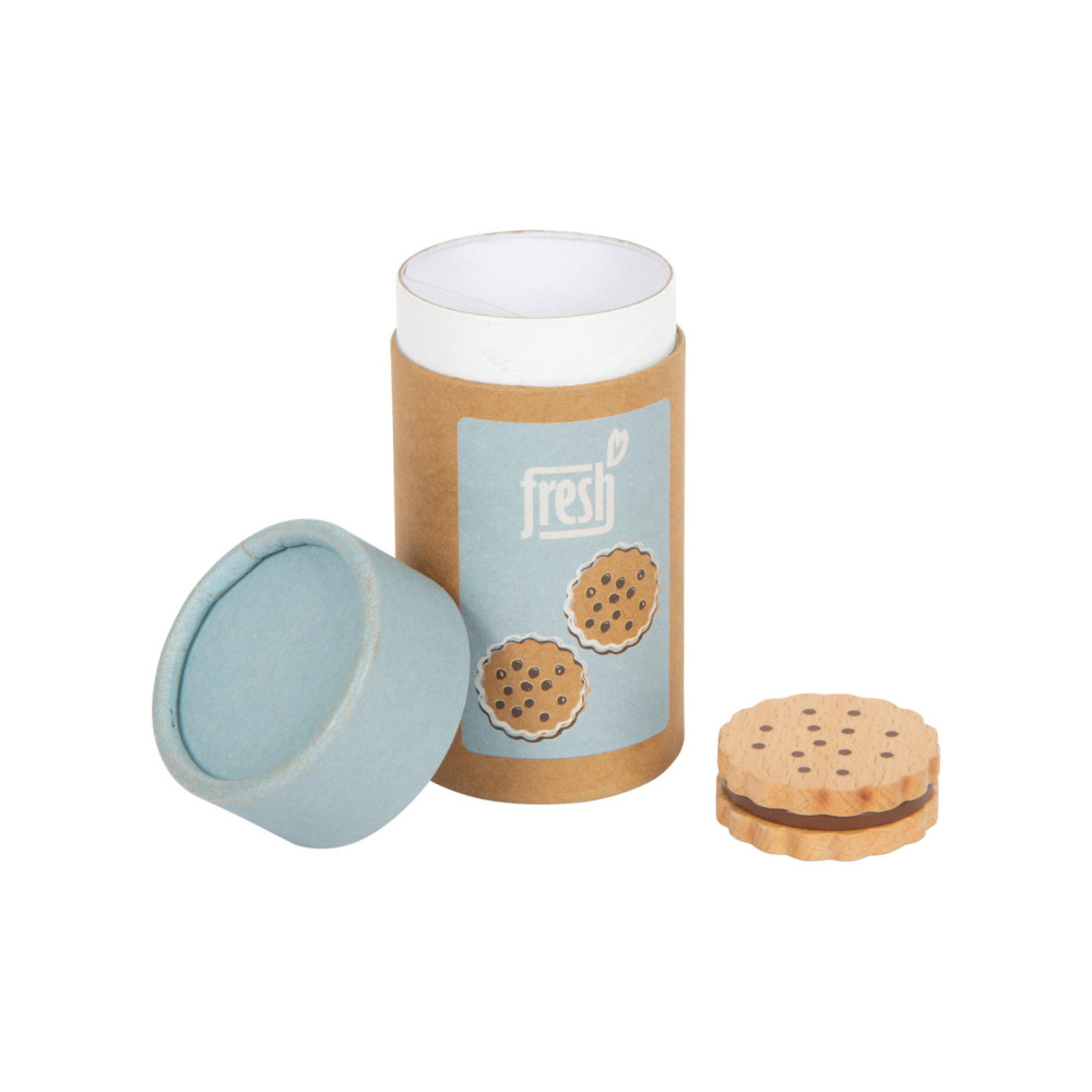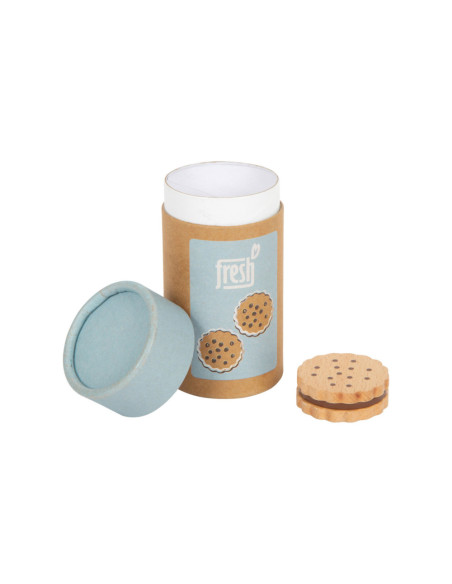Voor kleine koekjesmonsters! Deze 5 robuuste sandwichkoekjes van hout zijn een verrijking voor het snoepassortiment in iedere speelwinkel! Deze koekjes kunnen perfect gepresenteerd worden in de stevige, hersluitbare cilinderdoos van natuurkarton. Door de natuurlijke, realistische uitstraling van deze boterhamkoekjes zijn ze een hit voor het rollenspel in de speelwinkels en speelkeuken! Langdurig speelplezier met houten speelgoedvoeding gegarandeerd.