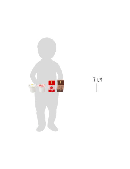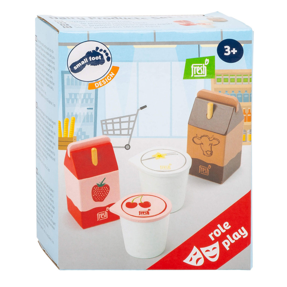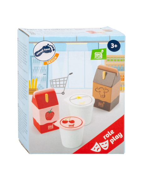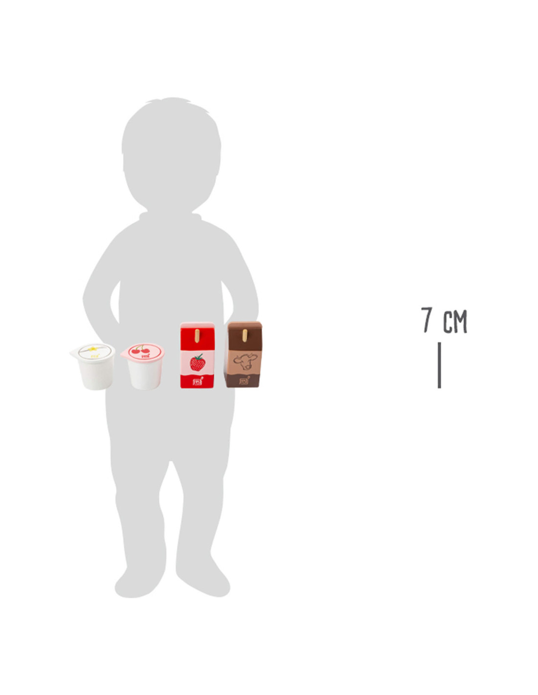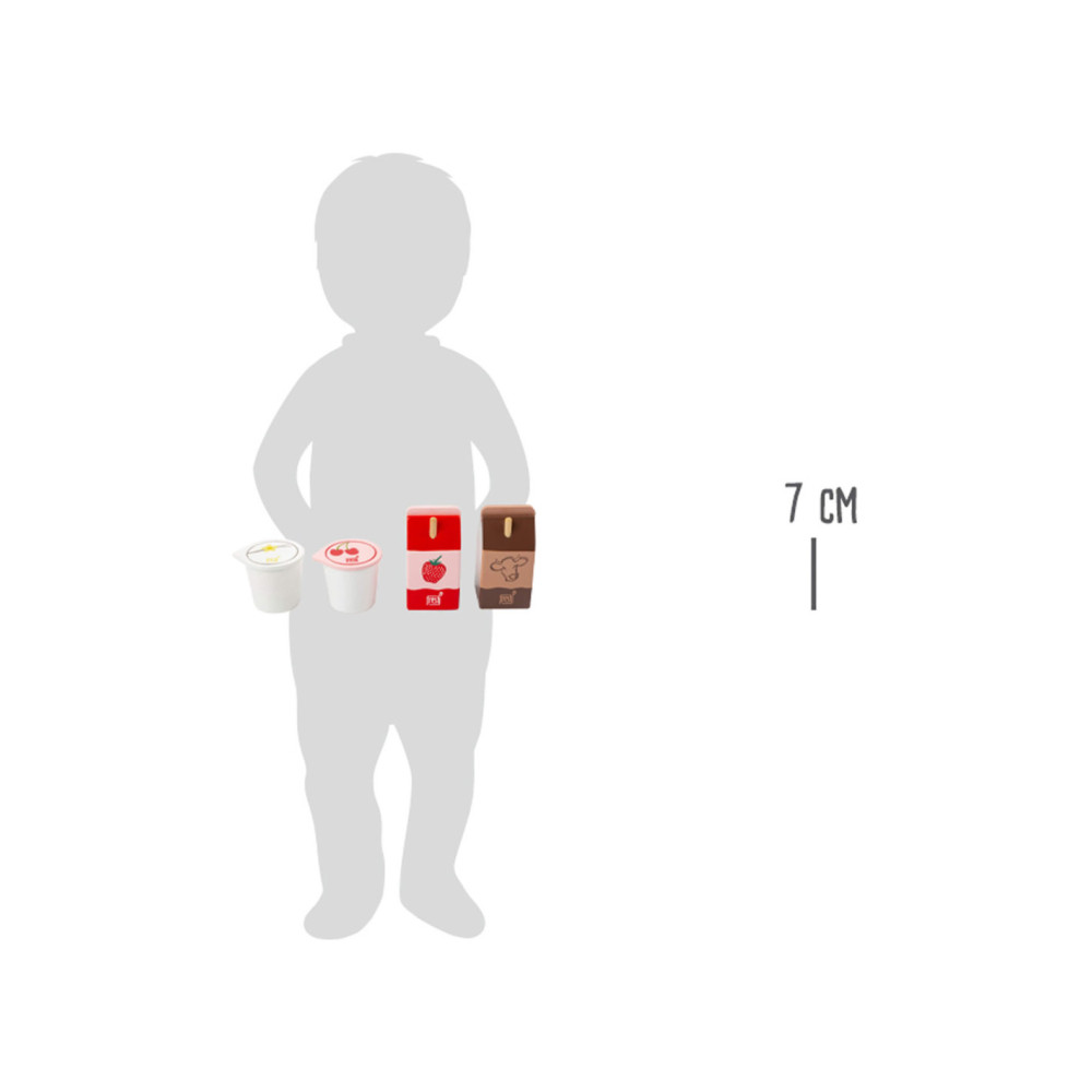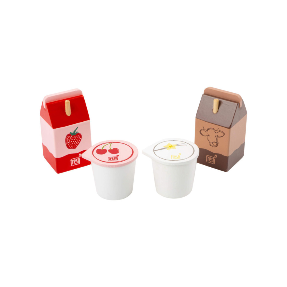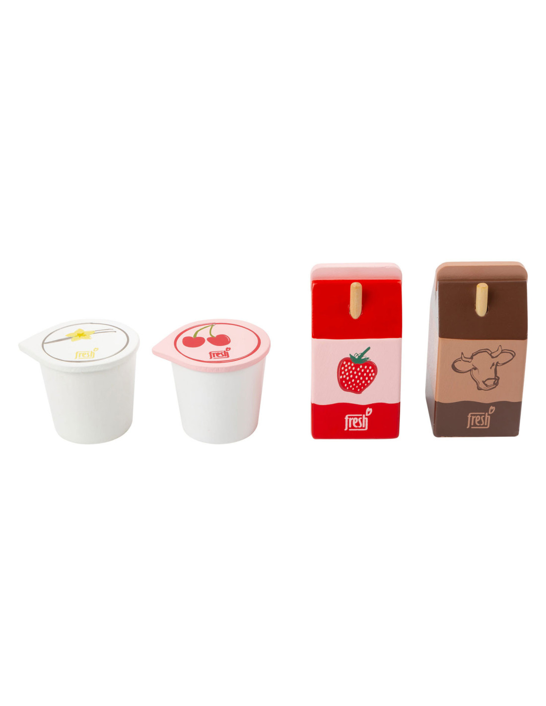 Uit het koelschap en in de winkelwagen! Deze vier houten zuivelproducten zijn de ideale toevoeging aan speelkeukens of speelwinkels. Naast aardbeienmelk is er ook cacao met een rietje en twee lekkere yoghurts met de smaken kers en vanille. De realistische weergave en het vriendelijke kleurontwerp van de producten zijn bijzonder aantrekkelijk voor kinderen. Het stabiele massief hout garandeert bijzonder langdurig speelplezier in de kinderkamer en geeft deze speelgoedzuivelproducten een natuurlijk karakter.
