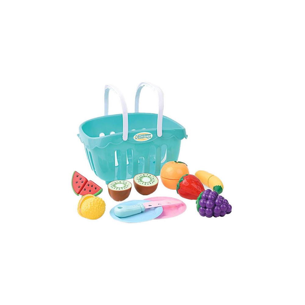 Turquoise winkelmandje gevuld met snijfruit, twee bordjes en een kunststof mesje. Inhoud: meloen, kiwi, banaan, aardbei, druiven en geel drakenfruit.