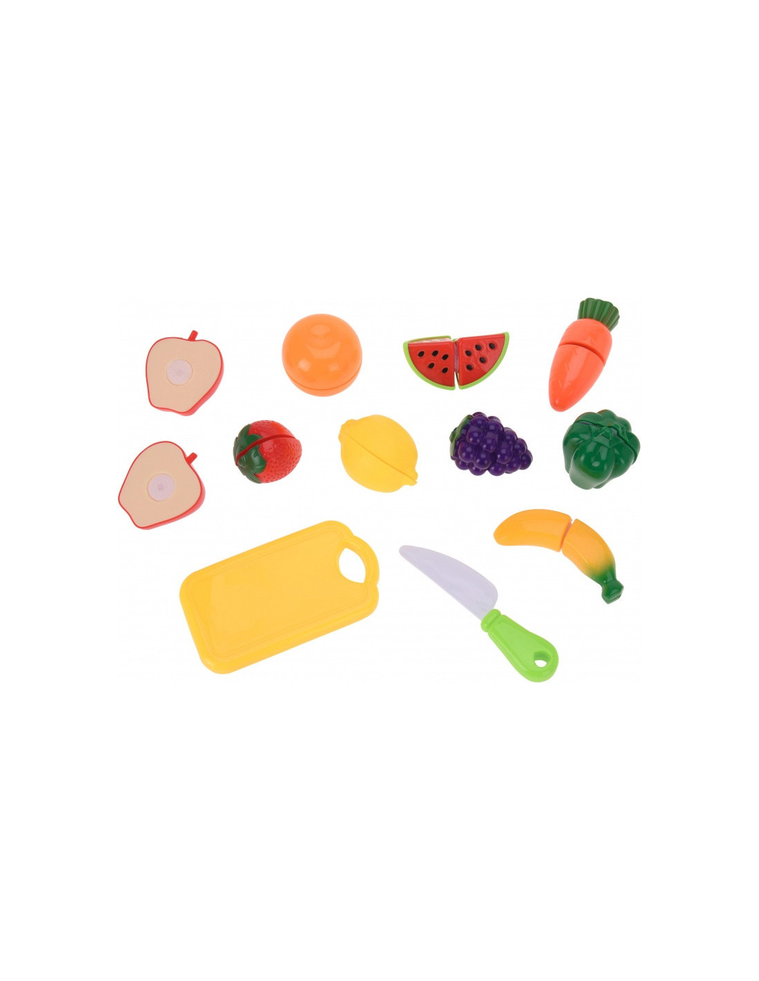 Inhoud: 2 Halve appels 2 Halve aardbeien 2 Halve sinaasappels 2 Halve citroenen 2 Halve wortels 2 Halve paprika's 2 Halve bananen 2 Stukken meloen 1 Druiventros 1 Snijplank 1 Mes