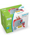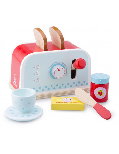 Wie wil er een ontbijtje? Met dit prachtige broodrooster set kan je zelf een heerlijke toast maken. Plaats de sneetjes brood in de toaster, draai aan de knop voor de juiste stand en druk de hendel naar beneden. De set bevat een kleurrijke toaster, kop en schotel, twee plakjes brood, een potje aardbeienjam, een pakje roomboter en een mesje. Dat wordt heerlijk ontbijten, bon appetit! Deze set van New Classic Toys is onderdeel van de Bon Appetit productlijn. Snijden, bakken, koken en aan tafel! De potjes, pannetjes, snijsetjes en keukentjes zijn absolute musthaves voor kleine keukenprinsjes en -prinsesjes.