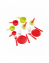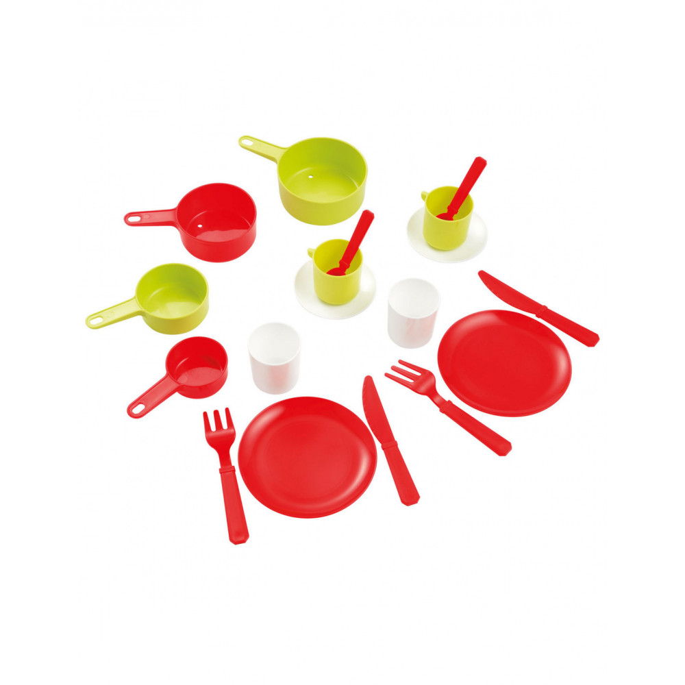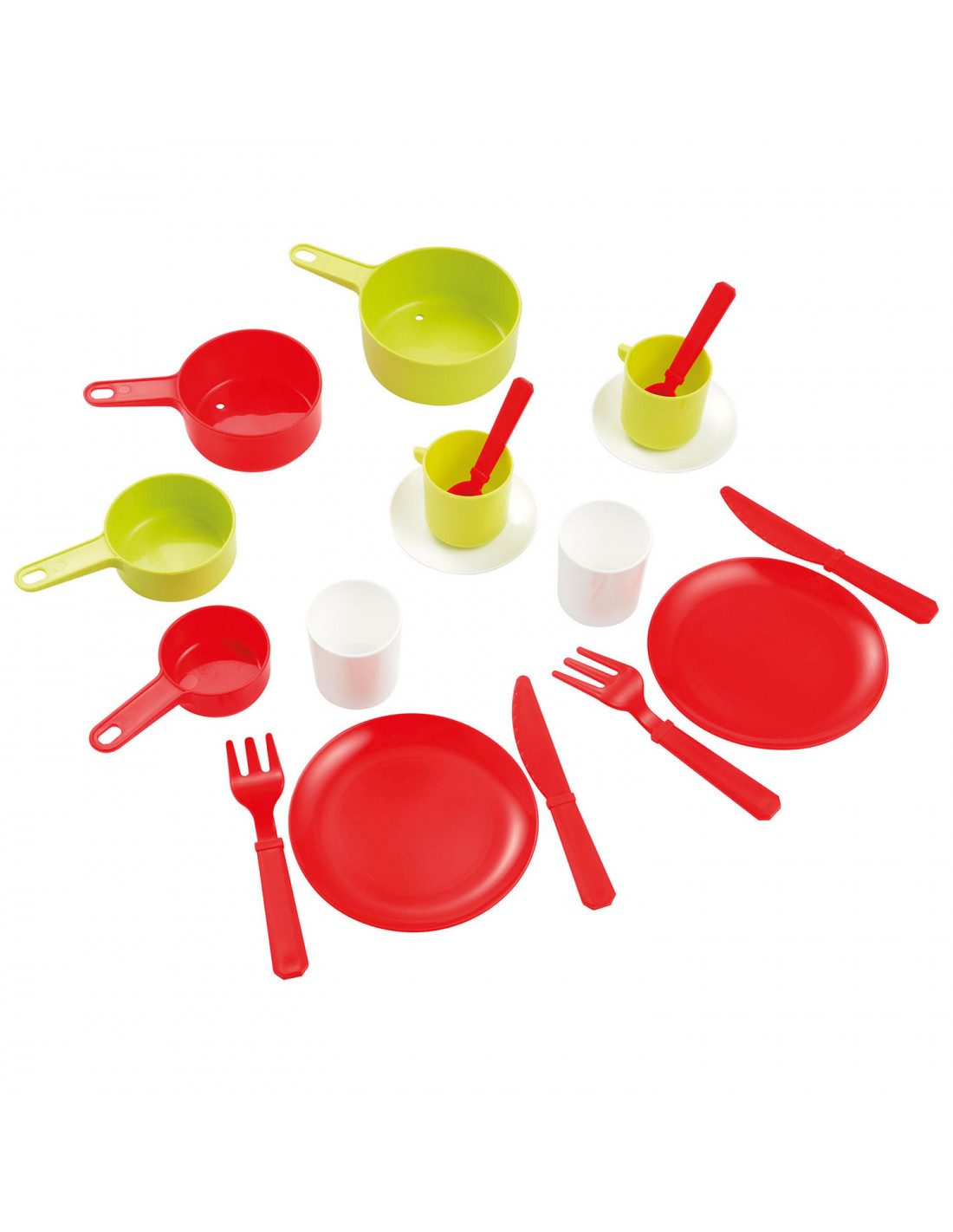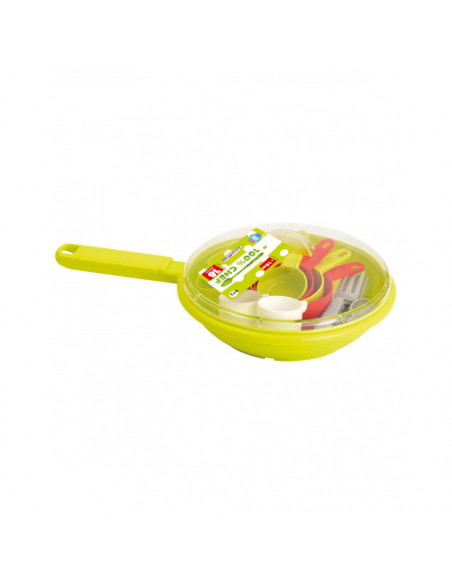 Deze 18-delige groene pan met een doorsnede van 32 centimeter is gevuld met diverse eet-accessoires zoals kopjes, borden bestek.