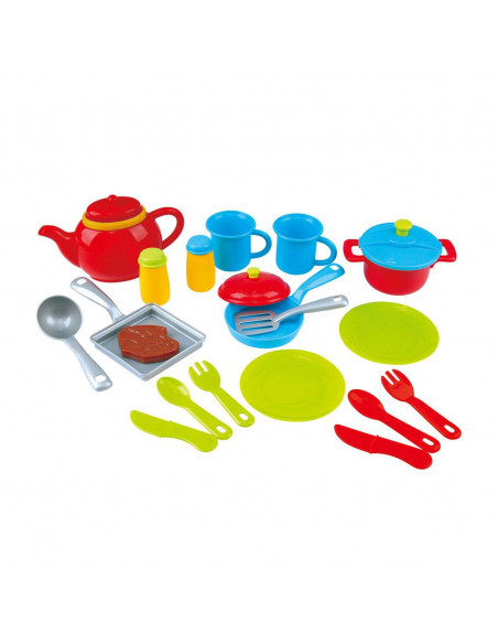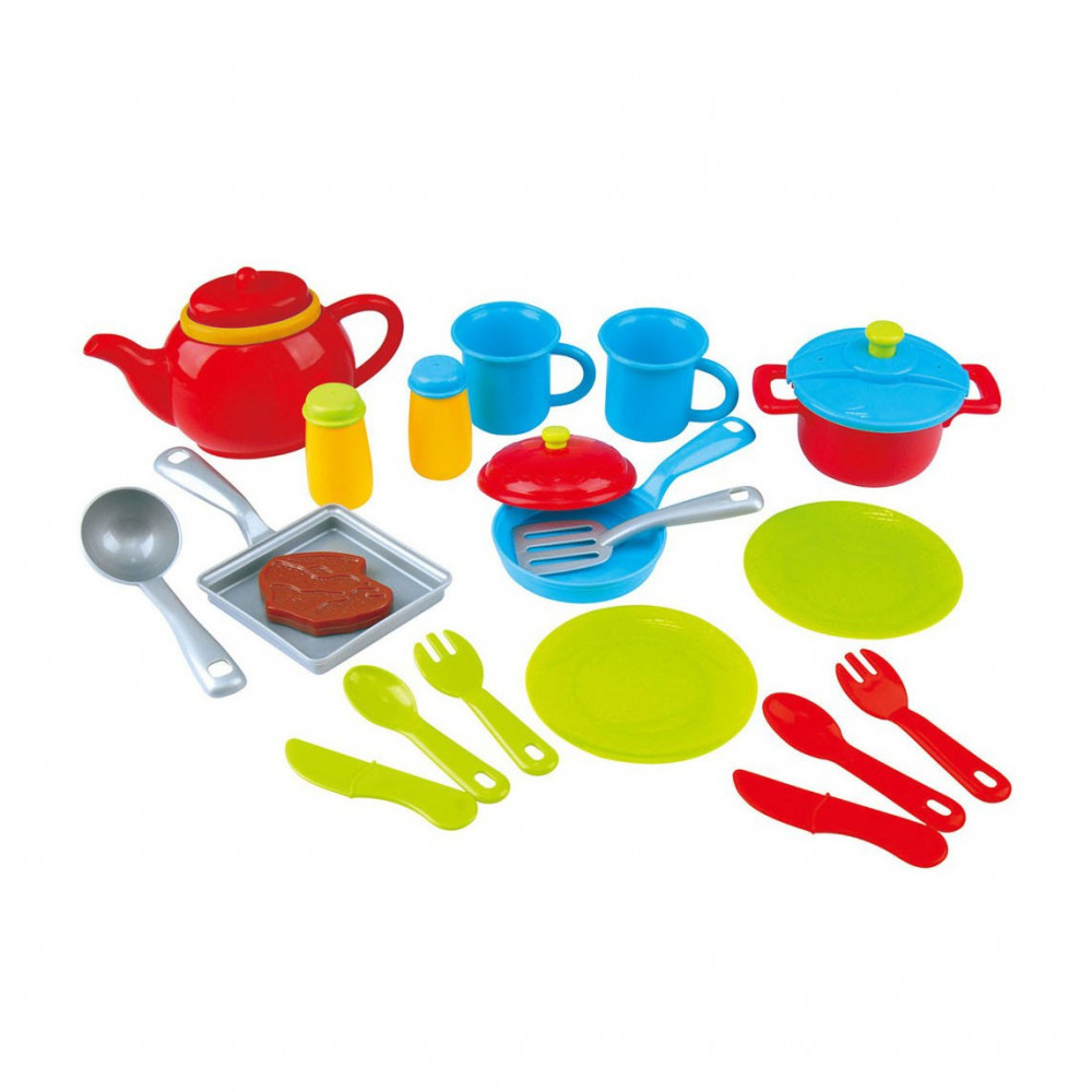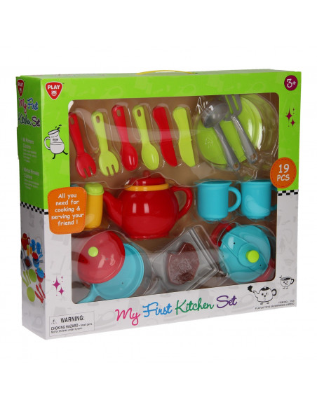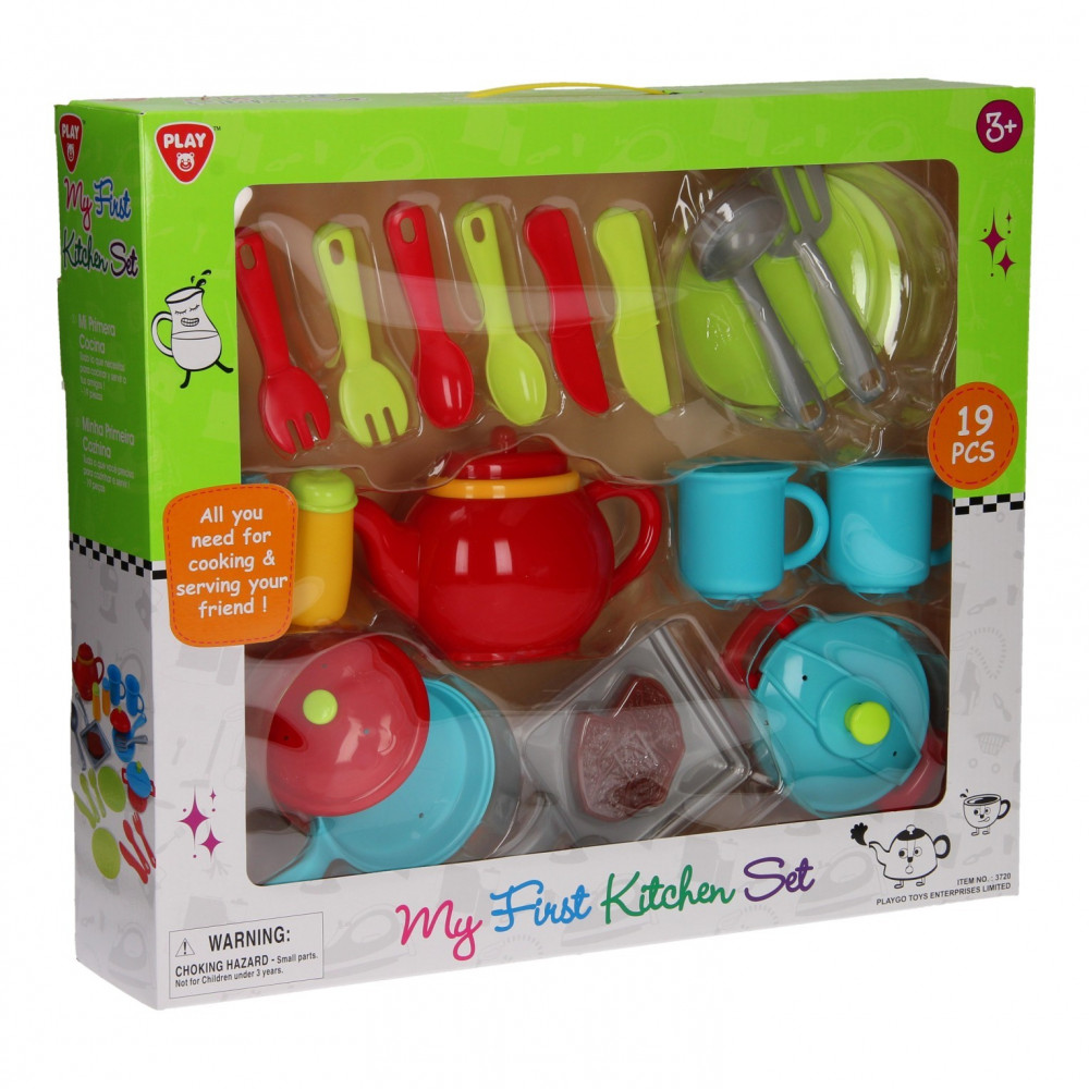 Dit 19 delige Mijn Eerste Keukenset van Playgo is alles wat je nodig hebt om te kokkerellen, te eten en thee te drinken. De set is gemaakt van stevig kunststof en is onmisbaar in je speelkeukentje.