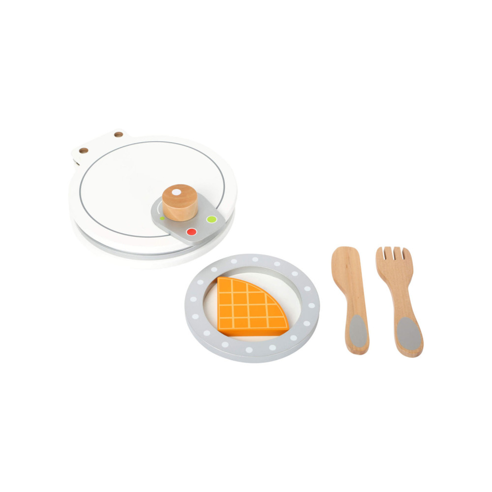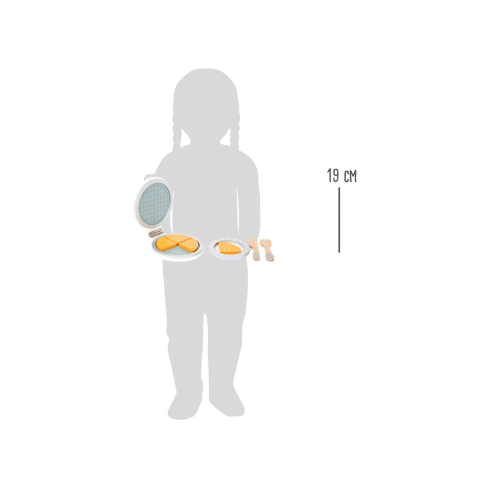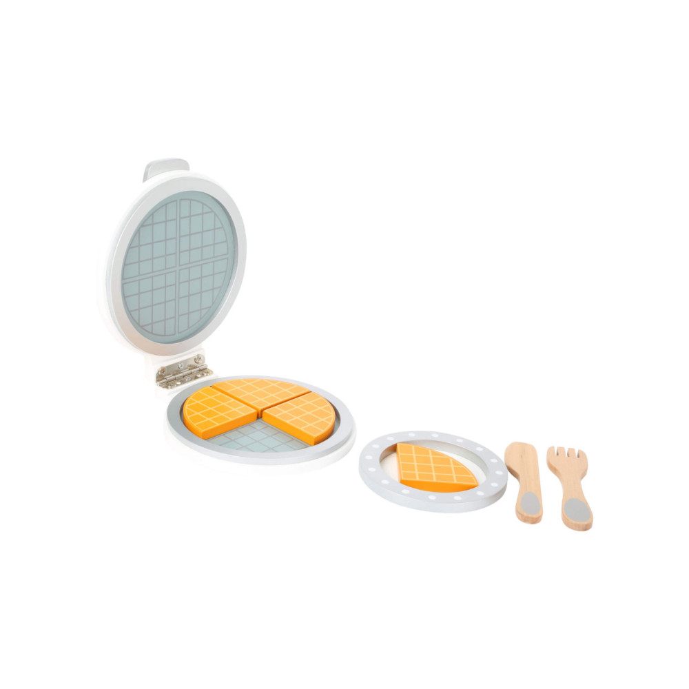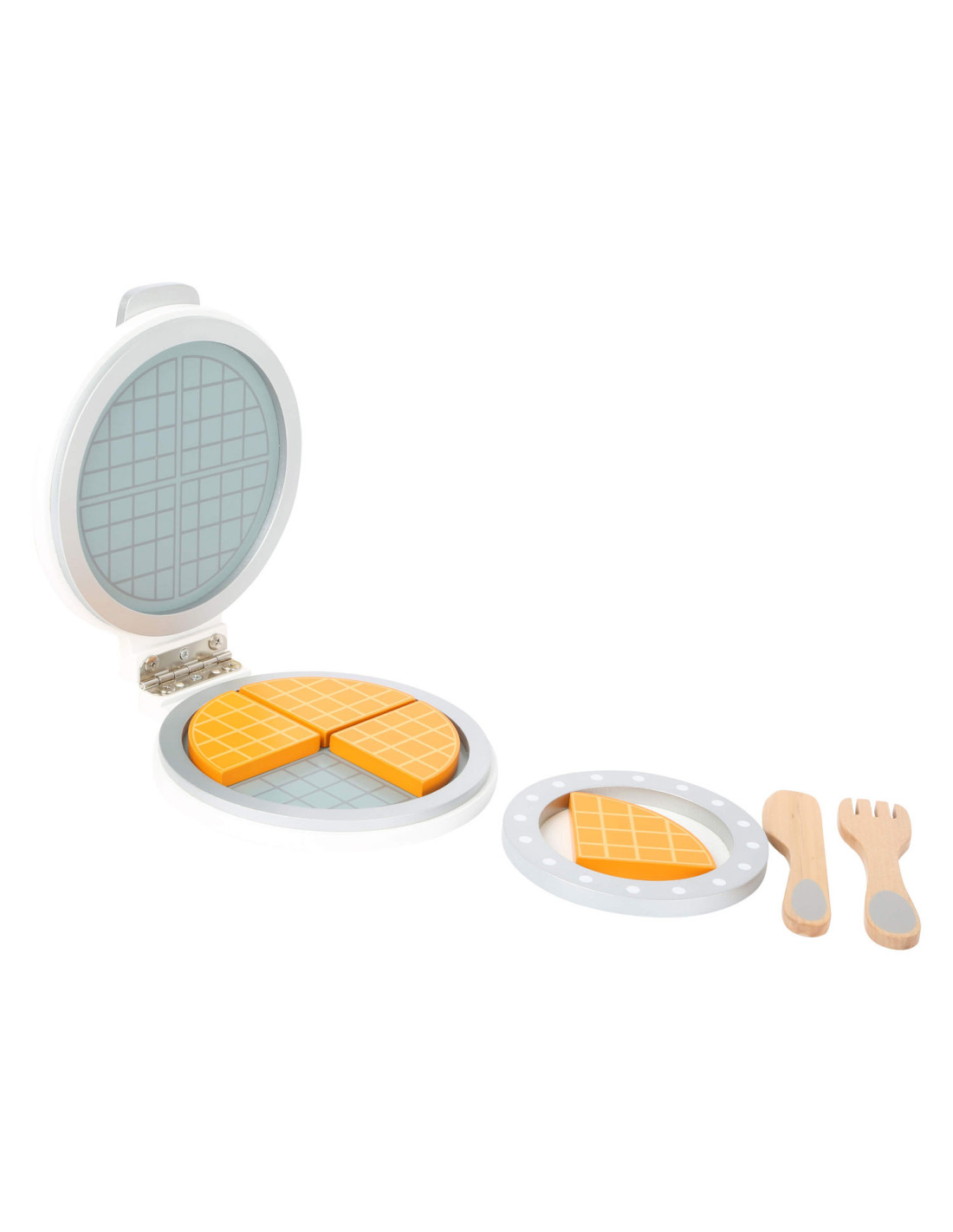 Het is wafeltijd! Alle foodies krijgen hun ontbijt met dit houten wafelijzer. Dit gebruiksvriendelijke keukenapparaat in een modern design hoort thuis in elke speelkeuken! Het oefenwafelijzer wordt geleverd met vier wafelschijven en een bord met bestek. Aan de aan- en uitknop kan worden gedraaid en de kinderen kunnen zelf bepalen of de wafels op zijn of dat ze wat meer tijd nodig hebben. Dus, wie wil er een wafel?