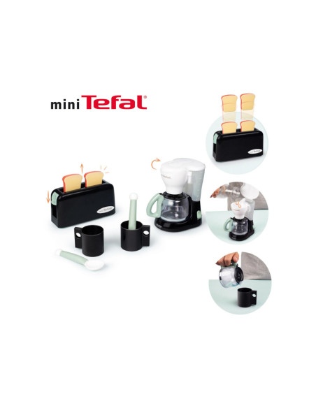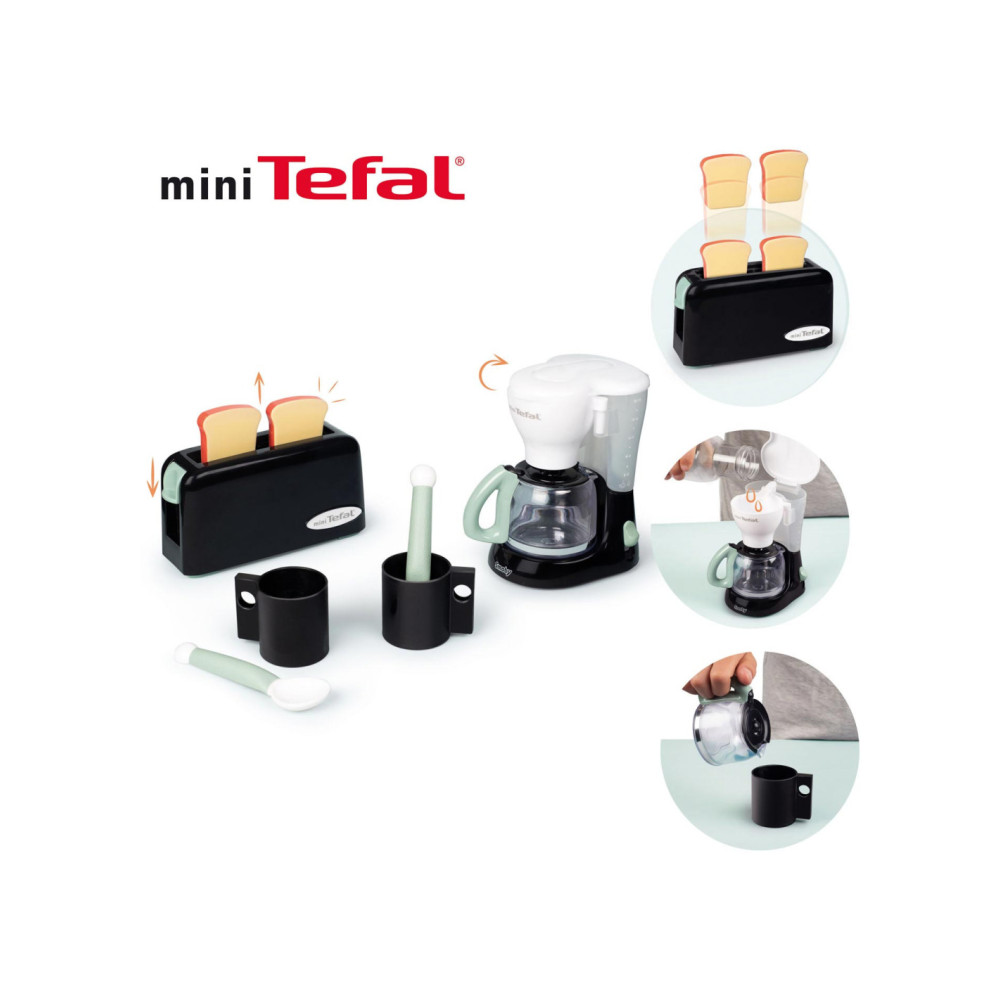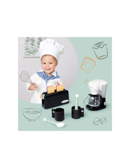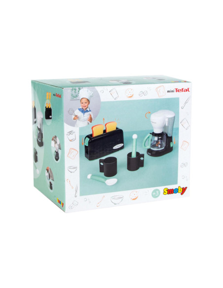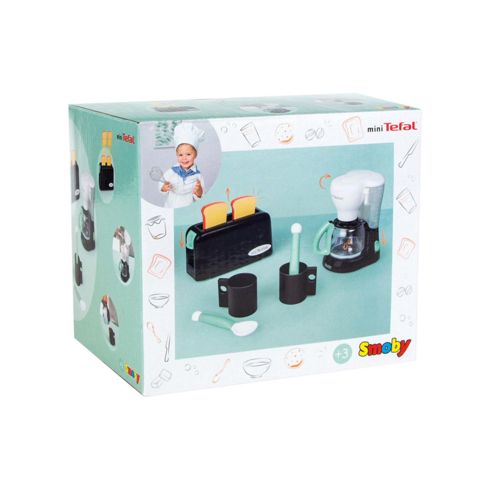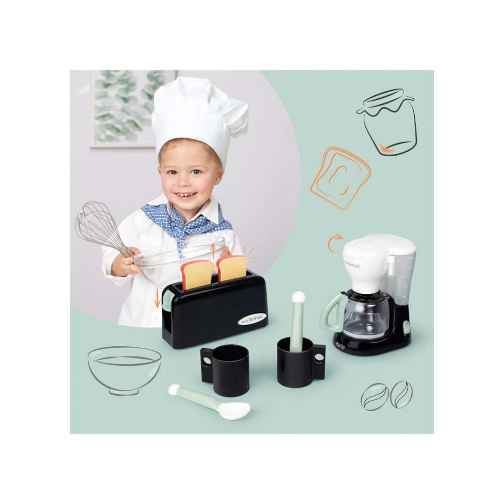 Smoby & Tefal speelgoed ontbijtset. Deze 6-delige set bevat een grill, een espresso-apparaat, koffiezetapparaat, broodrooster en 2 kopjes.