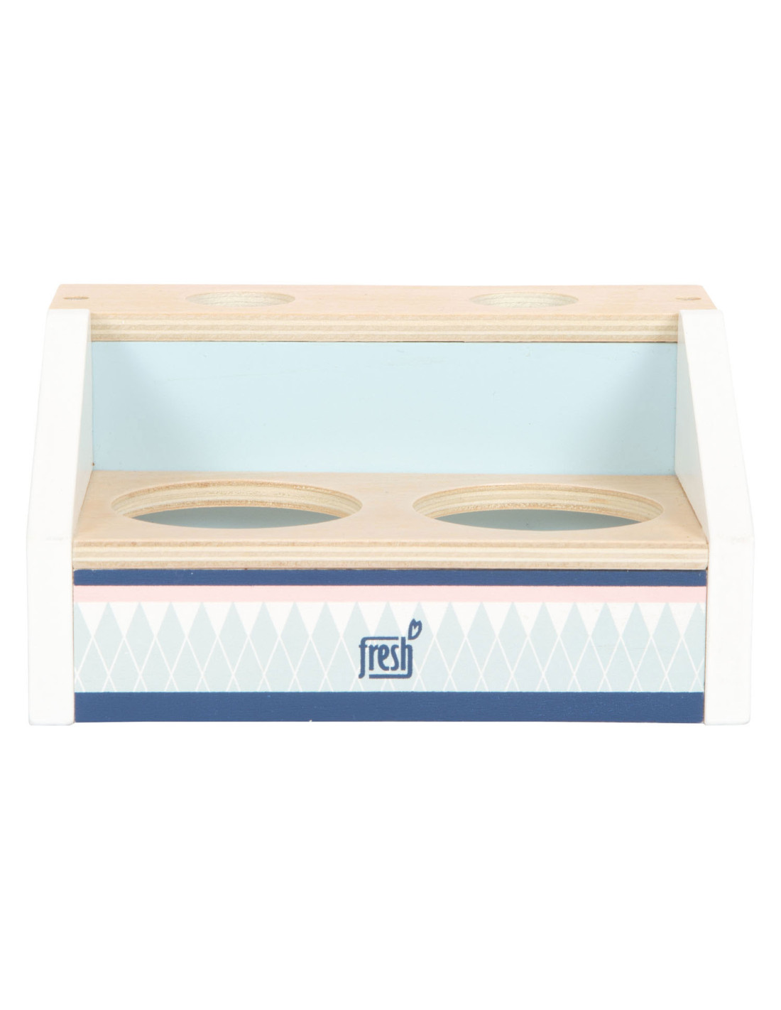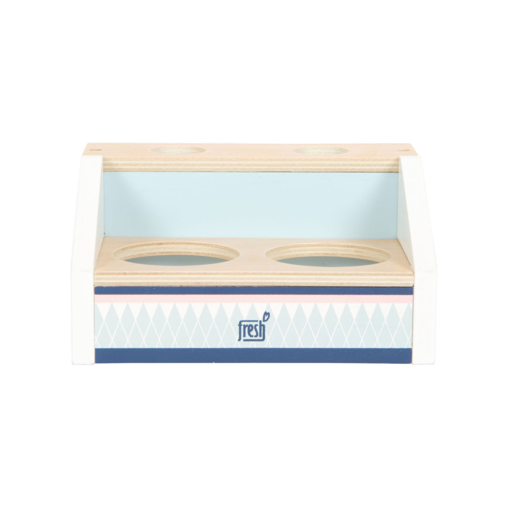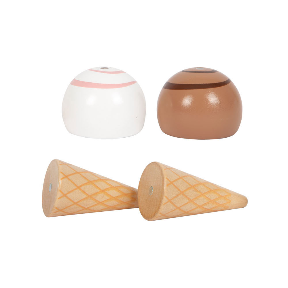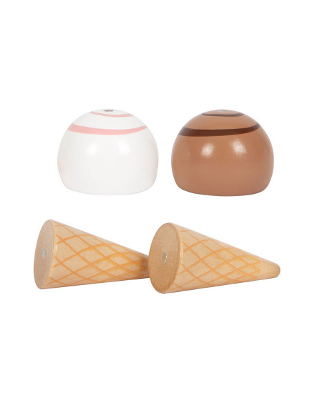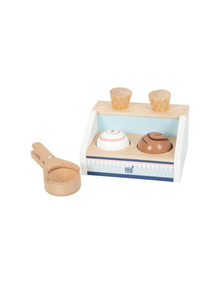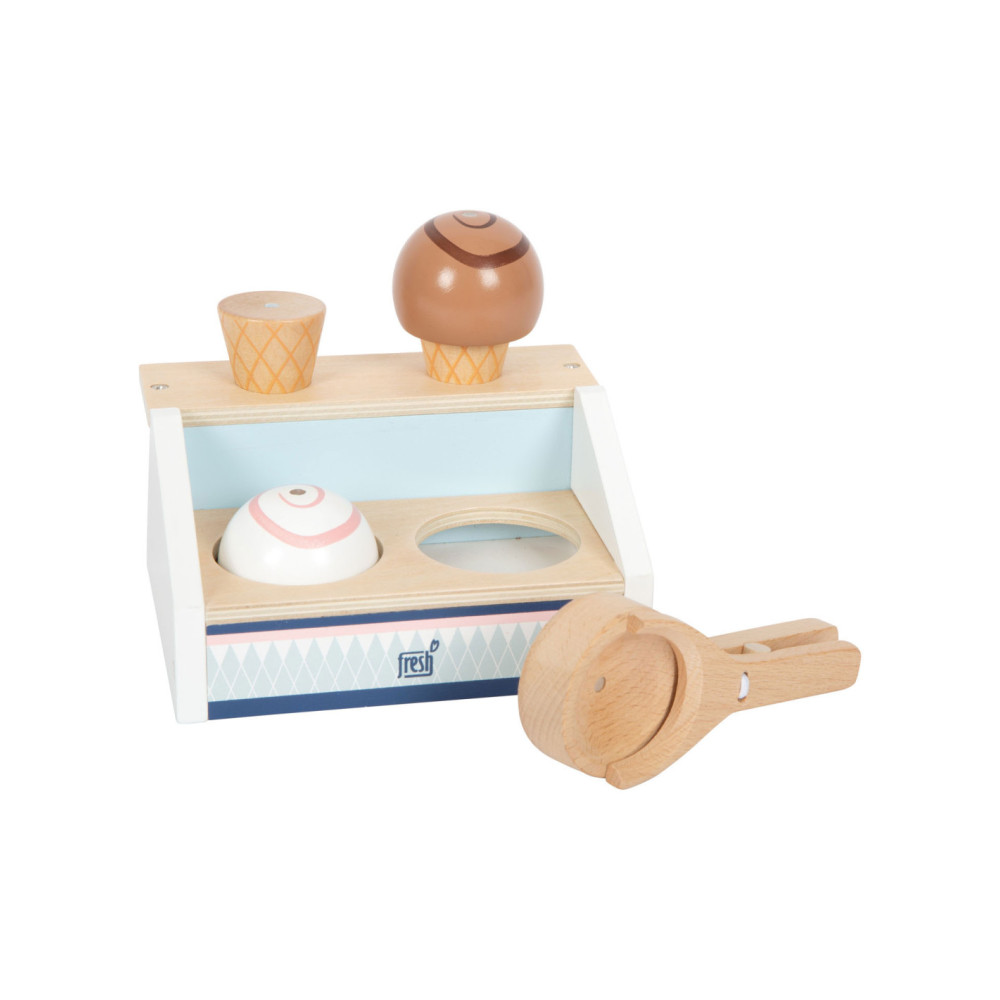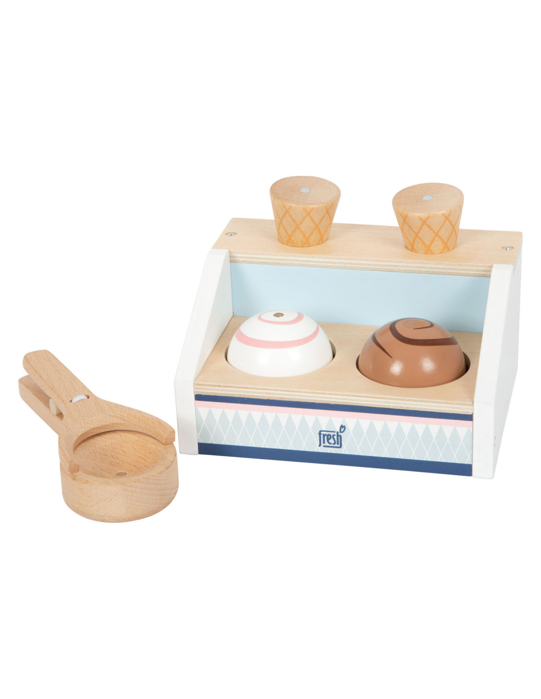 We gaan vandaag ijs eten! Dit is het kleinere zusje van de "fresh" IJskraam en past perfect in kleine speelkeukens of als aanvulling op de speelgoedwinkel in de kinderkamer, dankzij het minimalistische ontwerp en het gebruik van natuurlijk houtmateriaal. De twee bollen ijs, twee ijshoorntjes en de ijslepel met magneten zijn zo ontworpen dat je de bollen ijs gemakkelijk uit de ijscompartimenten kunt halen en op de hoorntjes kunt plaatsen. Dankzij de magneten kunnen beide ijsbollen ook op elkaar worden gestapeld. Het hoogtepunt van de speelset is de magnetische ijslepel - met een simpele druk op de knop kun je het ijs op het hoorntje plaatsen!