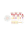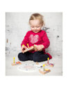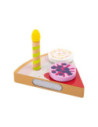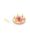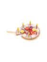 Deze houten verjaardagstaart ziet er bijzonder smakelijk uit! Met zes houten kaarsen, felgekleurde versieringen en een stabiele serveerschaal laat deze taart een sterke indruk achter. Klittenbandstukken houden de toppings en individuele taartstukken bij elkaar die gemakkelijk kunnen worden gescheiden en geserveerd met de taartschep. Kinderen kunnen tijdens actief rollenspel hun fantasie de vrije loop laten en hun poppen en favoriete knuffels een passend feest bezorgen met vrienden en familie. Versieren met de flexibele taartdecoraties traint ook de fijne motoriek.