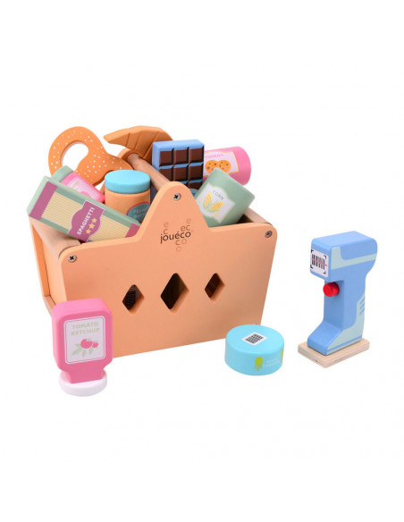Joueco houten winkelmandje vol met allerlei voedingsmiddelen. Inclusief barcodes en scanner. Geschikt vanaf 3 jaar.