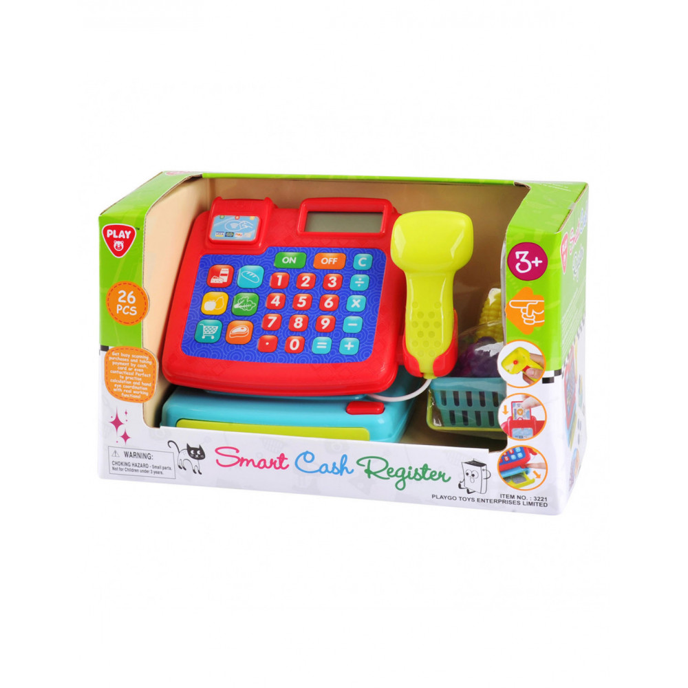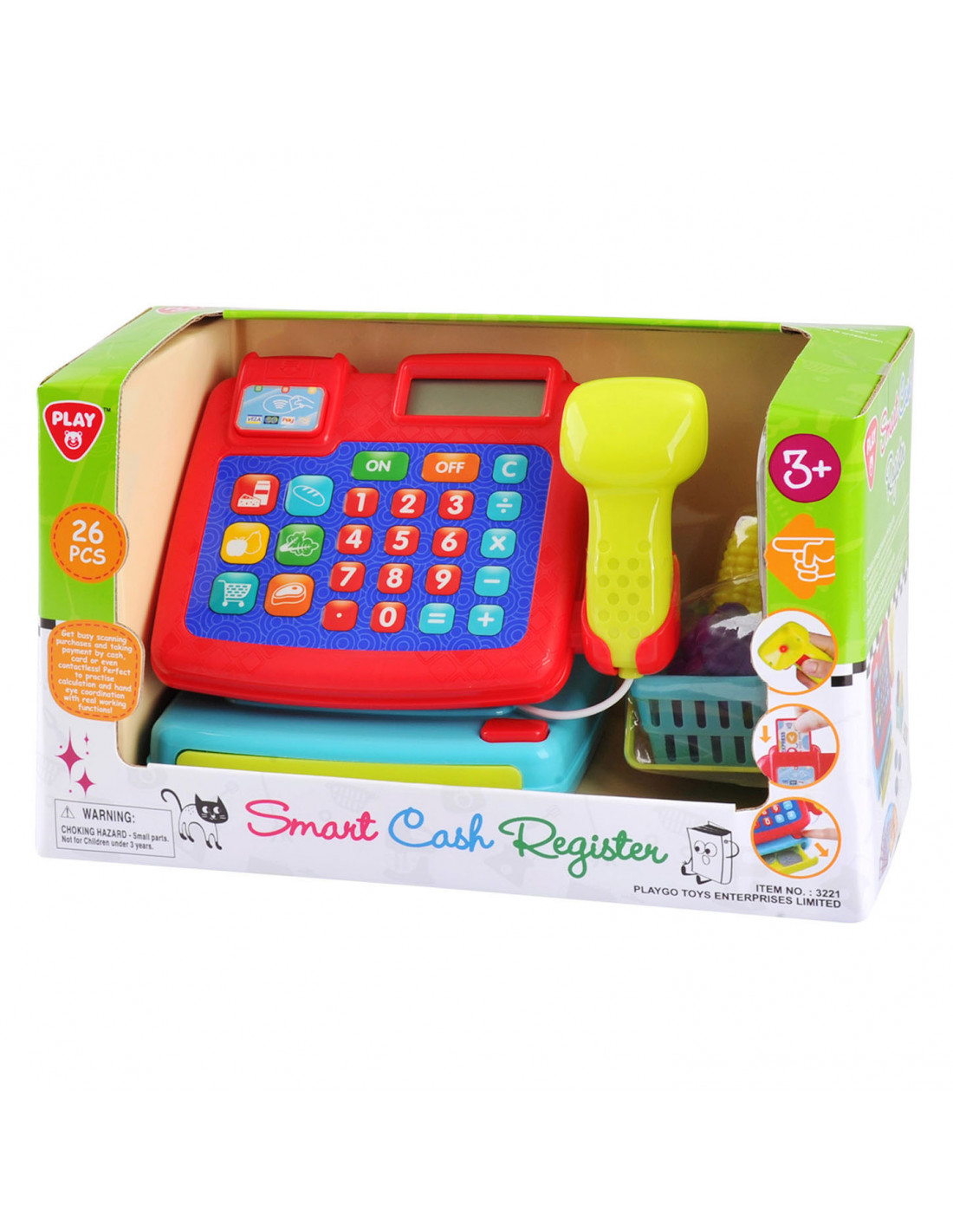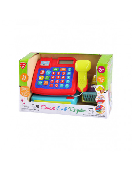 Slimme 26-delige speelgoedkassa van Play met realistische functies zoals een handscanner met licht en geluid, kassalade en werkende calculator. Wordt geleverd met accessoires zoals speelgeld, een boodschappenmandje en speelgoedboodschappen. 2 AA-batterijen inbegrepen.