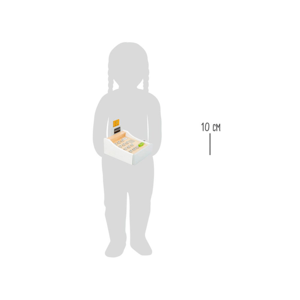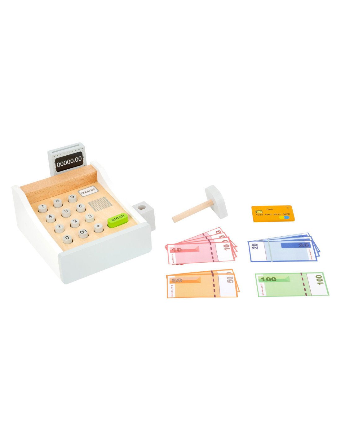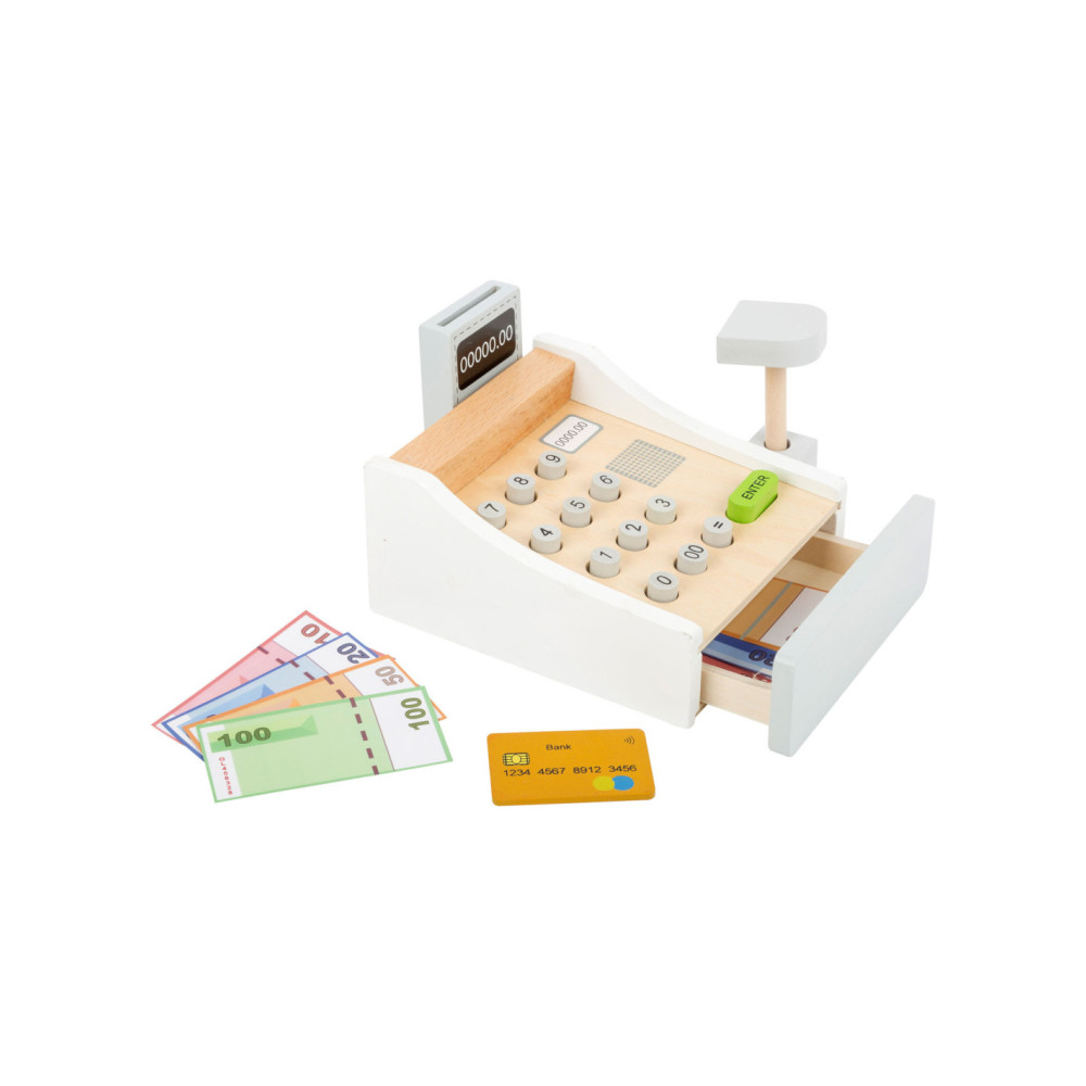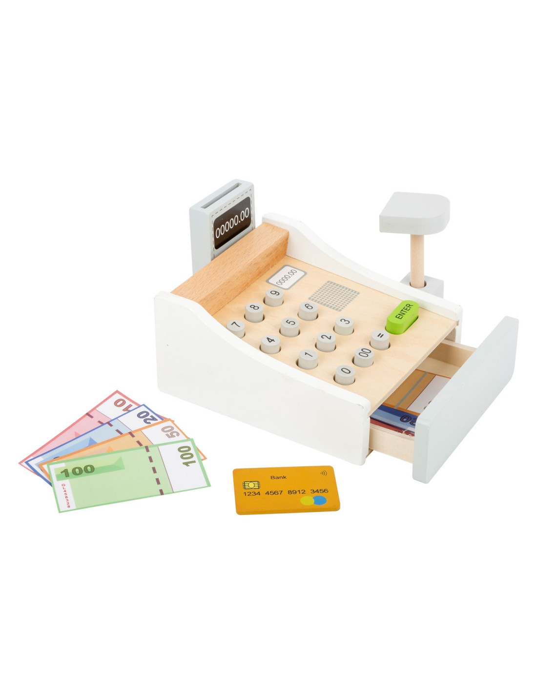 Het geld stroomt binnen! Deze mooie houten kassa hoort thuis in elke overzichtelijke kinderspeelwinkel. Spelen met dit speelgoed traint een kind in het omgaan met geld en het begrijpen van prijzen. Het meegeleverde speelgeld en de houten creditcards passen in de uittrekbare geldlade. De prijs voor gekochte waren kan zelfs op het toetsenbord worden ingevoerd. Wie is de volgende in de rij?