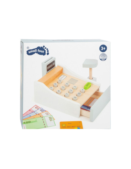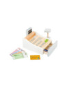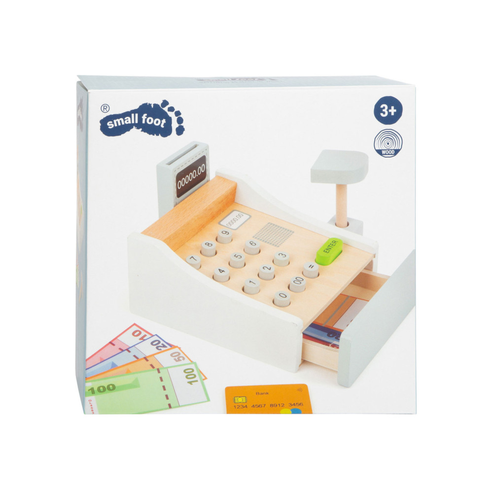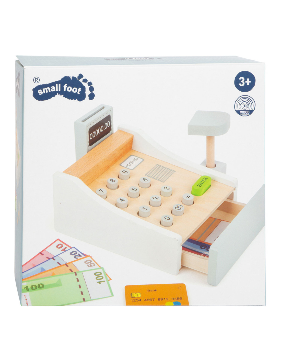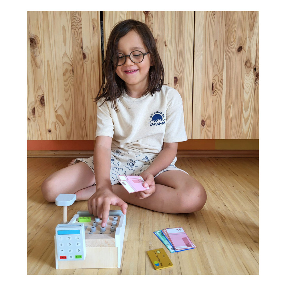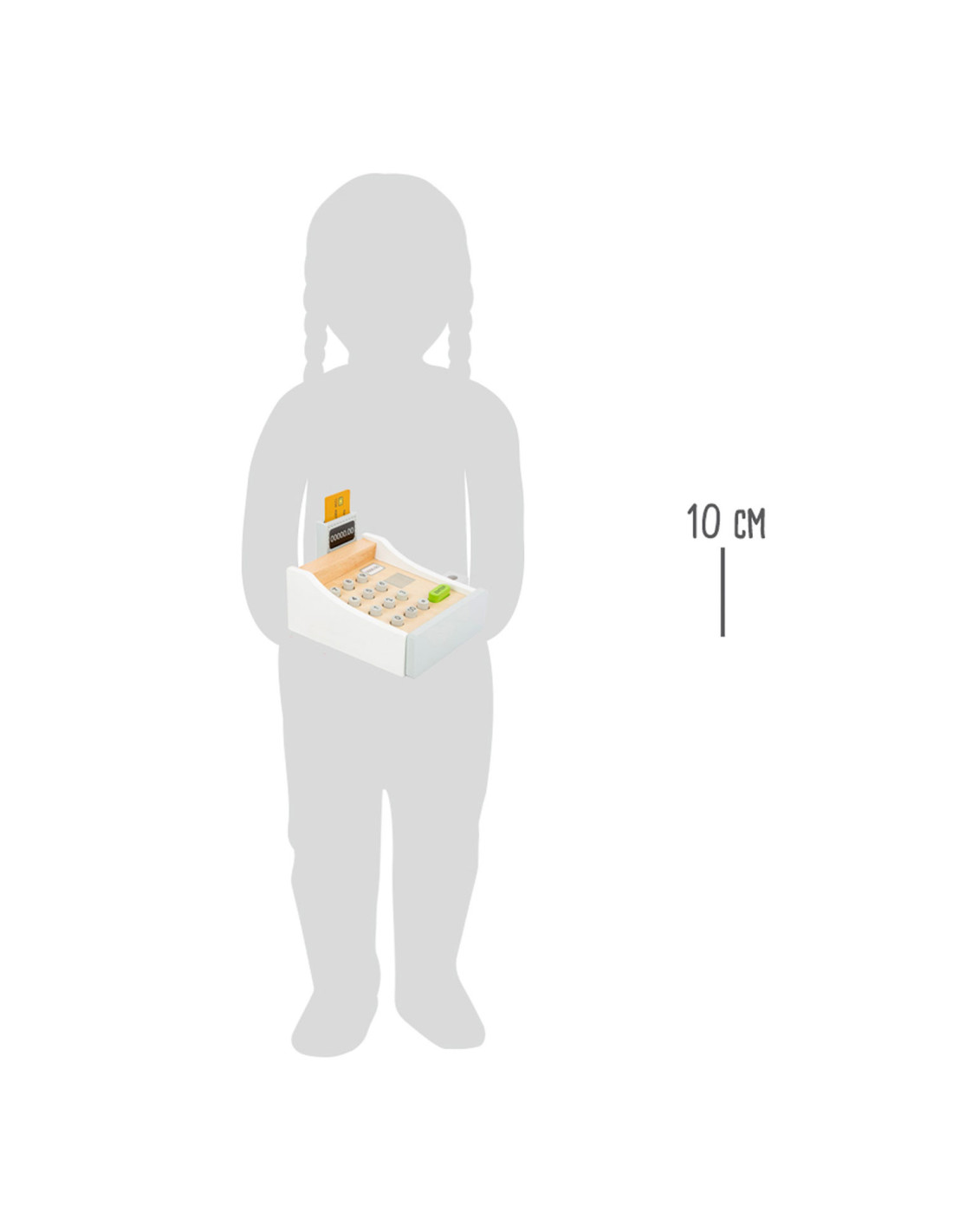 Het geld stroomt binnen! Deze mooie houten kassa hoort thuis in elke overzichtelijke kinderspeelwinkel. Spelen met dit speelgoed traint een kind in het omgaan met geld en het begrijpen van prijzen. Het meegeleverde speelgeld en de houten creditcards passen in de uittrekbare geldlade. De prijs voor gekochte waren kan zelfs op het toetsenbord worden ingevoerd. Wie is de volgende in de rij?