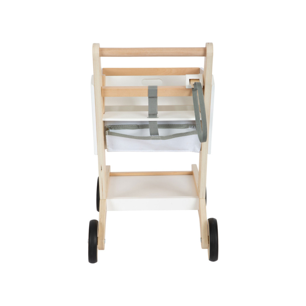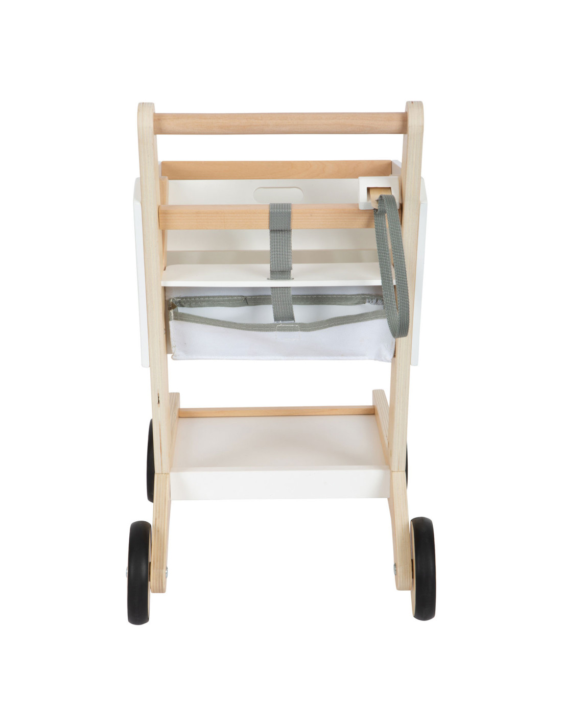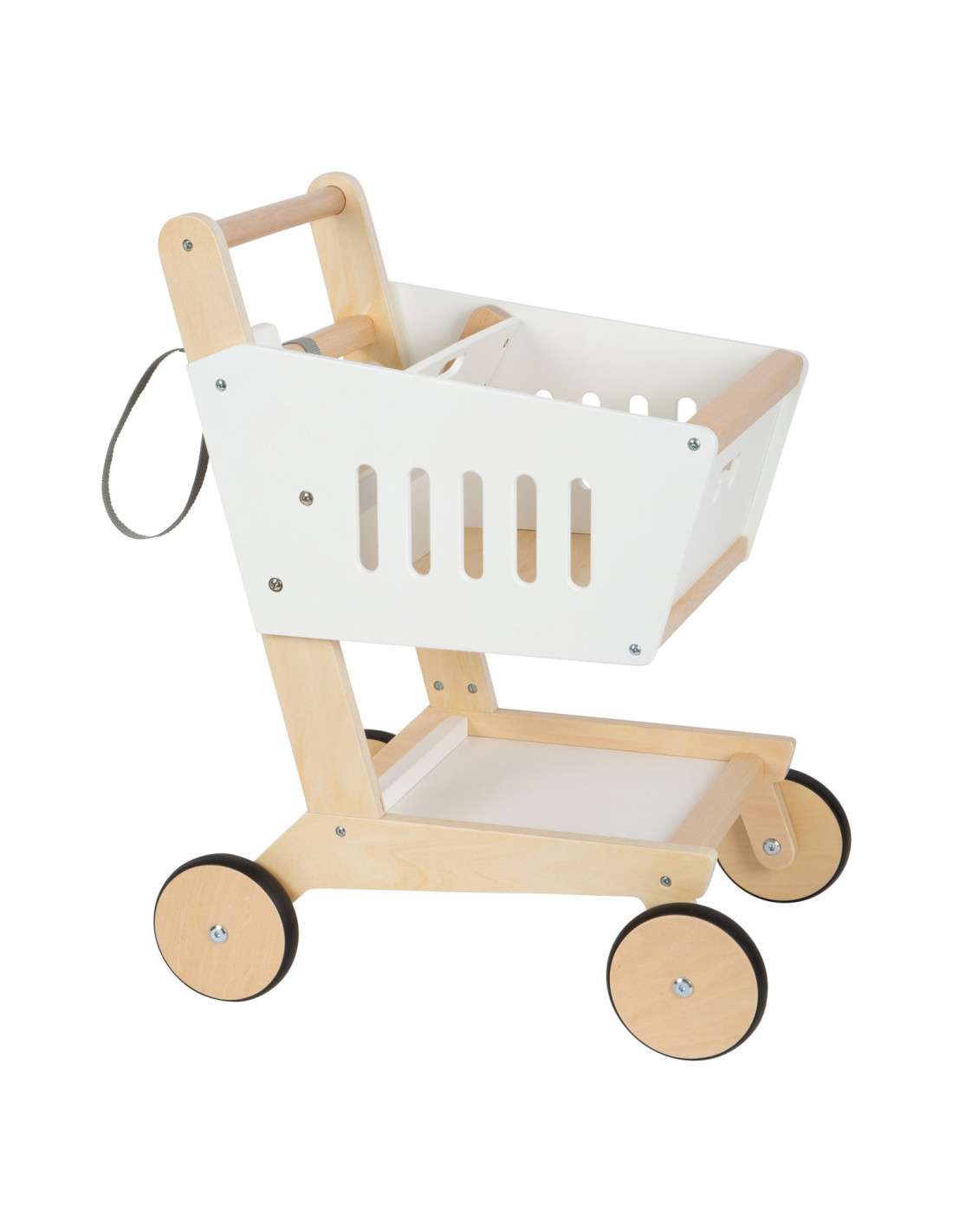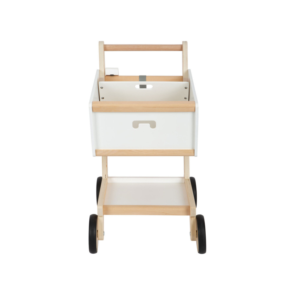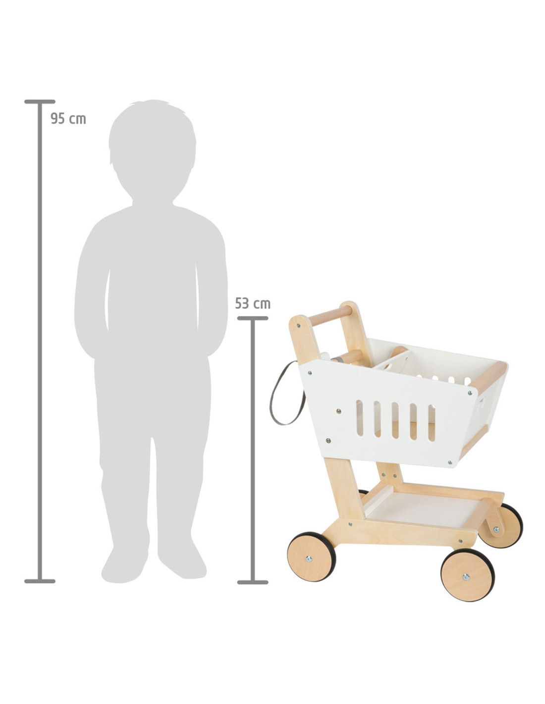 Maak van de volgende shopping trip een ware shopping experience met deze speelgoed boodschappentrolley van stevig hout met rubberen wielen. Net als in een echte supermarkt steek je de magnetische winkelchip in de houder en het kopen kan beginnen! De ruime trolleymand biedt ook voldoende ruimte als er veel op het boodschappenlijstje staat en het onderste gedeelte onder de mand kan worden gebruikt om bijvoorbeeld drankkratten in te vervoeren. Knuffels, poppen en hun vriendjes kunnen in het verplaatsbare kinderzitje rijden en speelgeld voor de boodschappen kan veilig opgeborgen worden in het kleine tasje op de trolley. De uitsparing aan de voorzijde van de trolley kan worden gebruikt om een boodschappentas op te hangen. De met rubber beklede wielen laten geen sporen na op gevoelige vloeroppervlakken en maken nauwelijks geluid, waardoor deze stevige staande boodschappentrolley een favoriet van het hele gezin is bij rollenspellen in de winkel. Het is extra gemakkelijk om te duwen met de zacht aanvoelende houten grepen! En een tip: deze moderne, genderneutrale winkelgenoot is ook nog eens heel handig om thuis snel de kinderkamer op te ruimen!