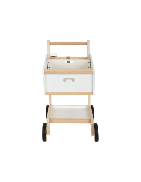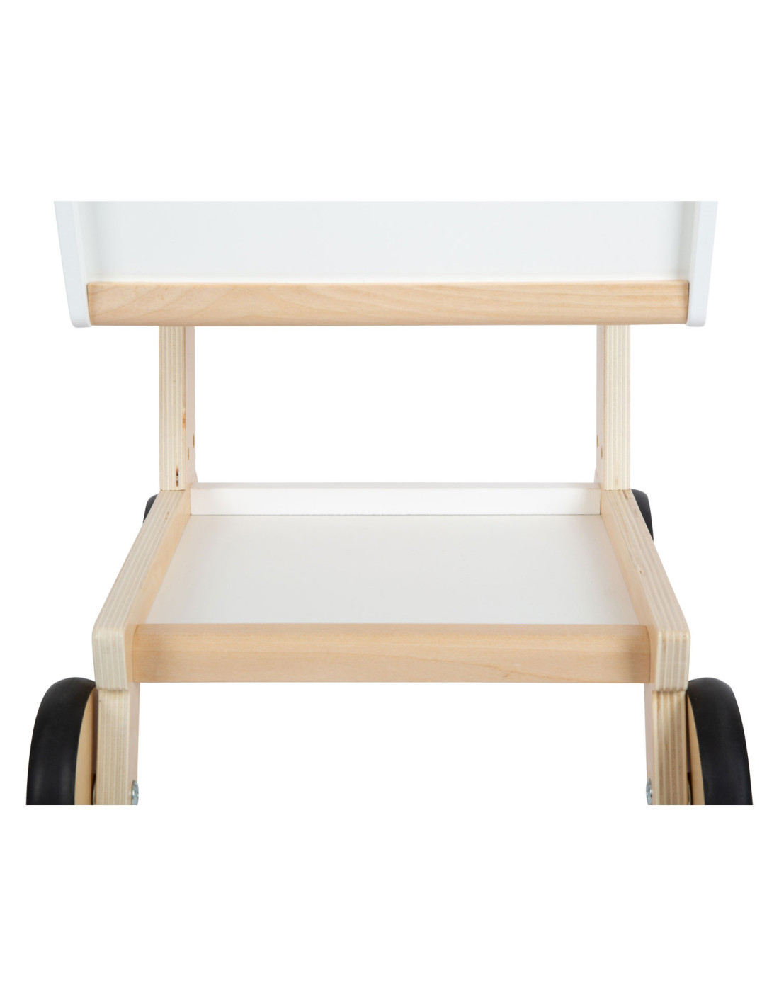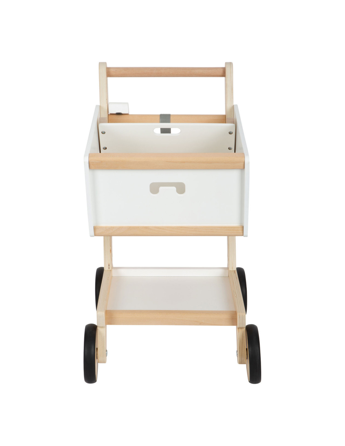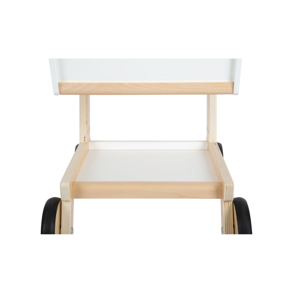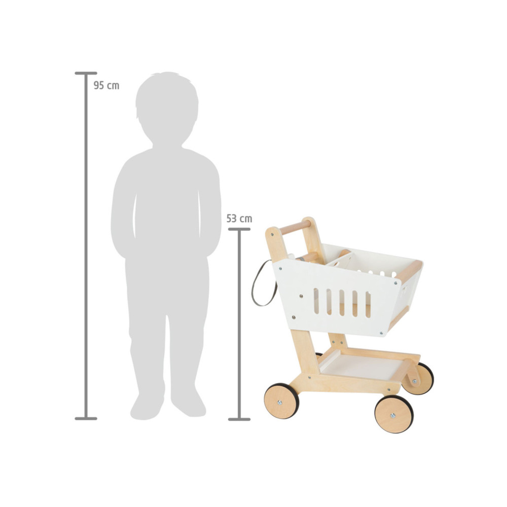 Maak van de volgende shopping trip een ware shopping experience met deze speelgoed boodschappentrolley van stevig hout met rubberen wielen. Net als in een echte supermarkt steek je de magnetische winkelchip in de houder en het kopen kan beginnen! De ruime trolleymand biedt ook voldoende ruimte als er veel op het boodschappenlijstje staat en het onderste gedeelte onder de mand kan worden gebruikt om bijvoorbeeld drankkratten in te vervoeren. Knuffels, poppen en hun vriendjes kunnen in het verplaatsbare kinderzitje rijden en speelgeld voor de boodschappen kan veilig opgeborgen worden in het kleine tasje op de trolley. De uitsparing aan de voorzijde van de trolley kan worden gebruikt om een boodschappentas op te hangen. De met rubber beklede wielen laten geen sporen na op gevoelige vloeroppervlakken en maken nauwelijks geluid, waardoor deze stevige staande boodschappentrolley een favoriet van het hele gezin is bij rollenspellen in de winkel. Het is extra gemakkelijk om te duwen met de zacht aanvoelende houten grepen! En een tip: deze moderne, genderneutrale winkelgenoot is ook nog eens heel handig om thuis snel de kinderkamer op te ruimen!