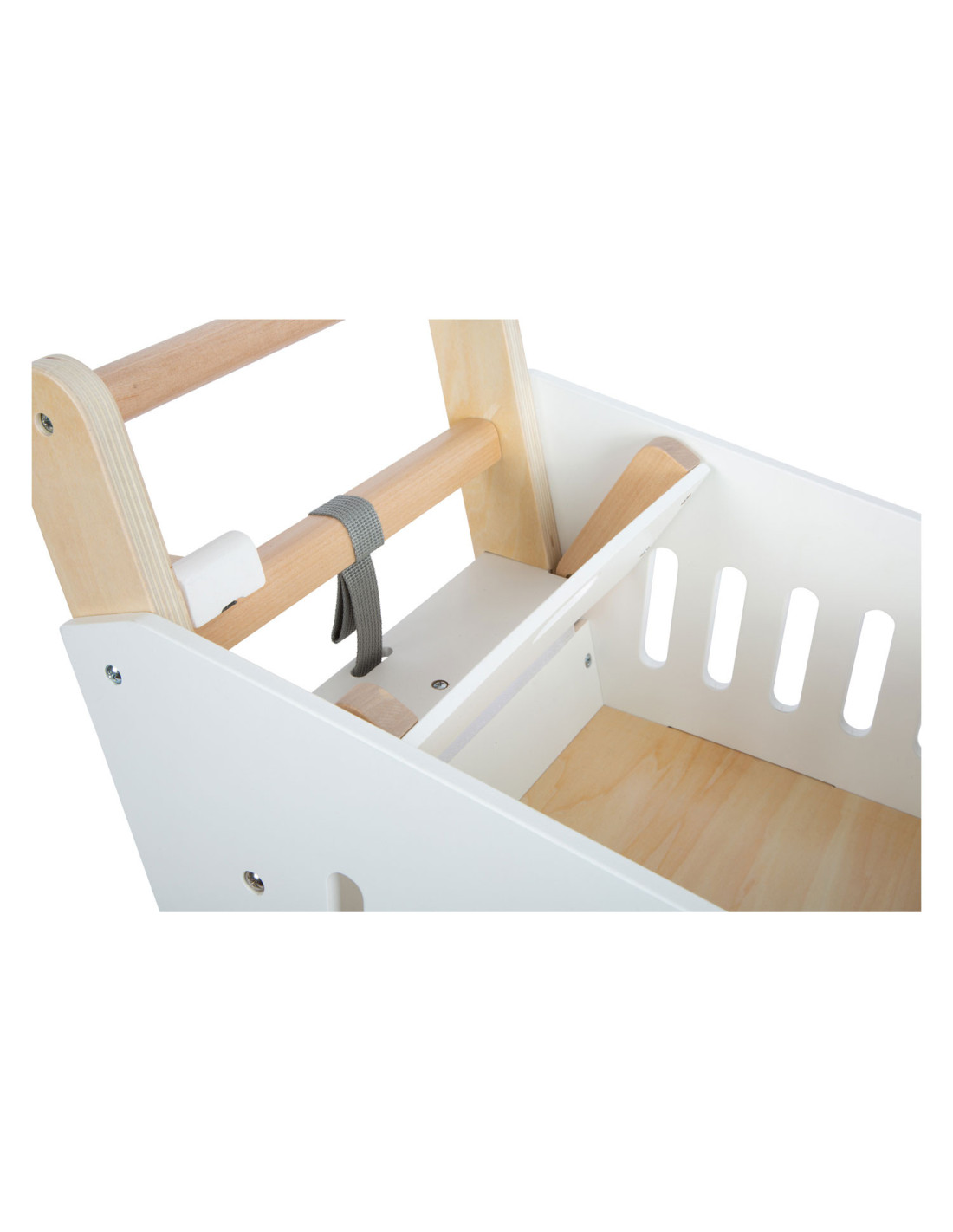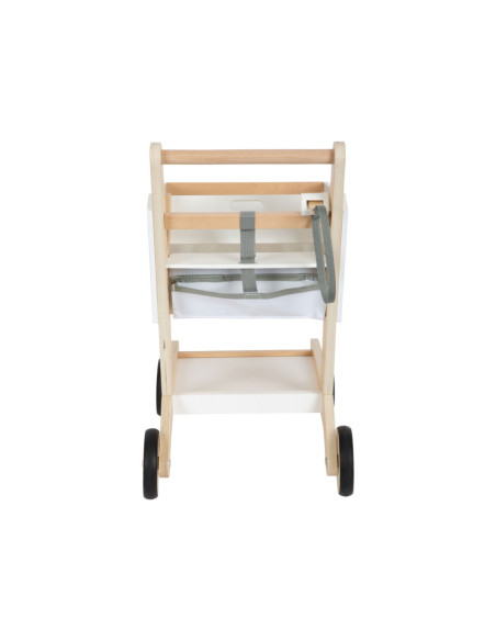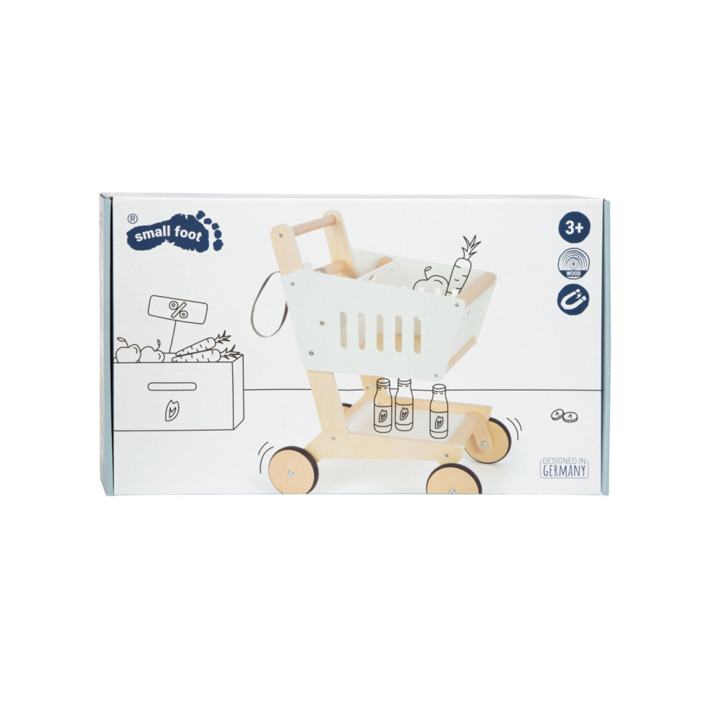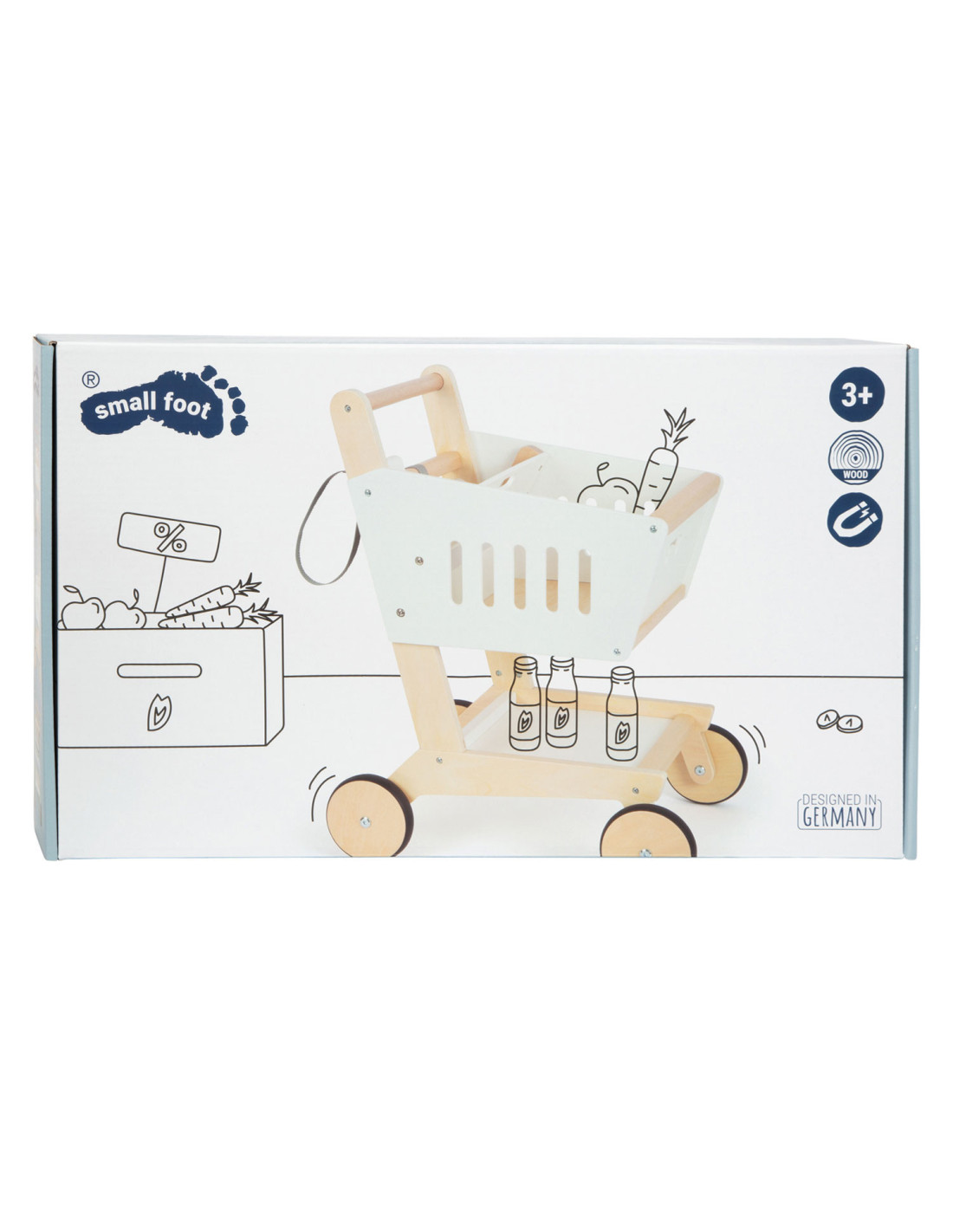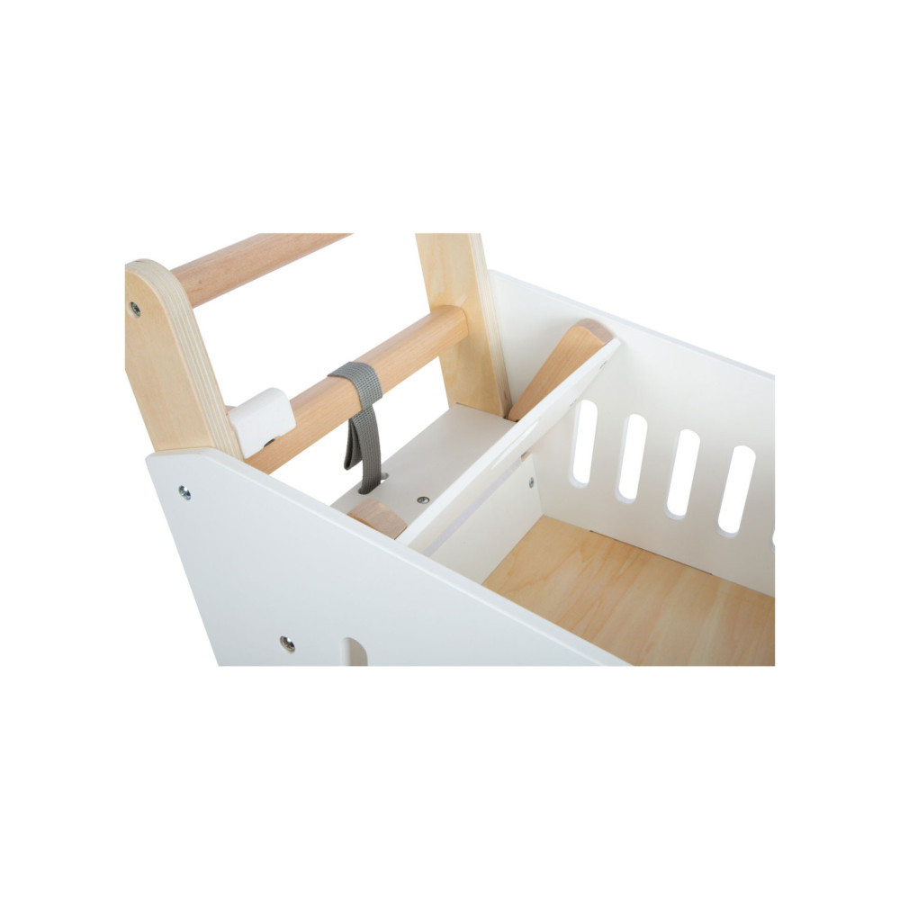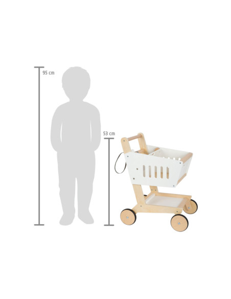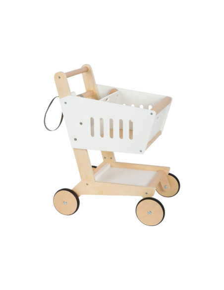 Maak van de volgende shopping trip een ware shopping experience met deze speelgoed boodschappentrolley van stevig hout met rubberen wielen. Net als in een echte supermarkt steek je de magnetische winkelchip in de houder en het kopen kan beginnen! De ruime trolleymand biedt ook voldoende ruimte als er veel op het boodschappenlijstje staat en het onderste gedeelte onder de mand kan worden gebruikt om bijvoorbeeld drankkratten in te vervoeren. Knuffels, poppen en hun vriendjes kunnen in het verplaatsbare kinderzitje rijden en speelgeld voor de boodschappen kan veilig opgeborgen worden in het kleine tasje op de trolley. De uitsparing aan de voorzijde van de trolley kan worden gebruikt om een boodschappentas op te hangen. De met rubber beklede wielen laten geen sporen na op gevoelige vloeroppervlakken en maken nauwelijks geluid, waardoor deze stevige staande boodschappentrolley een favoriet van het hele gezin is bij rollenspellen in de winkel. Het is extra gemakkelijk om te duwen met de zacht aanvoelende houten grepen! En een tip: deze moderne, genderneutrale winkelgenoot is ook nog eens heel handig om thuis snel de kinderkamer op te ruimen!