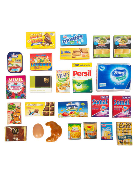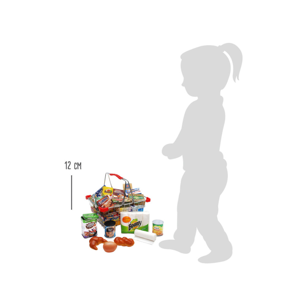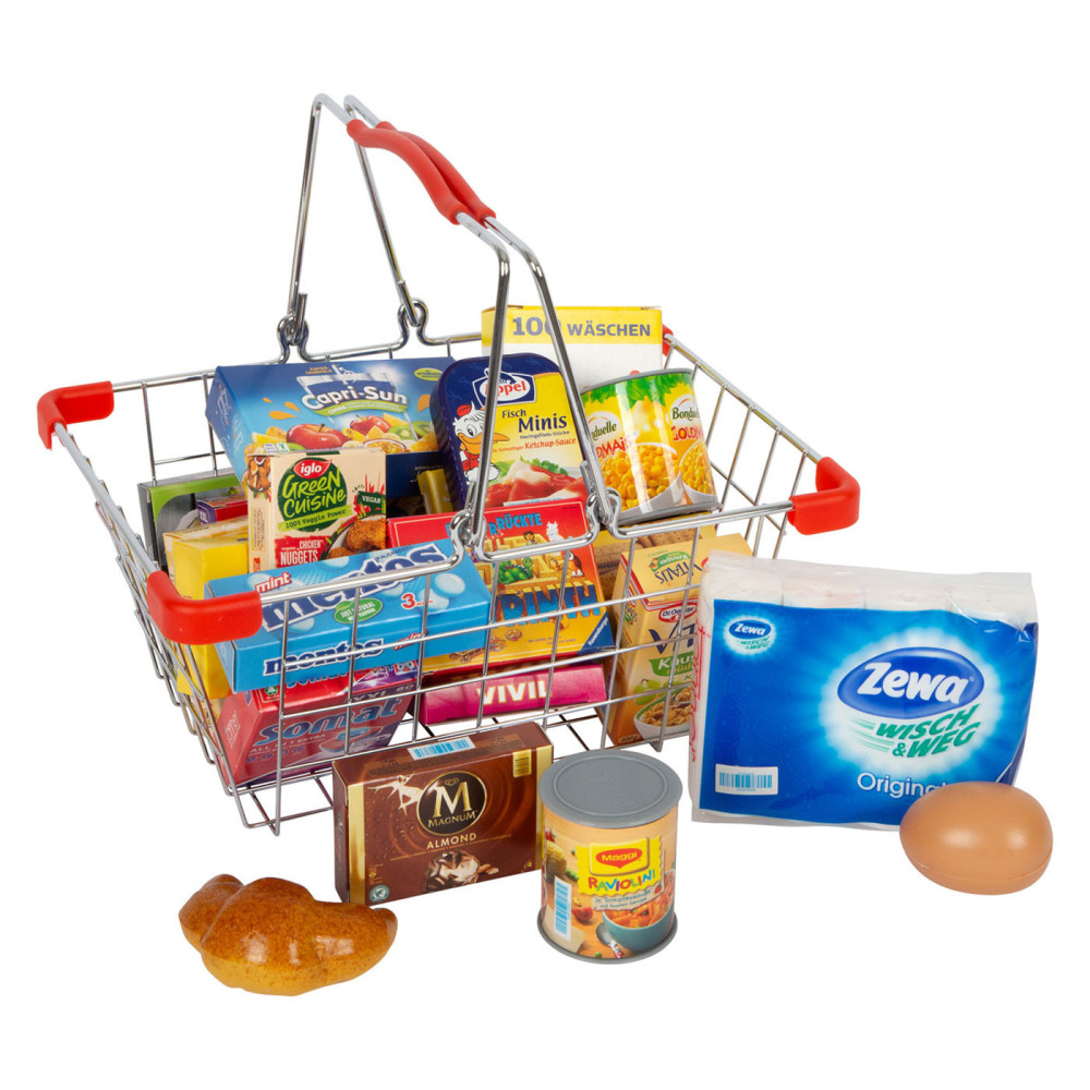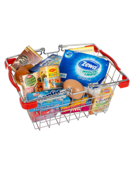 Lekker handig: deze boodschappenmand kan met veel supermarktartikelen worden gevuld, of het nu gaat om bekende merken in miniatuur of “verse” levensmiddelen in plastic - winkelplezier is inbegrepen! Deze kleurrijke collectie is een mooie aanvulling voor onze speelgoedwinkels en inspireert tot leuke rollenspellen. Inhoud variabele.
