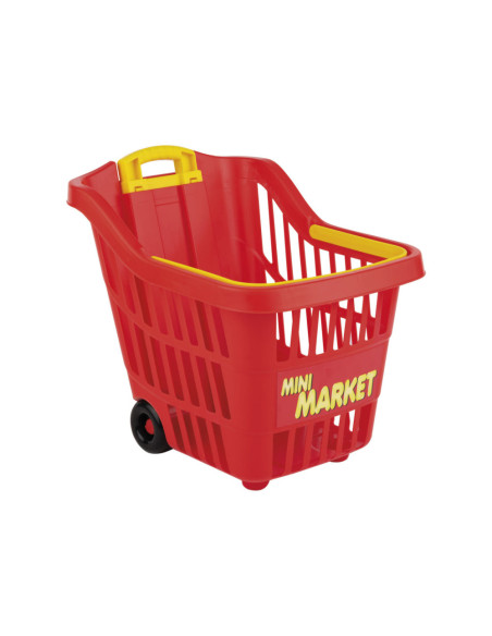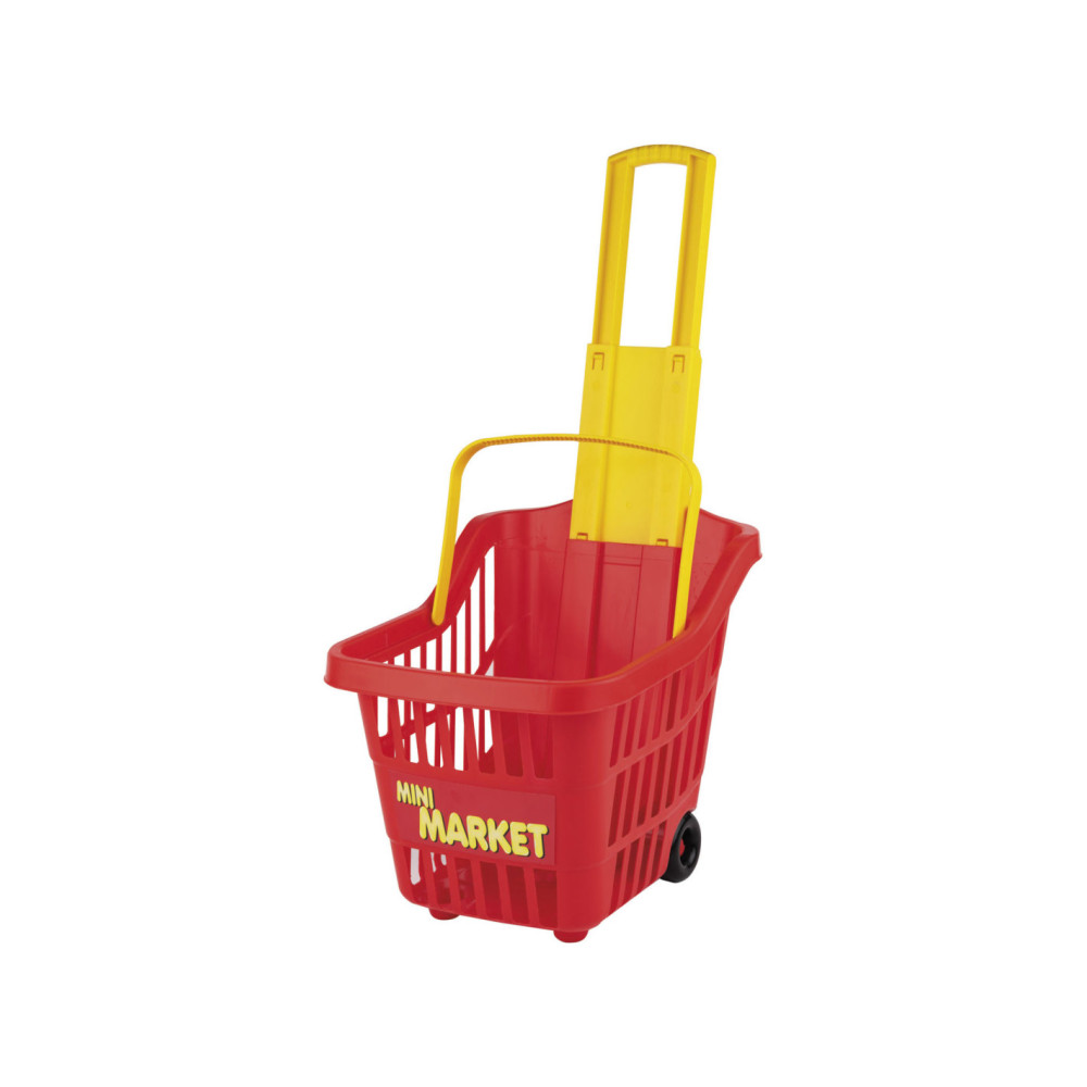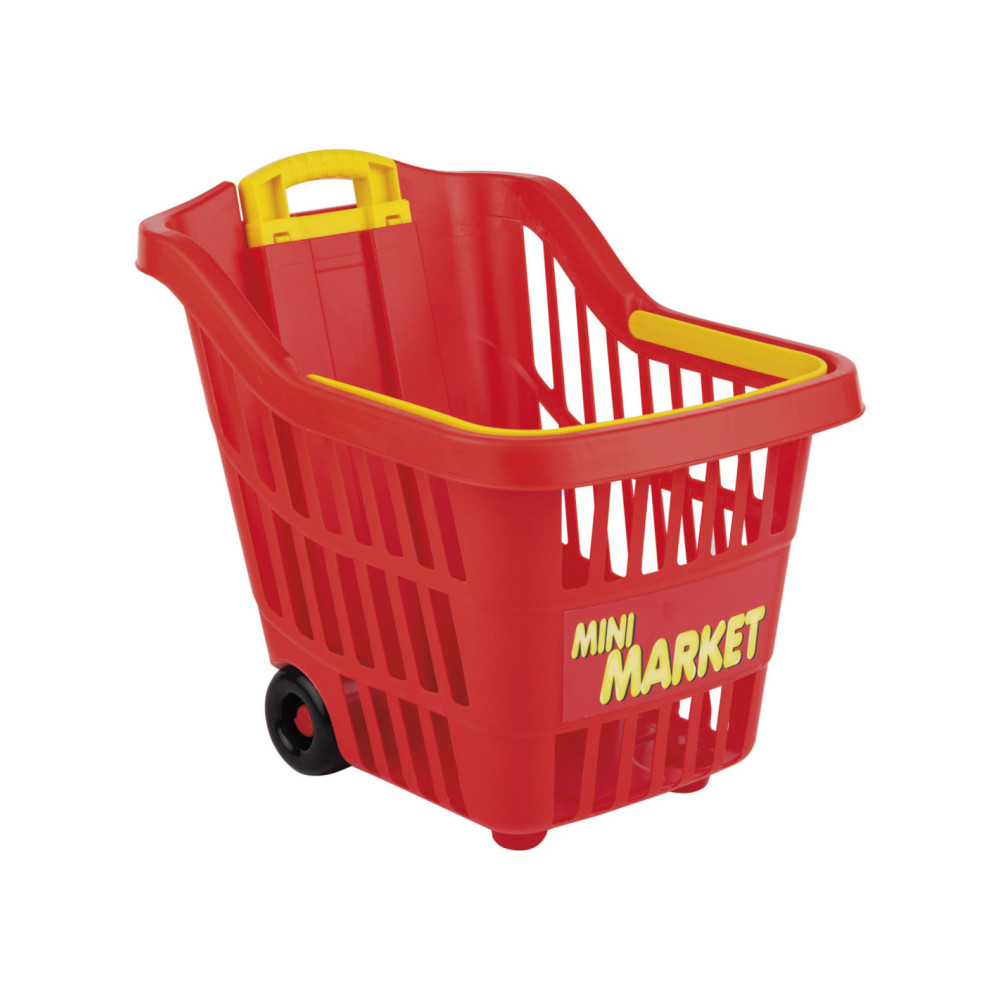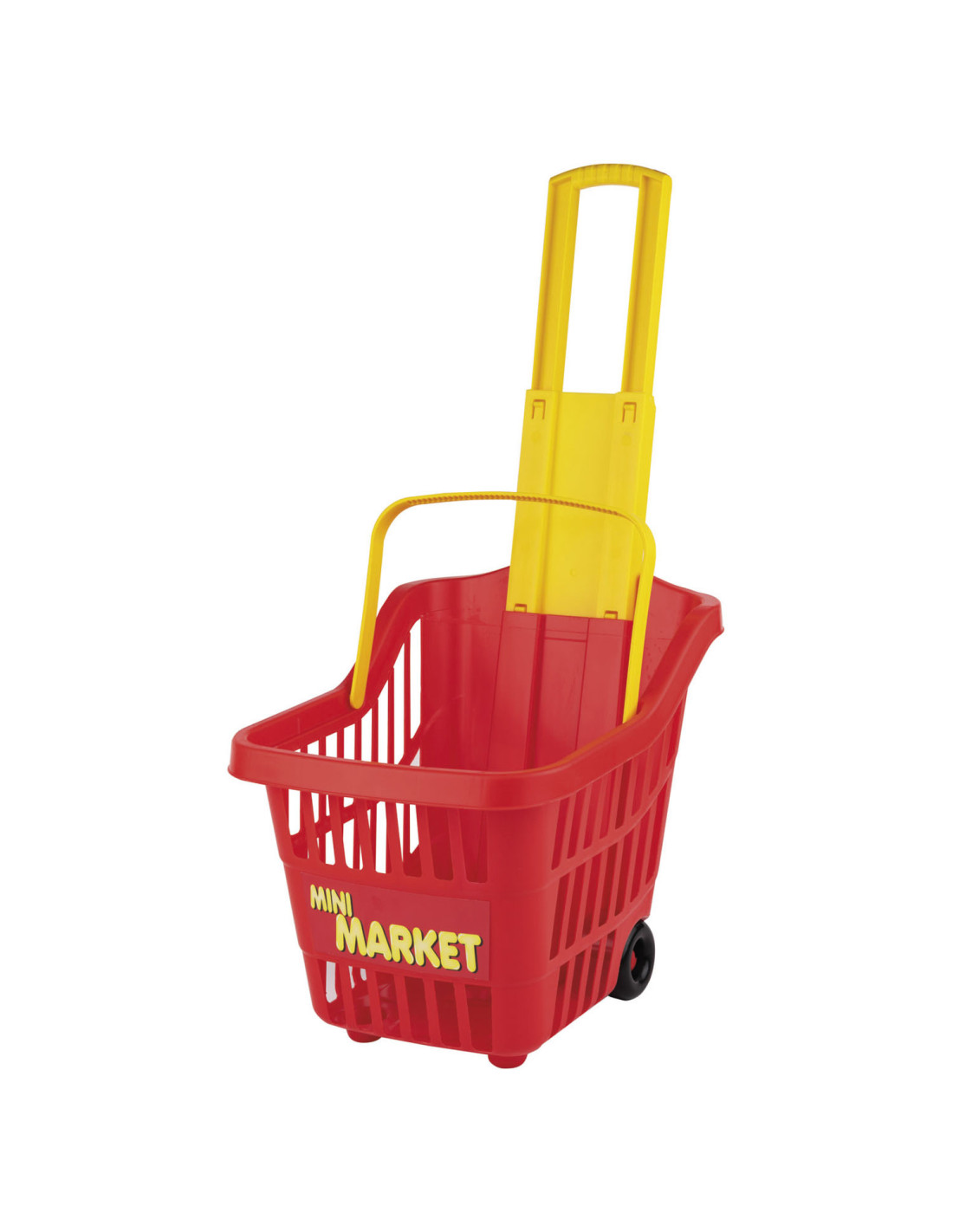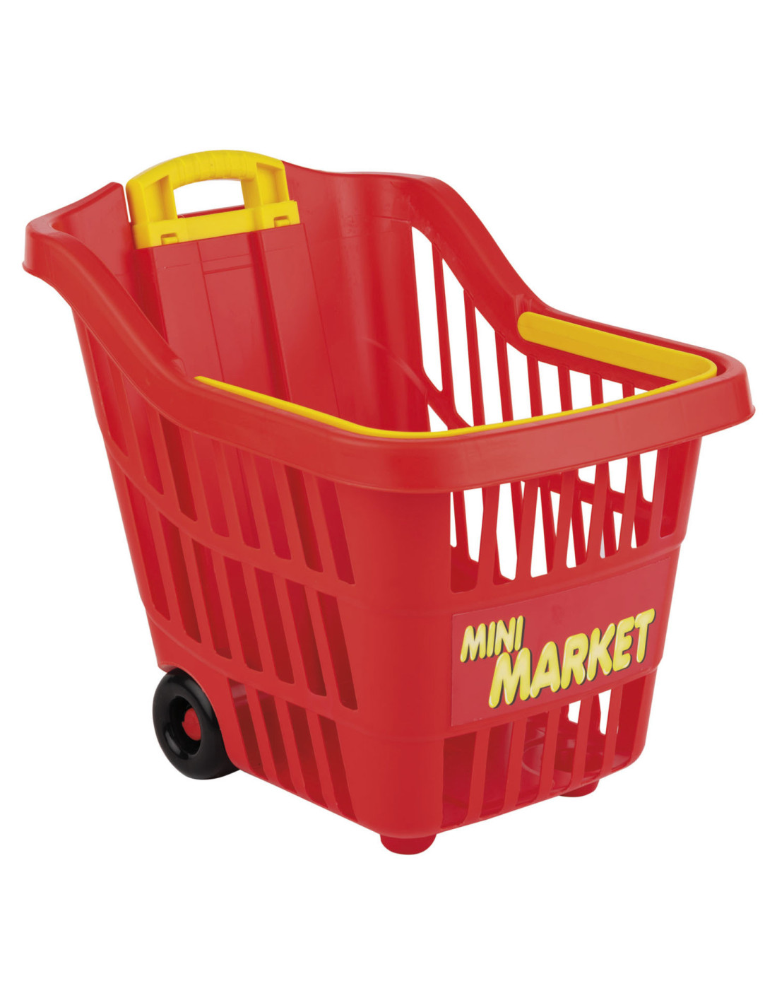 Een trolley of winkelwagen is onmisbaar bij het boodschappen doen. Deze kunststof winkel trolley heeft geel/rode kleuren en is bedrukt met de tekst 'mini market'. De trolley is stapelbaar en heeft een intrekbare handgreep. Dankzij de wieltjes trek je de trolley makkelijk achter je aan.