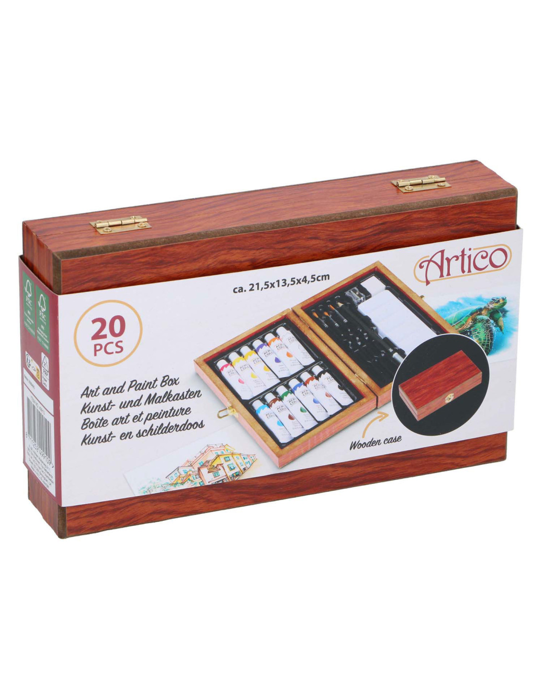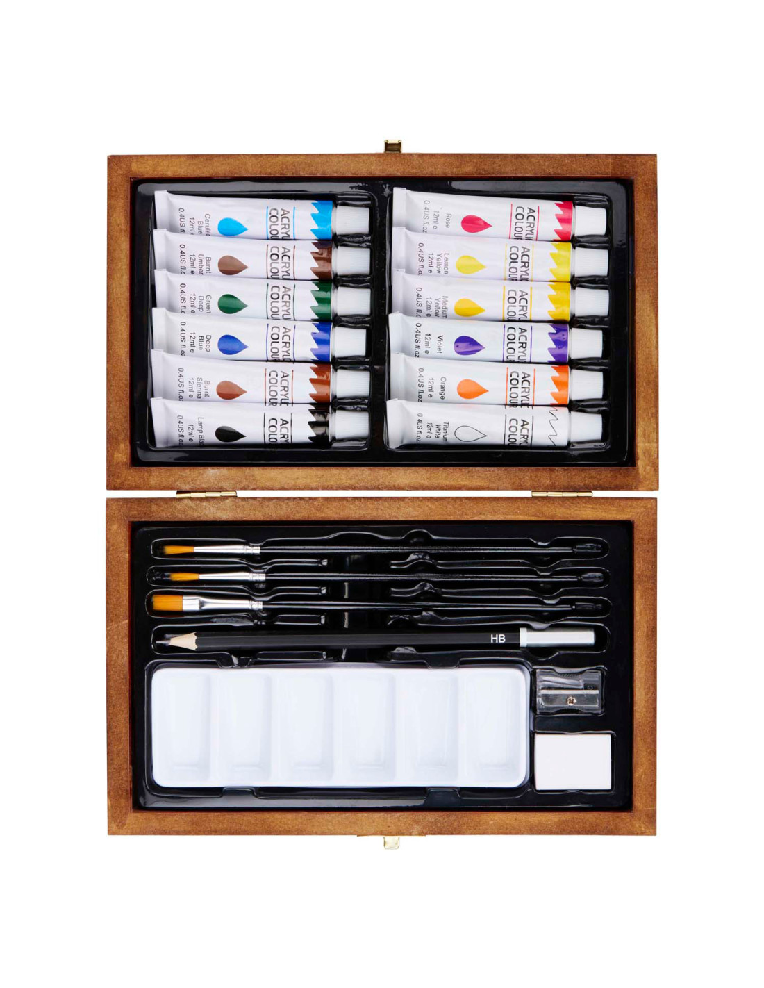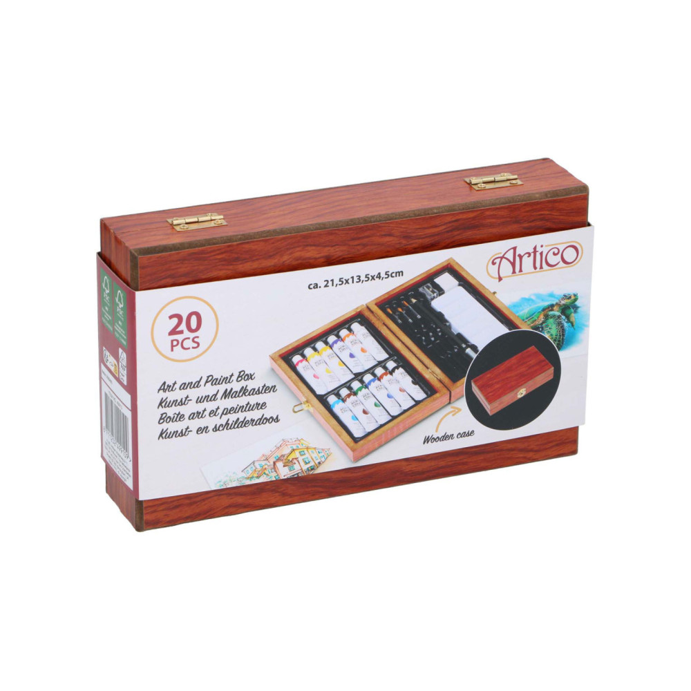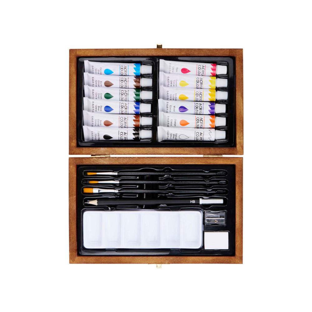 20-delige kunst- en schilderdoos. De set bevat 12 verschillenden kleuren acrylverf.