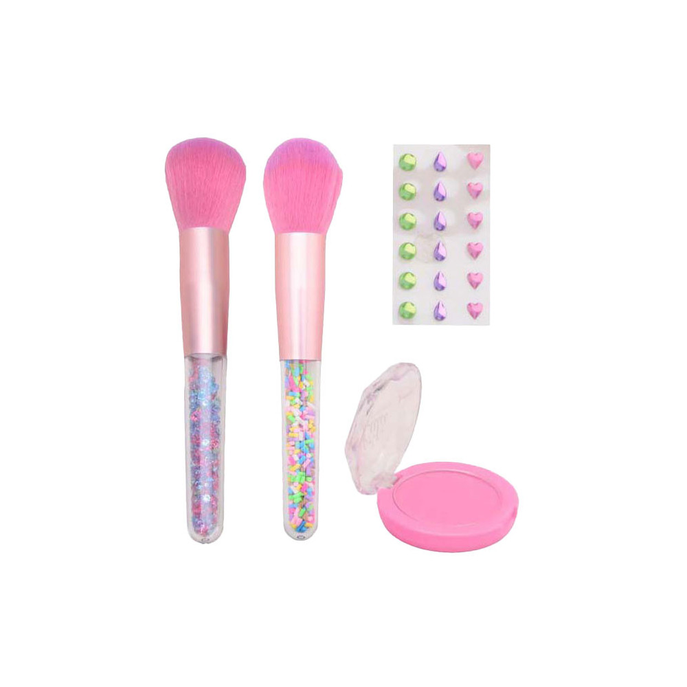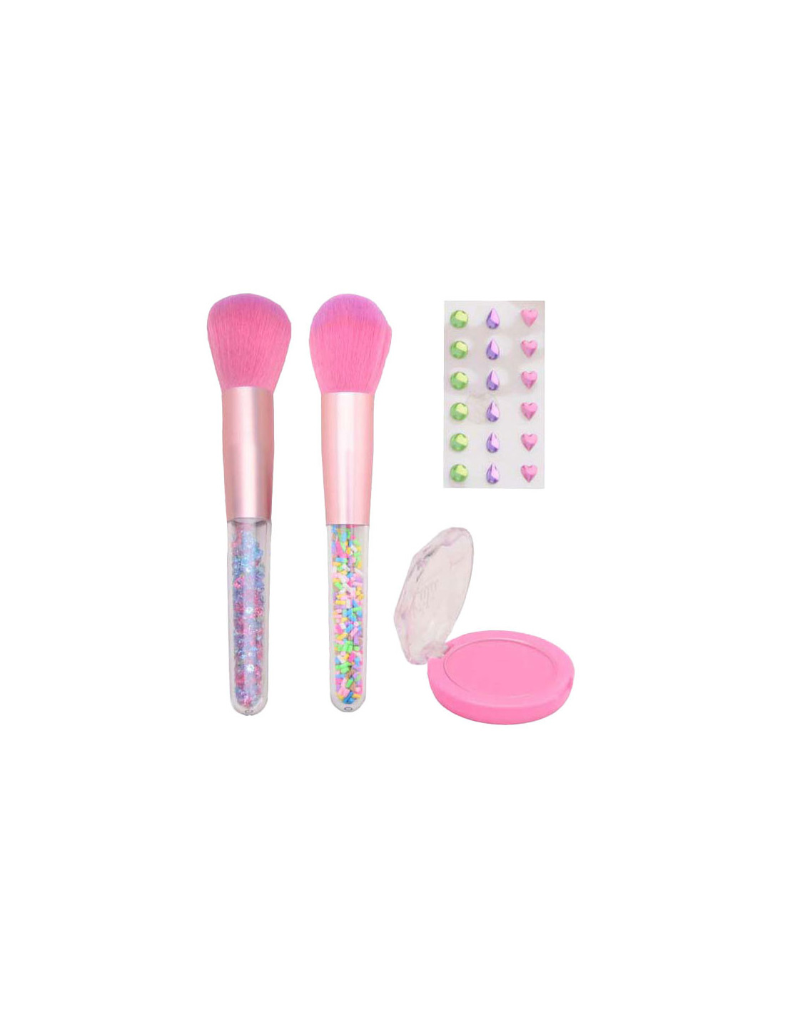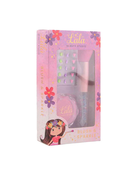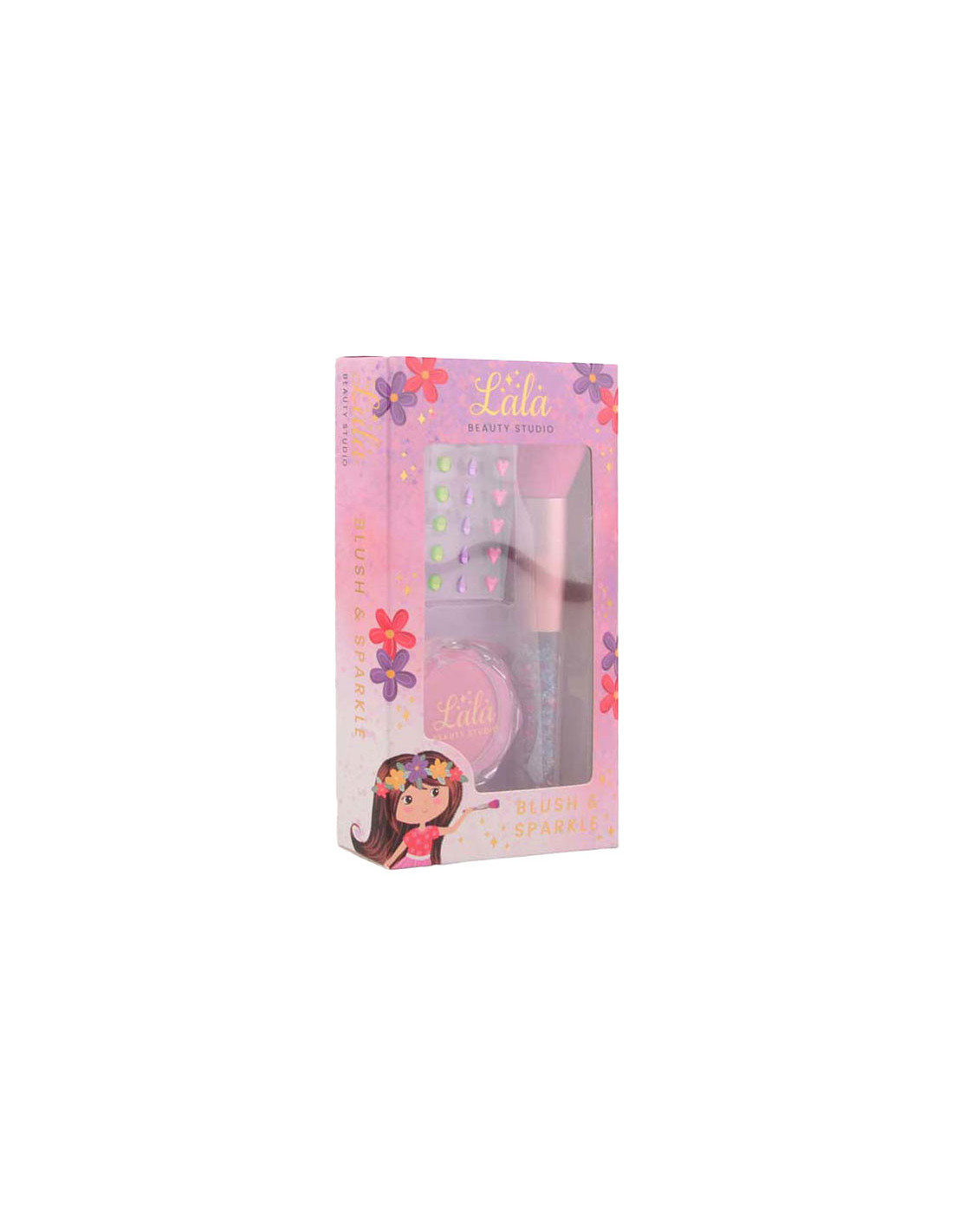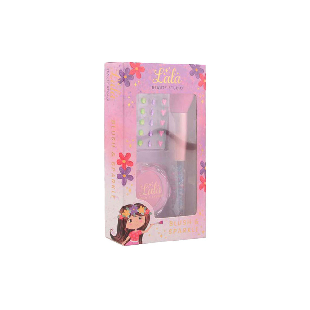 LaLa Beauty Studio - Blush en Sparkle Make-upset met Stickers. Inhoud: 1x roze blush, 1x velletje nagelstickers en 1x poederkwast. Afmetingen: 10 x 3 x 18 centimeter.