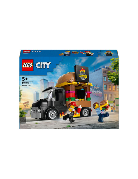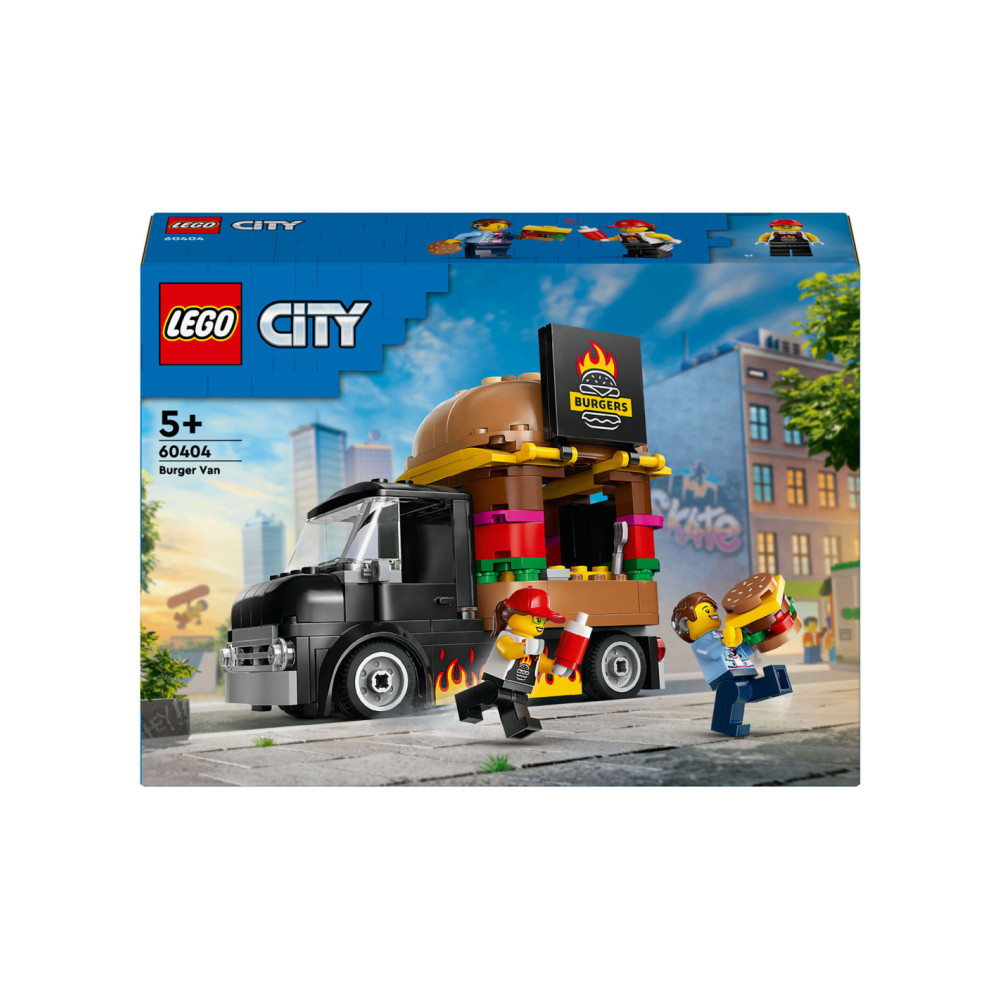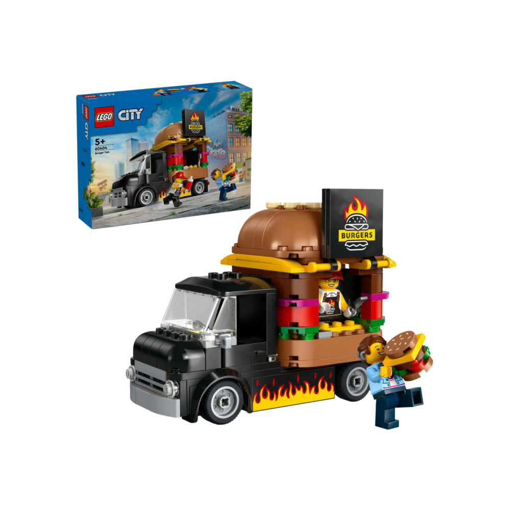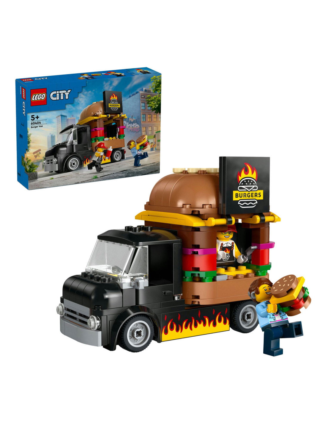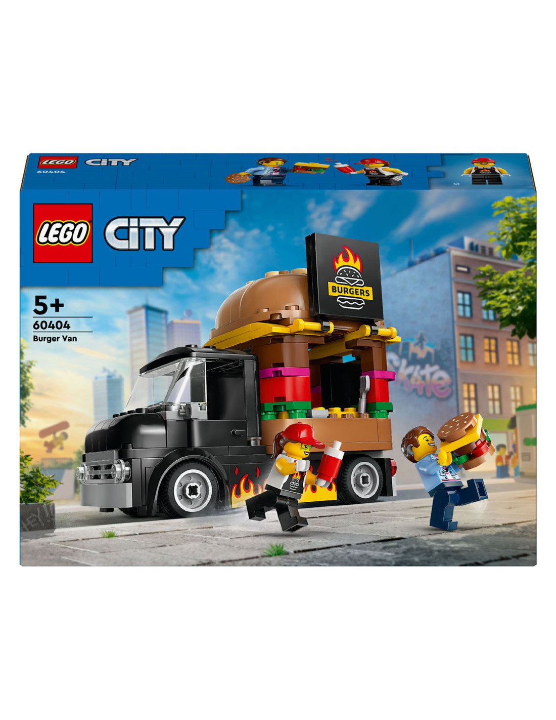 Deze LEGO City Hamburgertruck (60404) voor kinderen vanaf 5 jaar is een traktatie voor de jonge fantasie. Het mobiele fastfoodrestaurant ziet eruit als een gigantische burger en kan van de speelgoed vrachtwagen worden losgemaakt. Inclusief een keukengedeelte, sausflessen en een serviceluik dat open kan om een uithangbord te laten verschijnen. Deze keukenset bevat ook minifiguren van een verkoper en een klant met een gehoorapparaat, plus accessoires, zoals speelgoed eten.In de doos van dit LEGO truck speelgoed vind je bouwinstructies. Of gebruik de LEGO Builder app waar kinderen sets kunnen ontdekken en opslaan, hun bouwvoortgang kunnen bijhouden en kunnen zoomen en draaien om modellen vanuit alle hoeken te bekijken terwijl ze bouwen.Met LEGO City sets beleven kinderen volop actie met realistische modellen en leuke personages die fantasierijk speelplezier stimuleren. De sets zijn leuk om cadeau te geven en kunnen worden gecombineerd (andere sets zijn apart verkrijgbaar) voor een open wereld vol speelmogelijkheden. Een leuk cadeau voor jongens en meisjes vanaf 5 jaar die van LEGO voertuigen houden.Afmetingen: met het uithangbord omhoog is deze hamburgertruck ca. 10 cm hoog, 12 cm lang en 7 cm breed.Bevat 194 onderdelen.